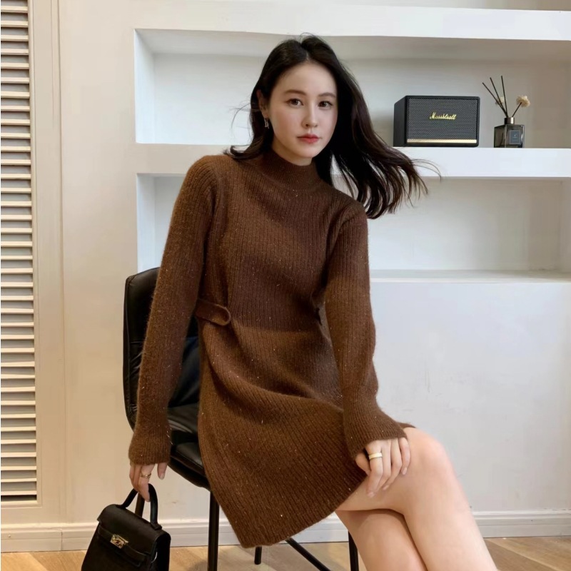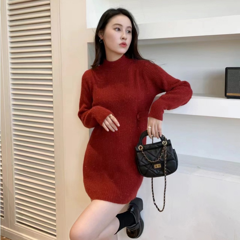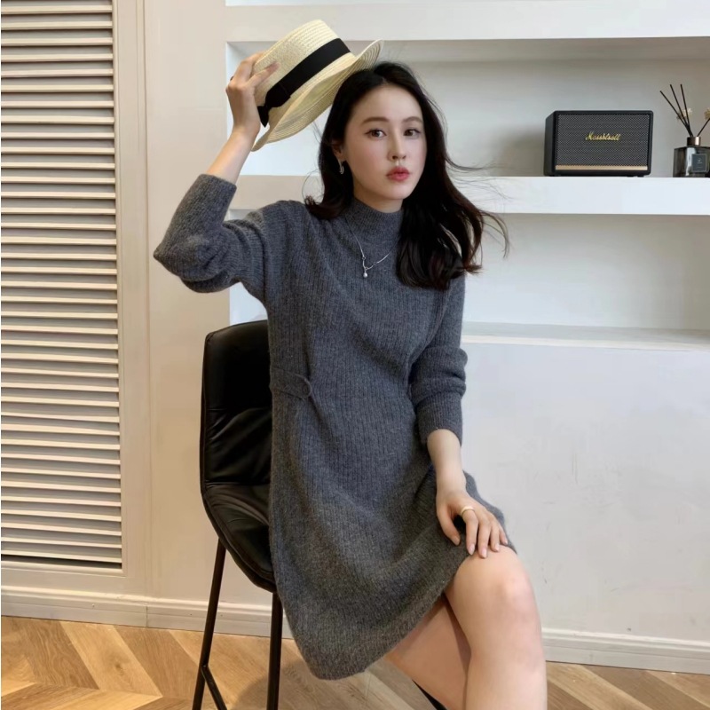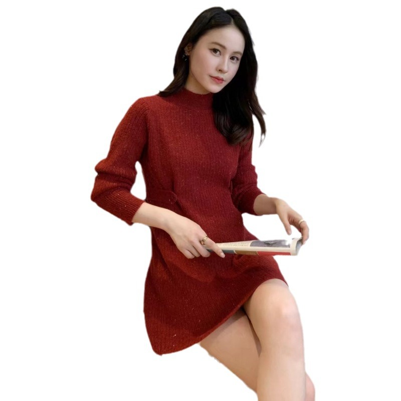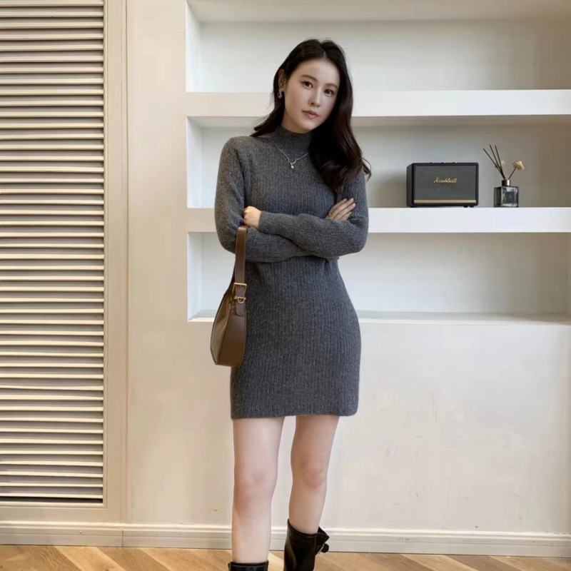 温柔风半高领毛衣裙女2024秋冬短款配大衣内搭打底衫女针织连衣裙