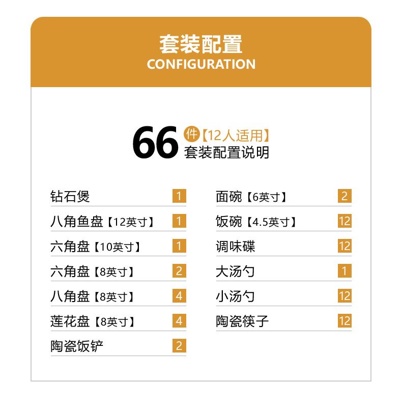 | 12-person food luxury special-shaped 66-piece set(12人食奢华异形66件套) | USD $91.84 | 99999 piece available |