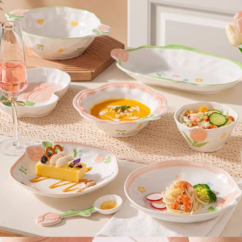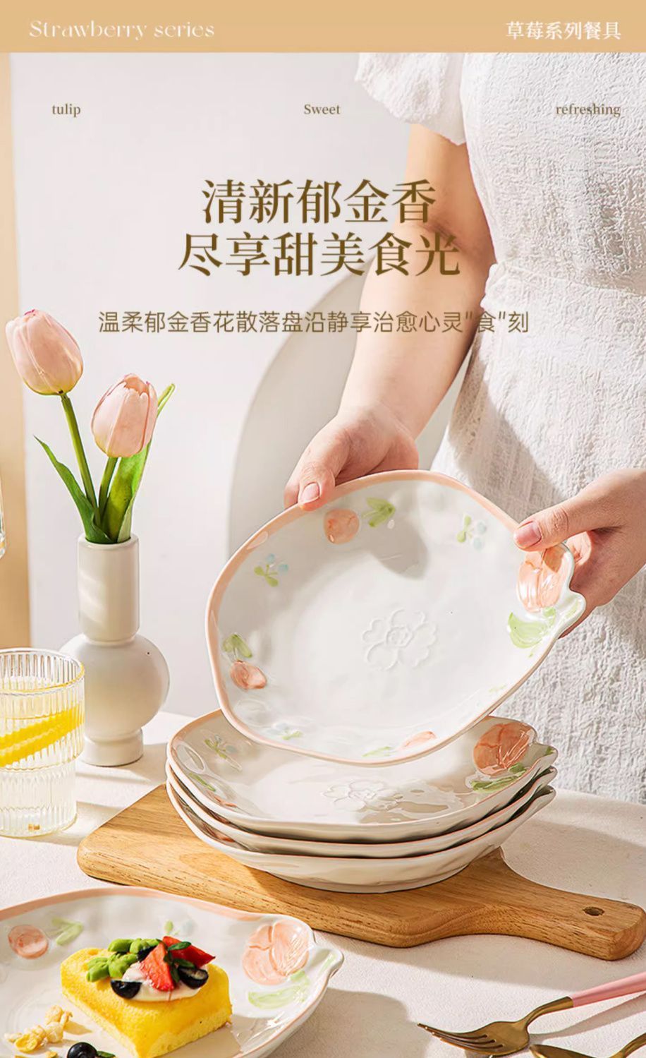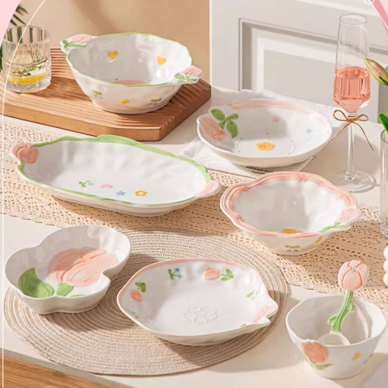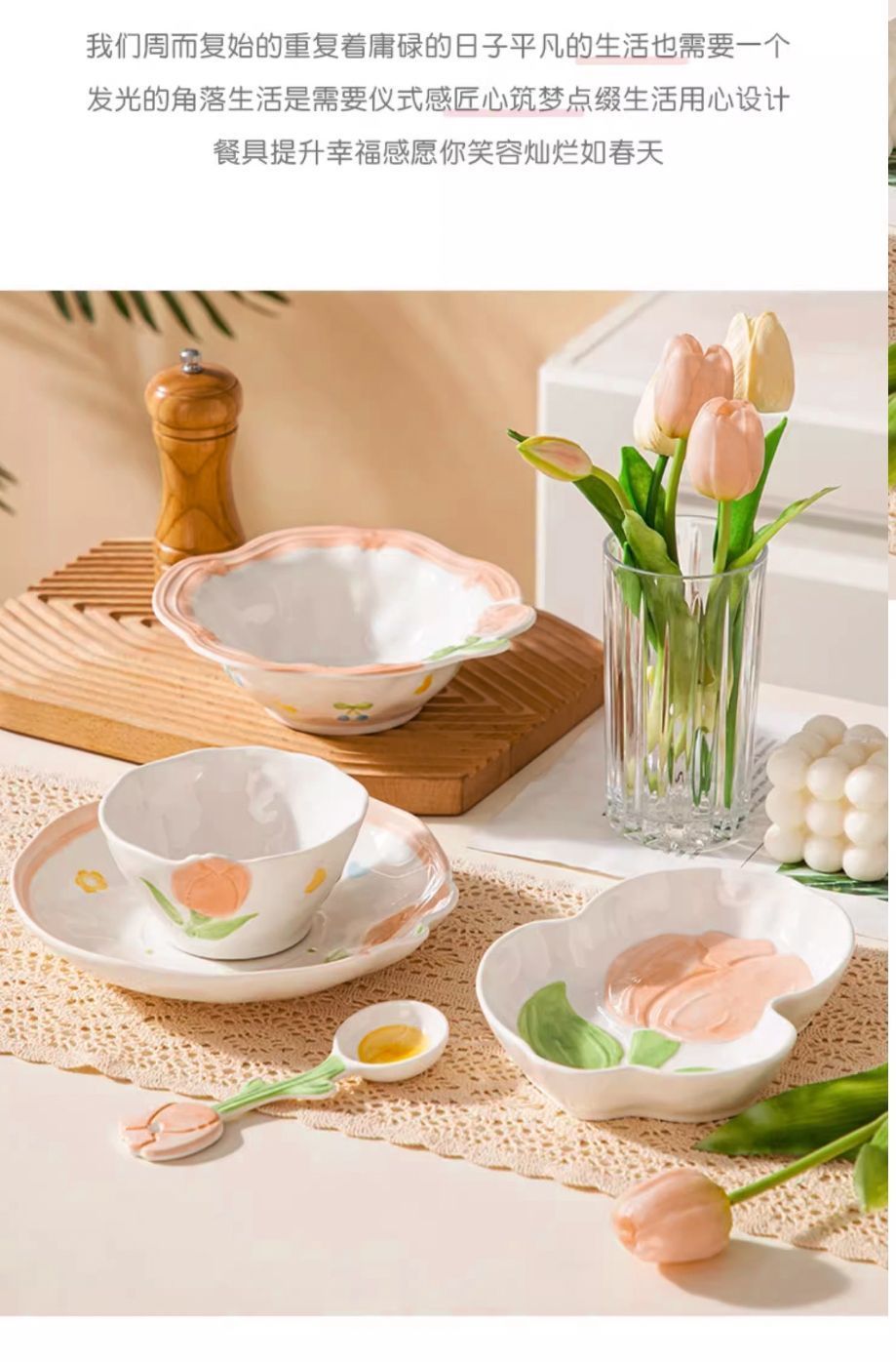 2024新款浮雕郁金香釉下彩陶瓷餐具碗盘家用套装碗碟组合菜盘碗筷