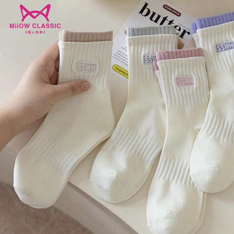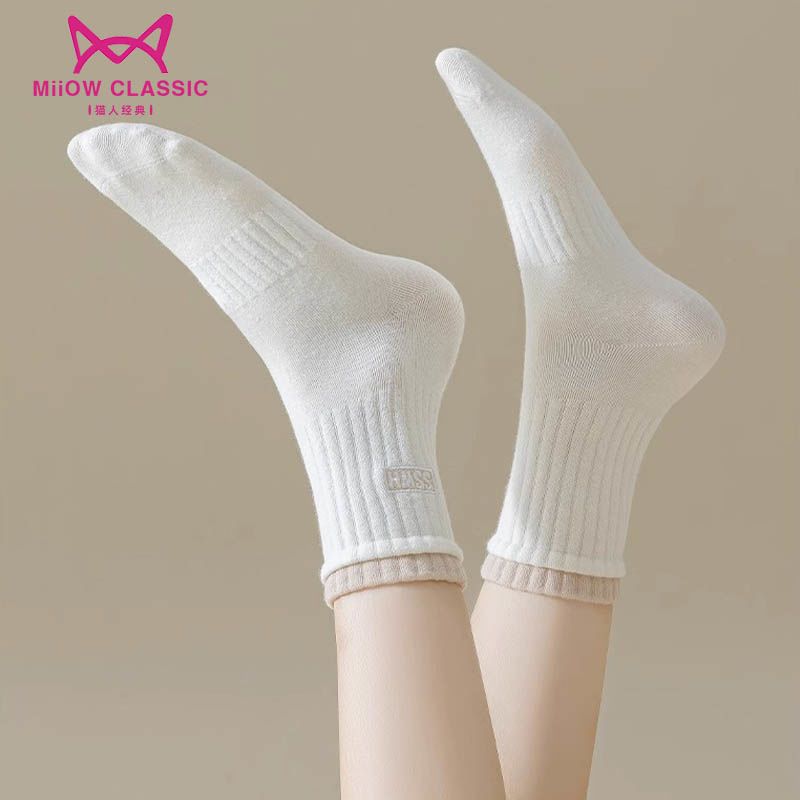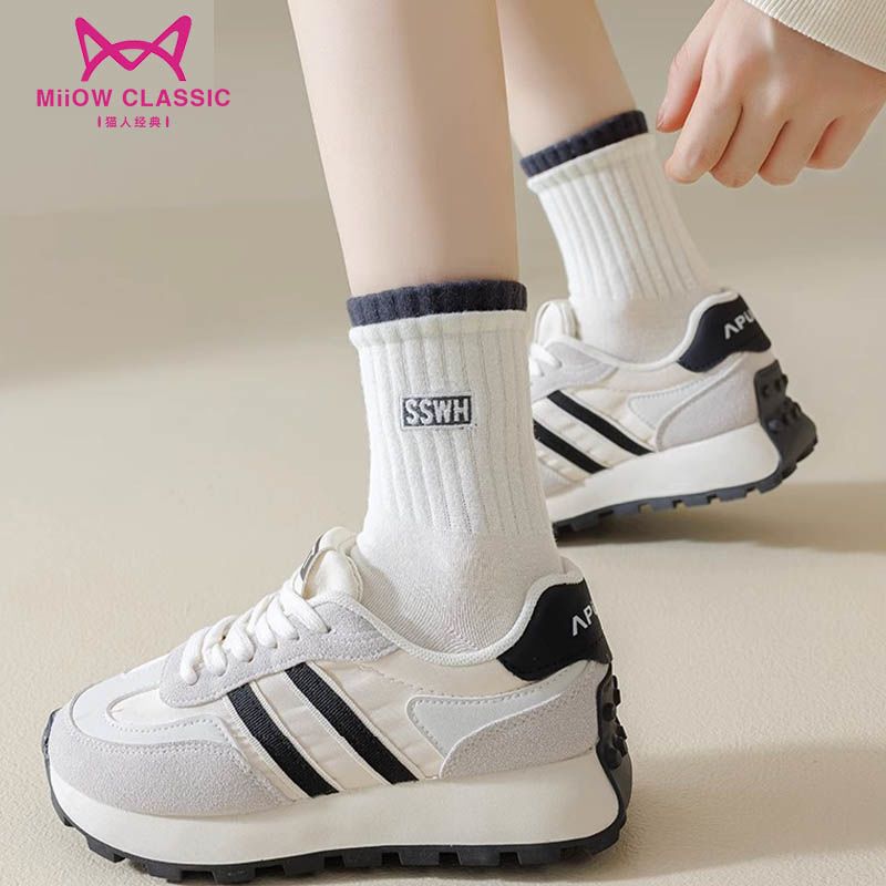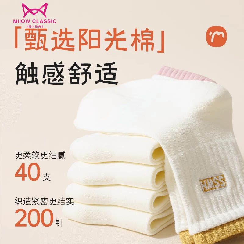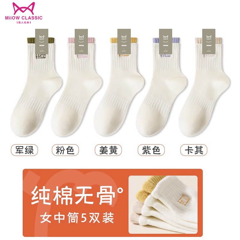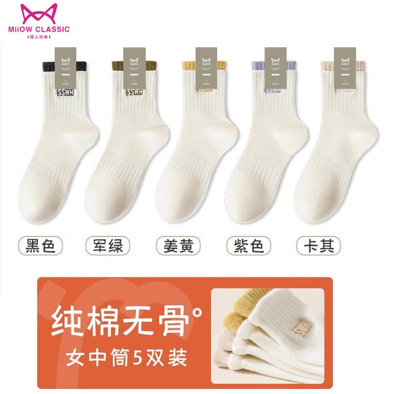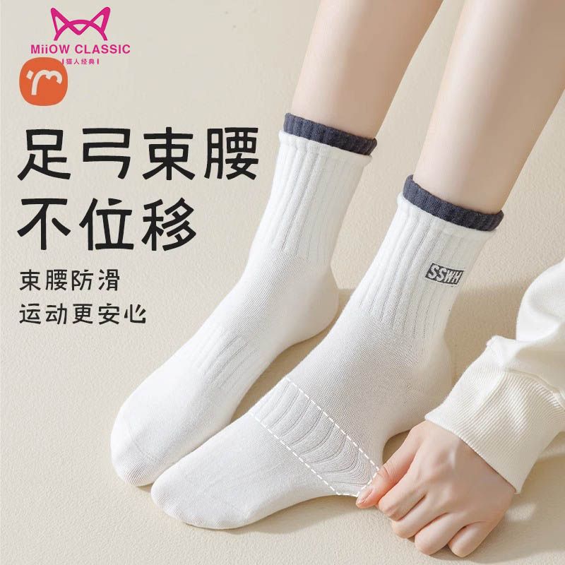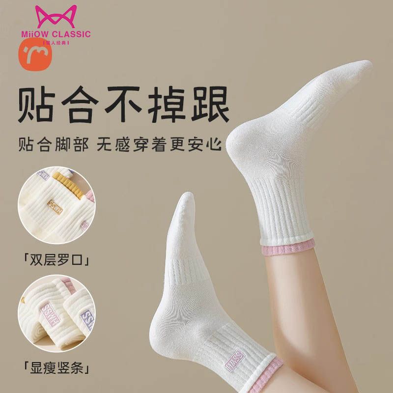 猫人白色无骨袜子女秋冬款纯棉中筒袜防臭百搭运动袜秋季日系棉袜