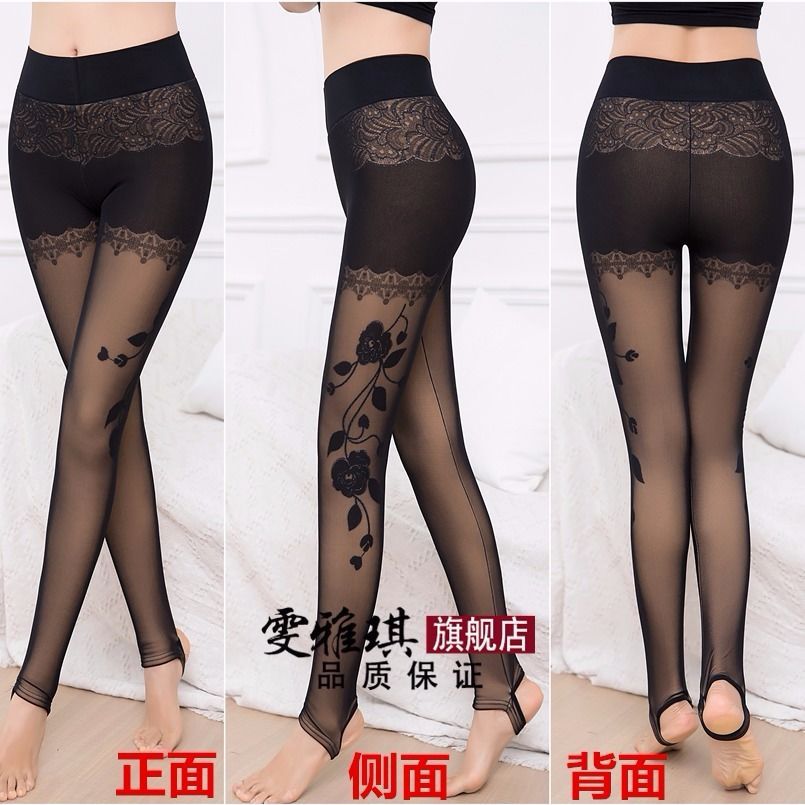 春秋假透肉印花美腿裤大码高腰修身显瘦打底裤防勾丝网纱踩脚裤女