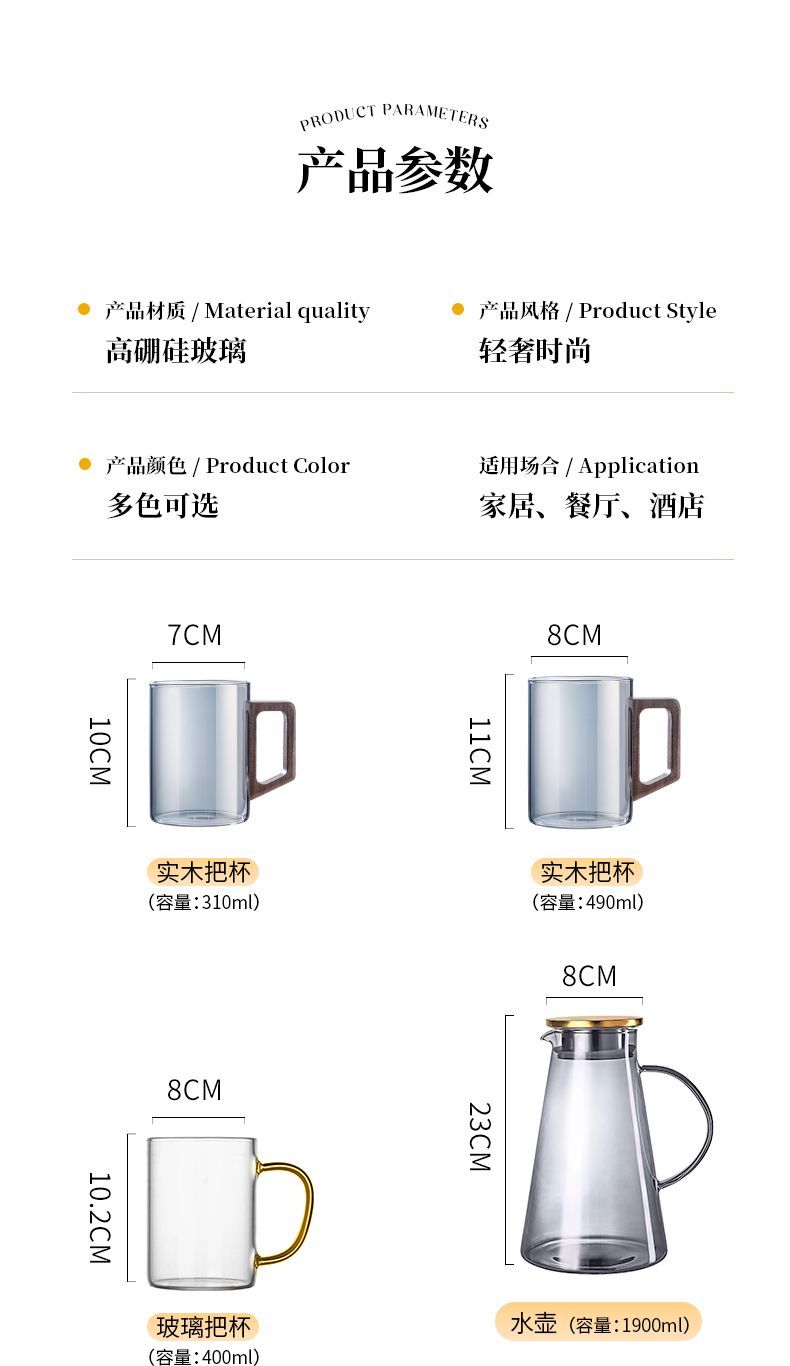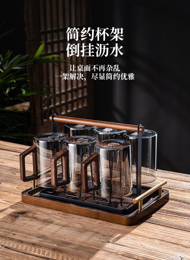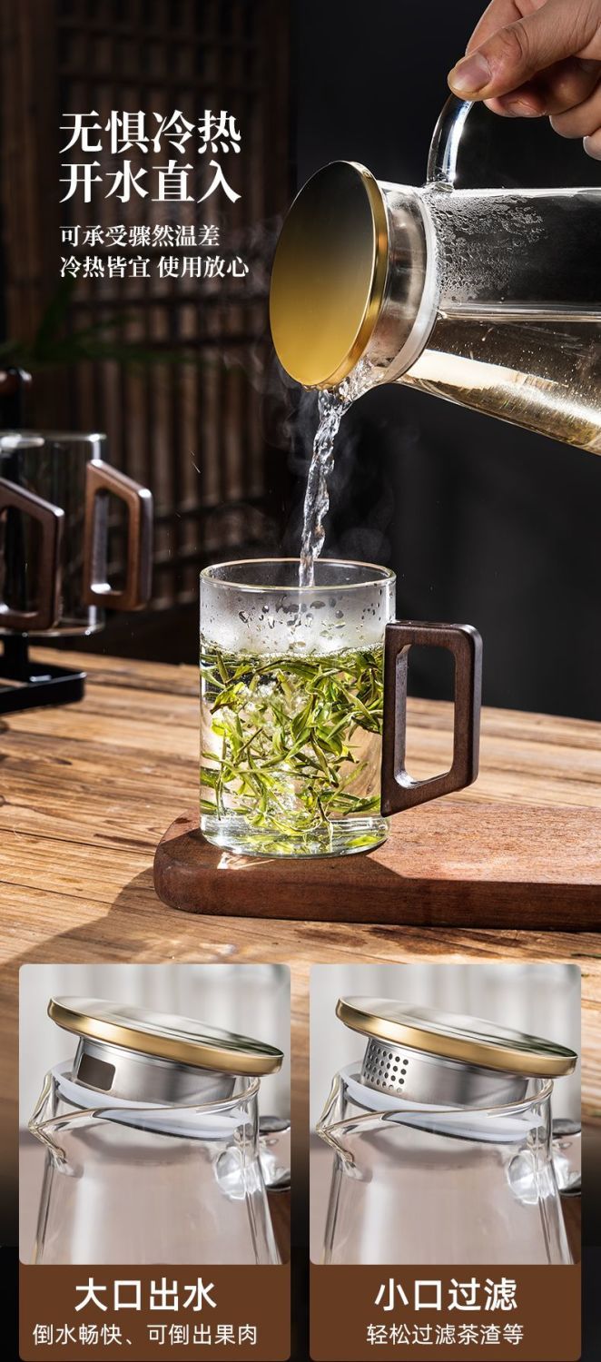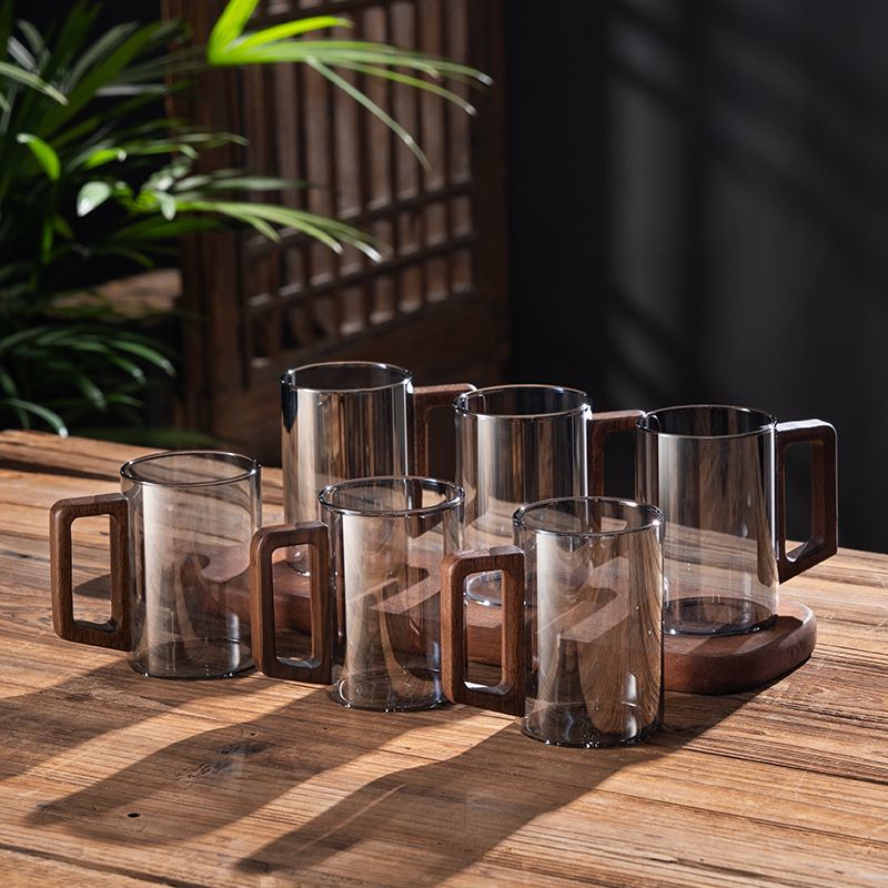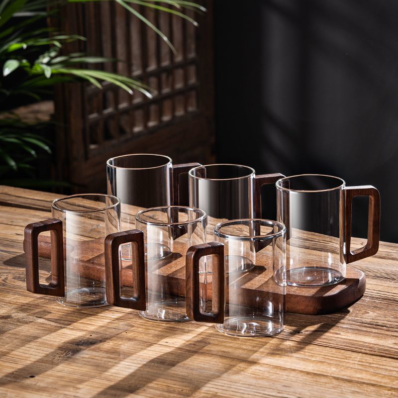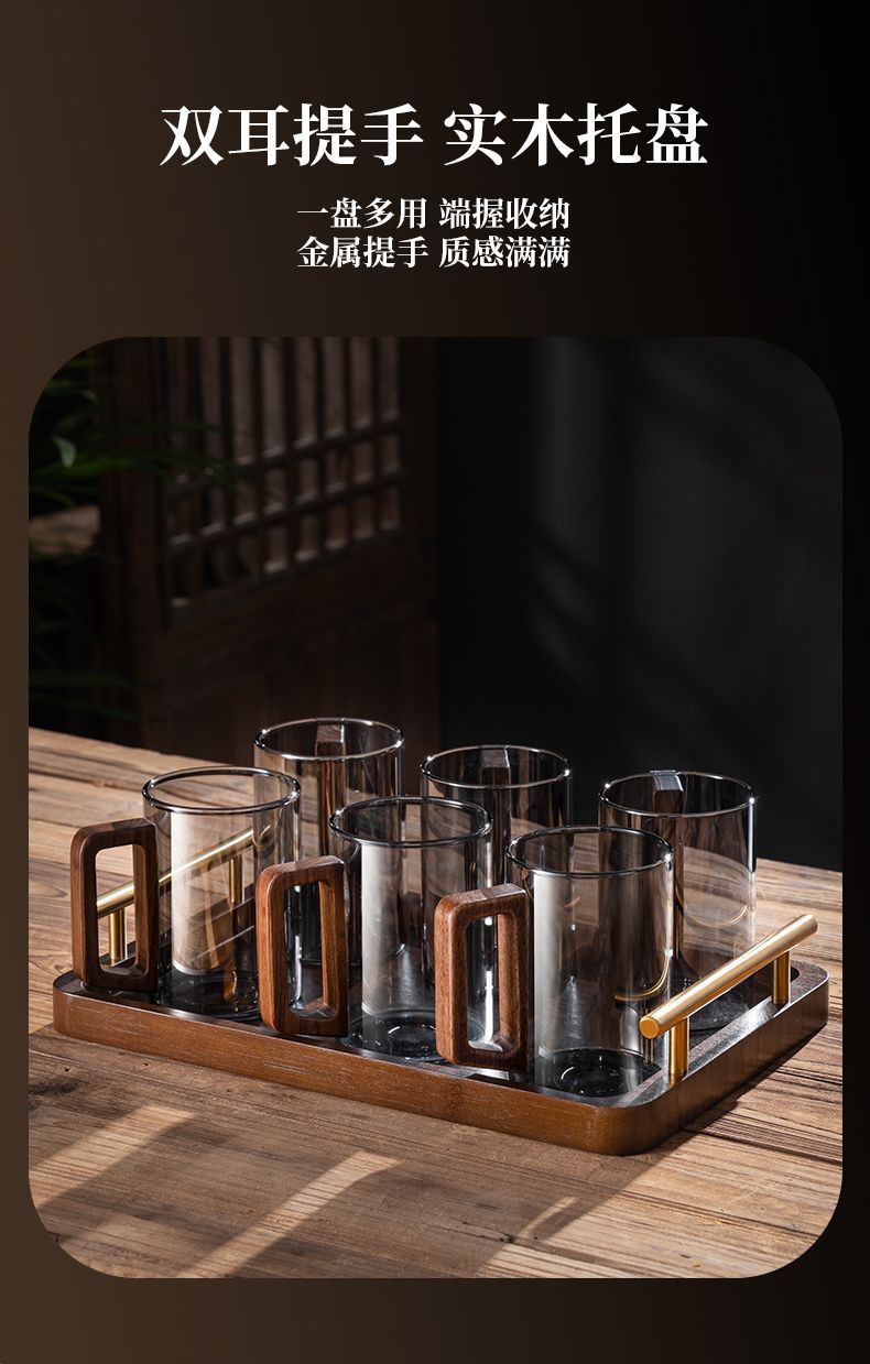 中式玻璃水杯套装家用客厅耐高温茶杯木柄待客杯子冷水壶2024新款