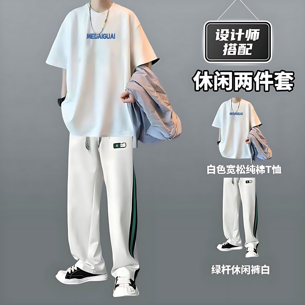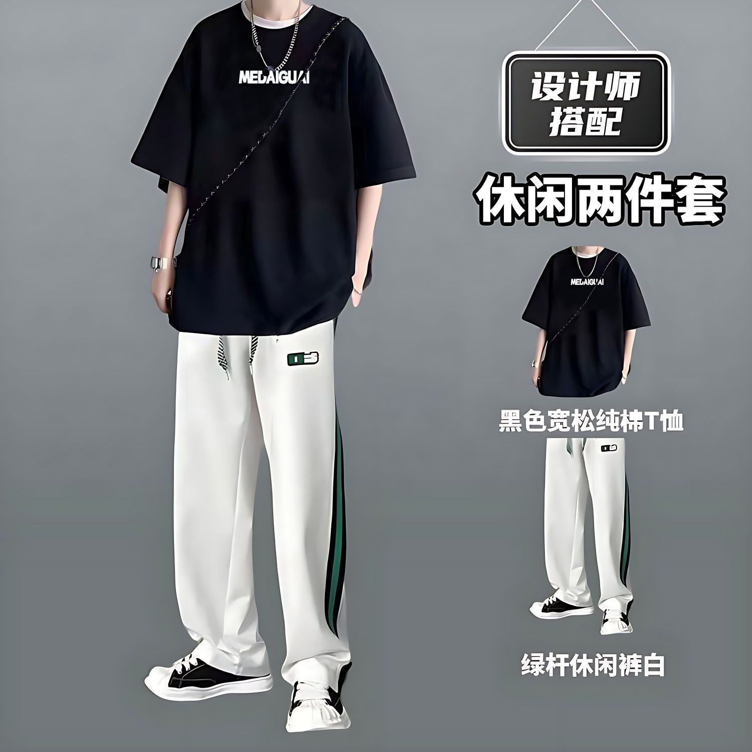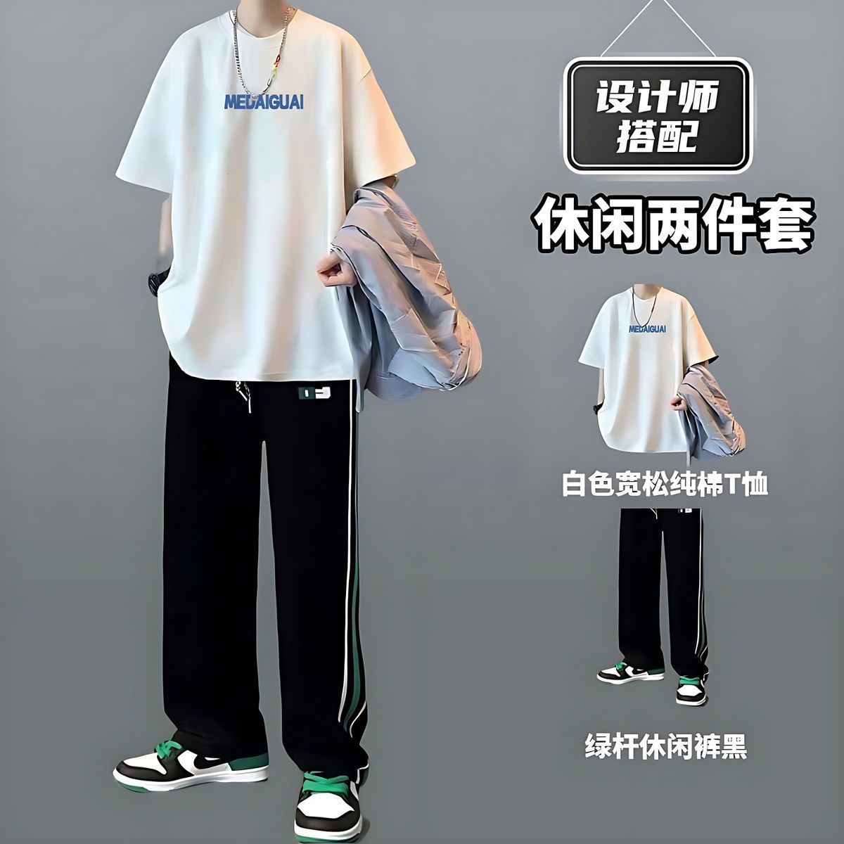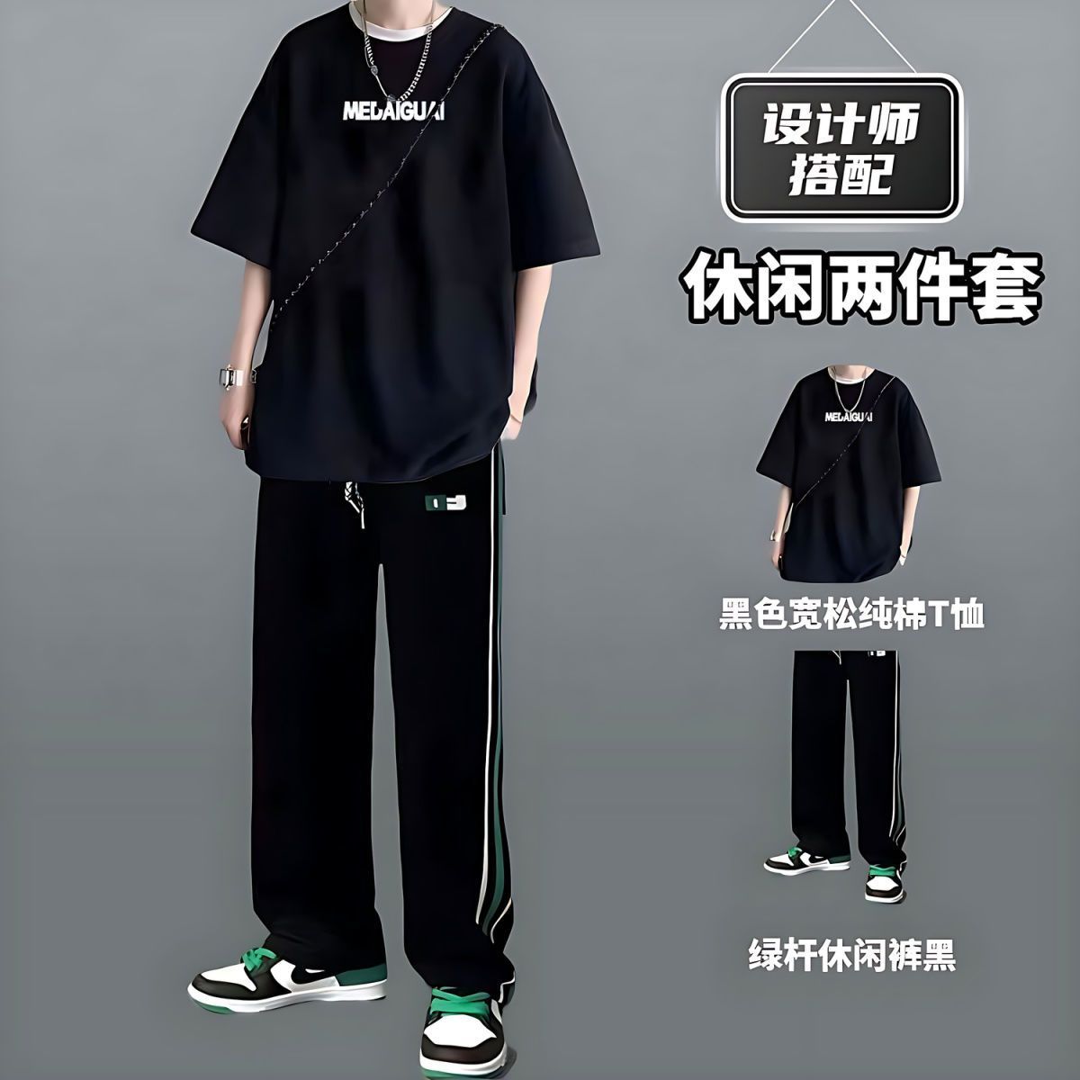 战狼本色重磅纯棉短袖T恤套装夏季新款短袖t恤搭配长裤休闲两件套