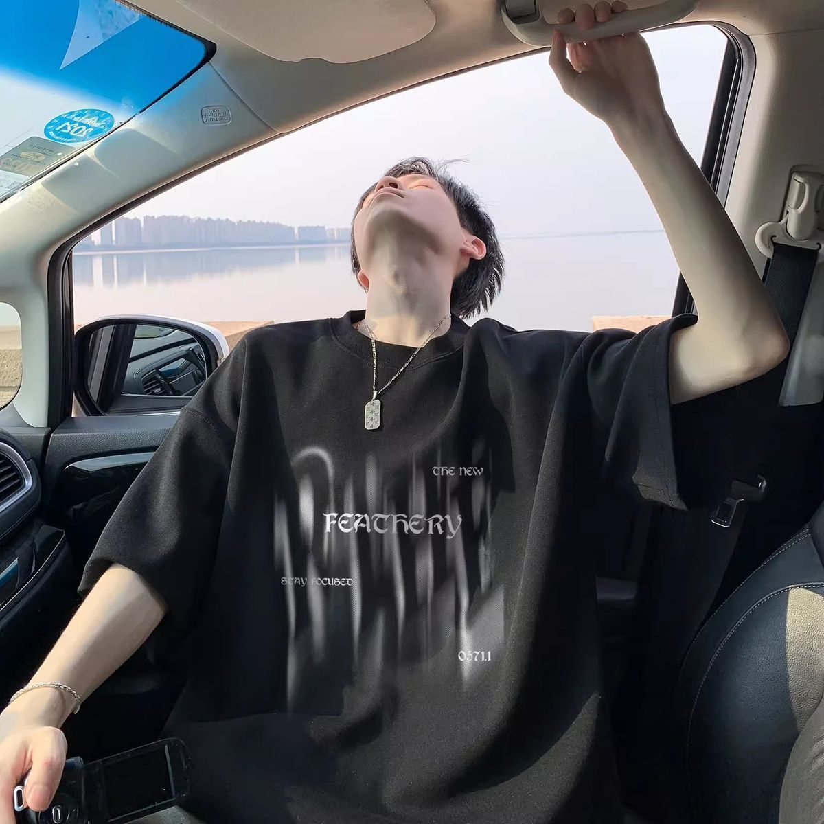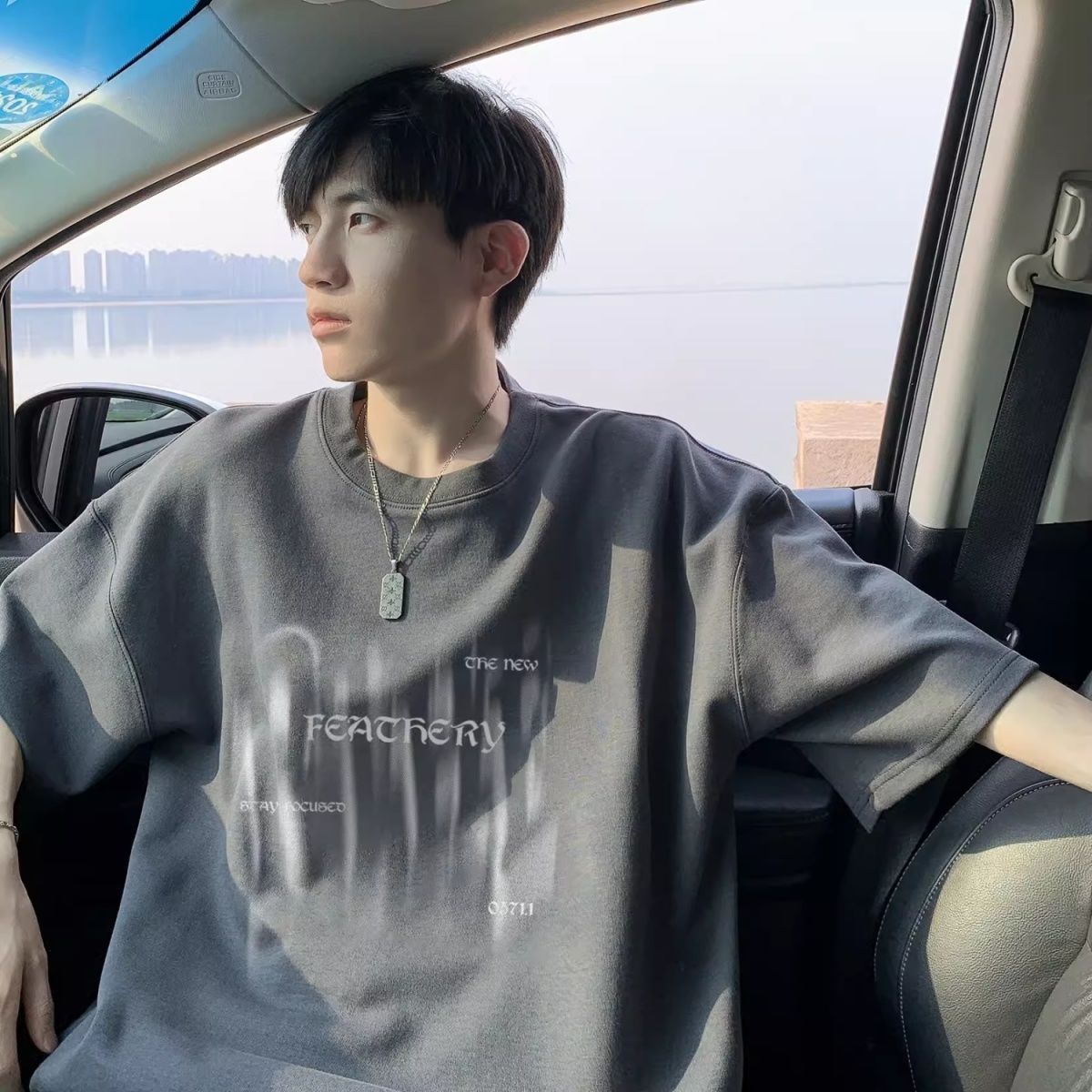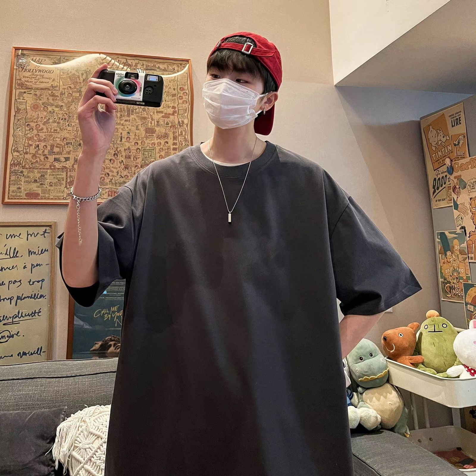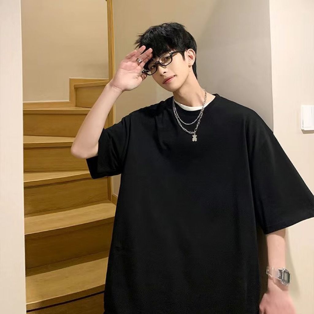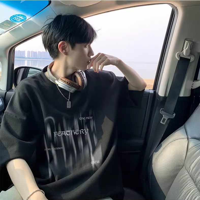 100%纯棉重磅眩晕印花男士短袖t恤夏季青少年百搭oversize=五分袖