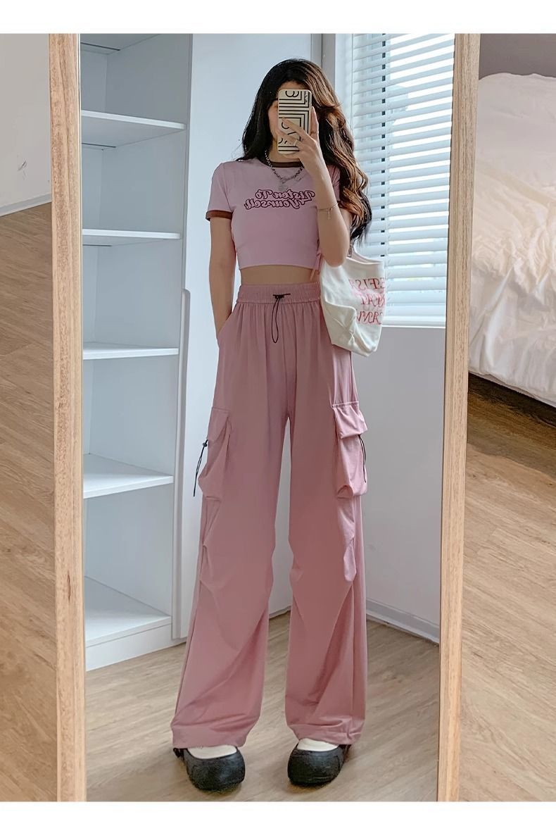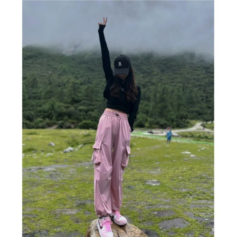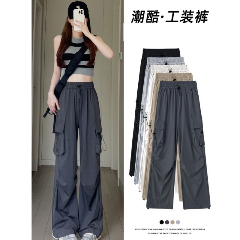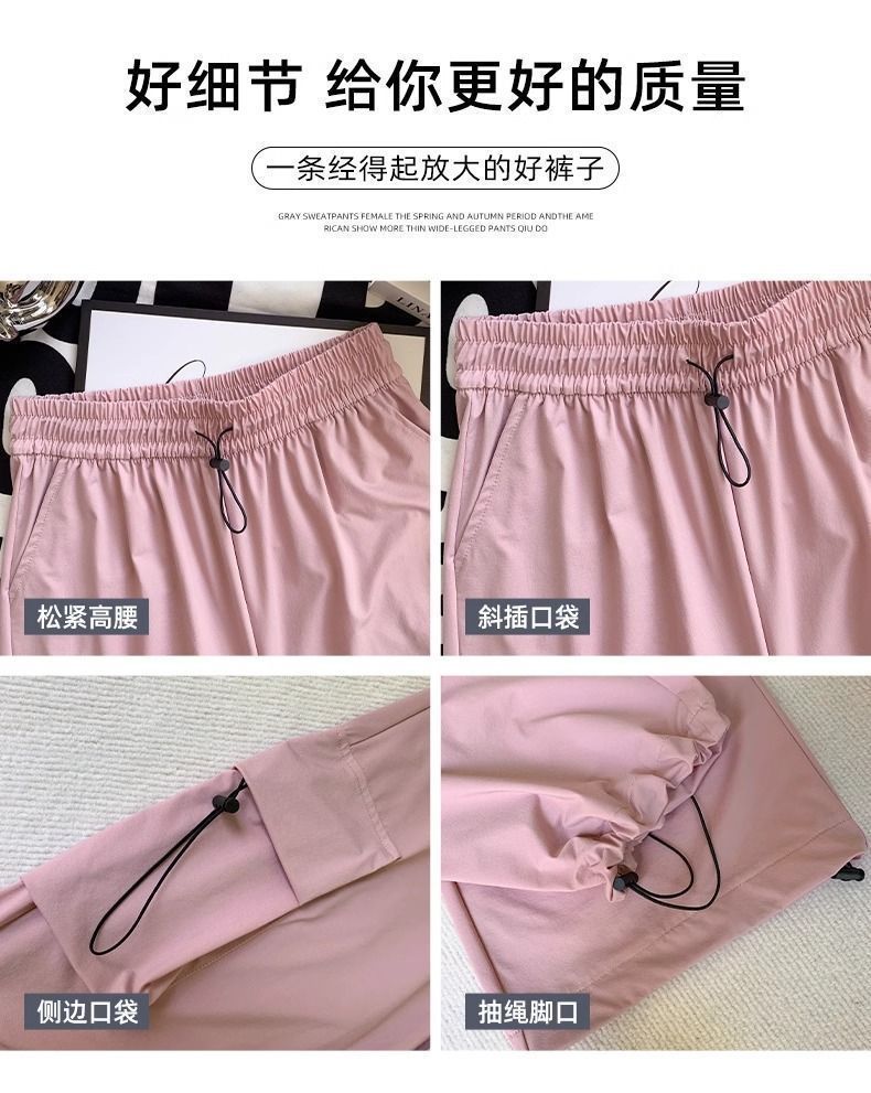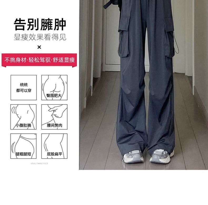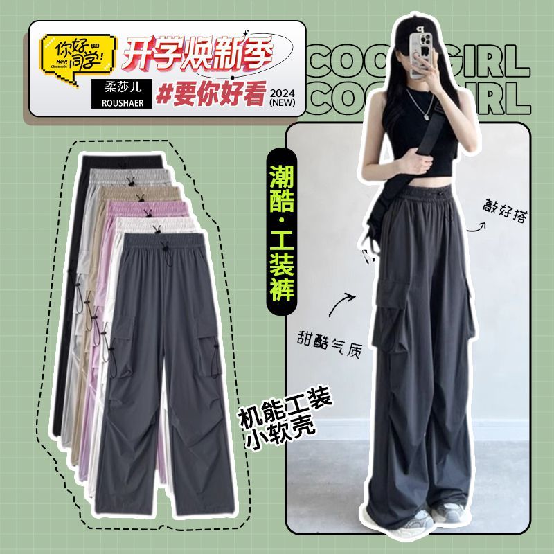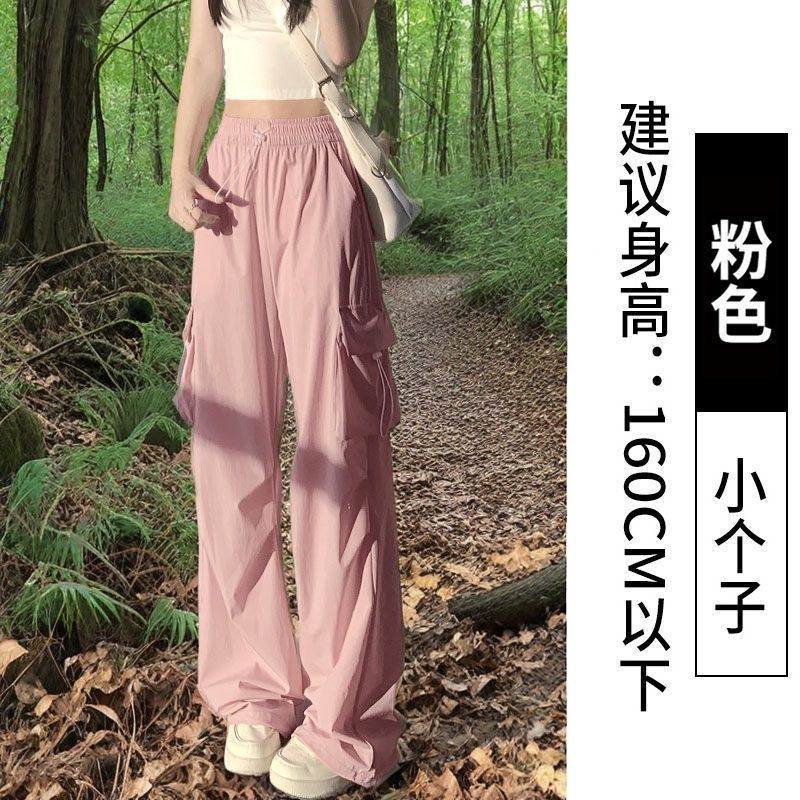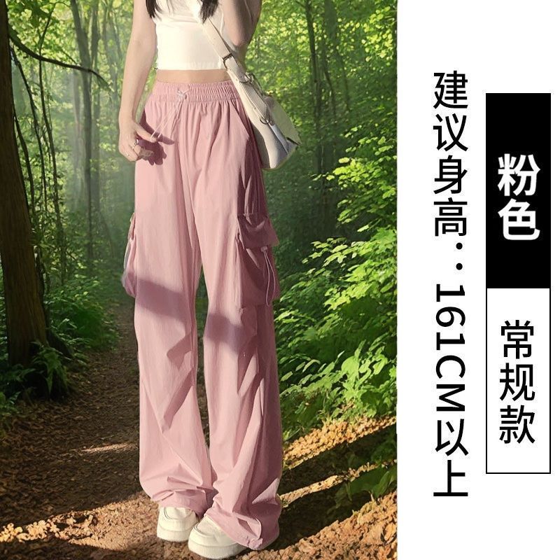 粉色工装裤女秋季2024新款高腰垂感降落伞裤休闲阔腿裤美式运动裤
