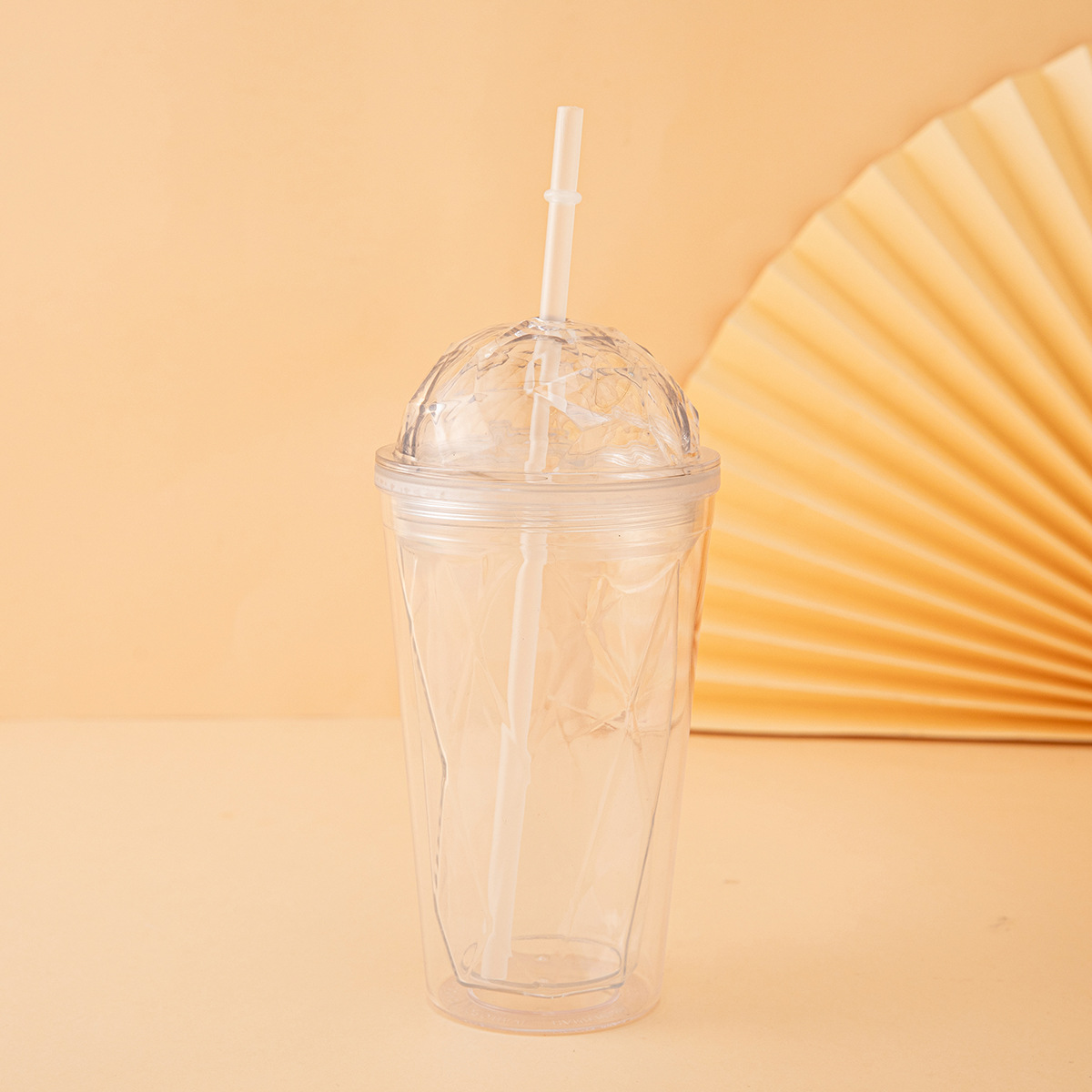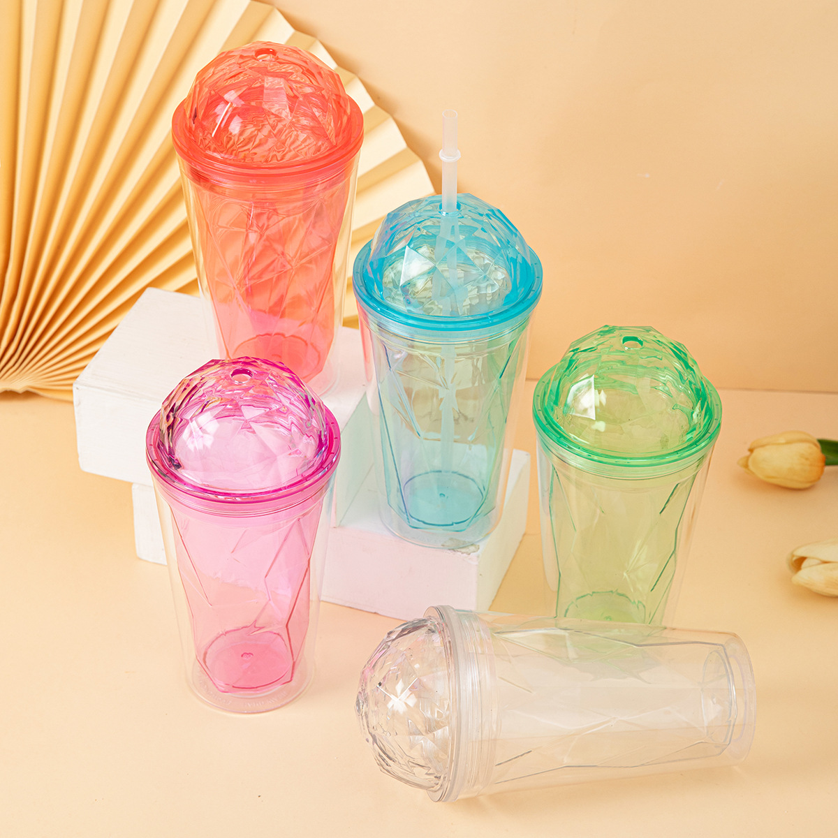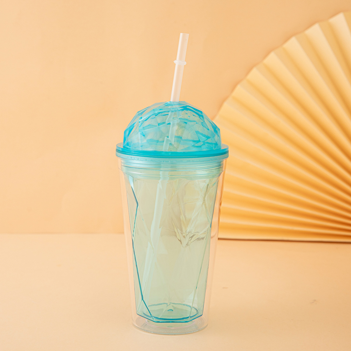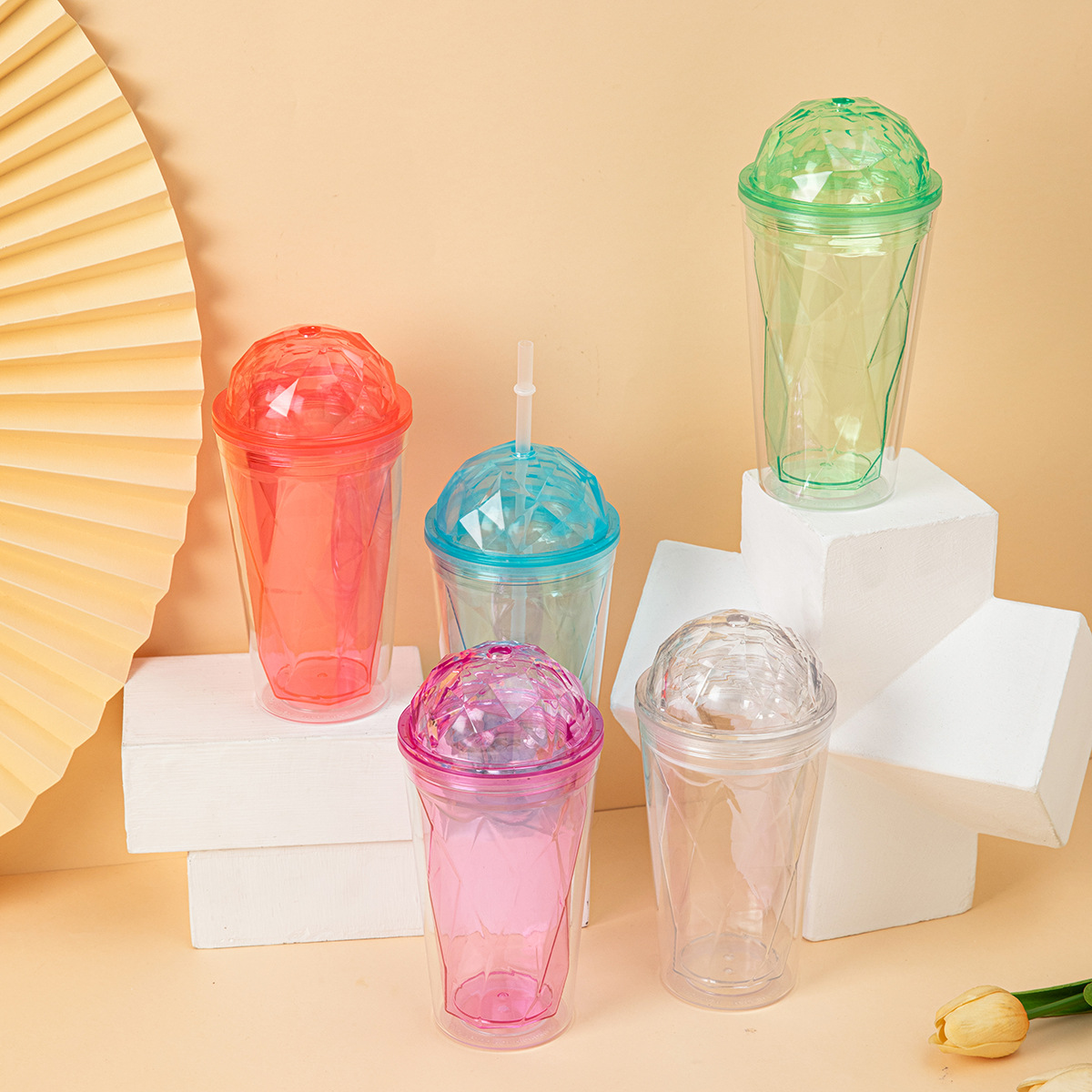 外贸新款塑料透明双层塑料杯批发夏日网红碎冰杯水晶盖菱形吸管杯