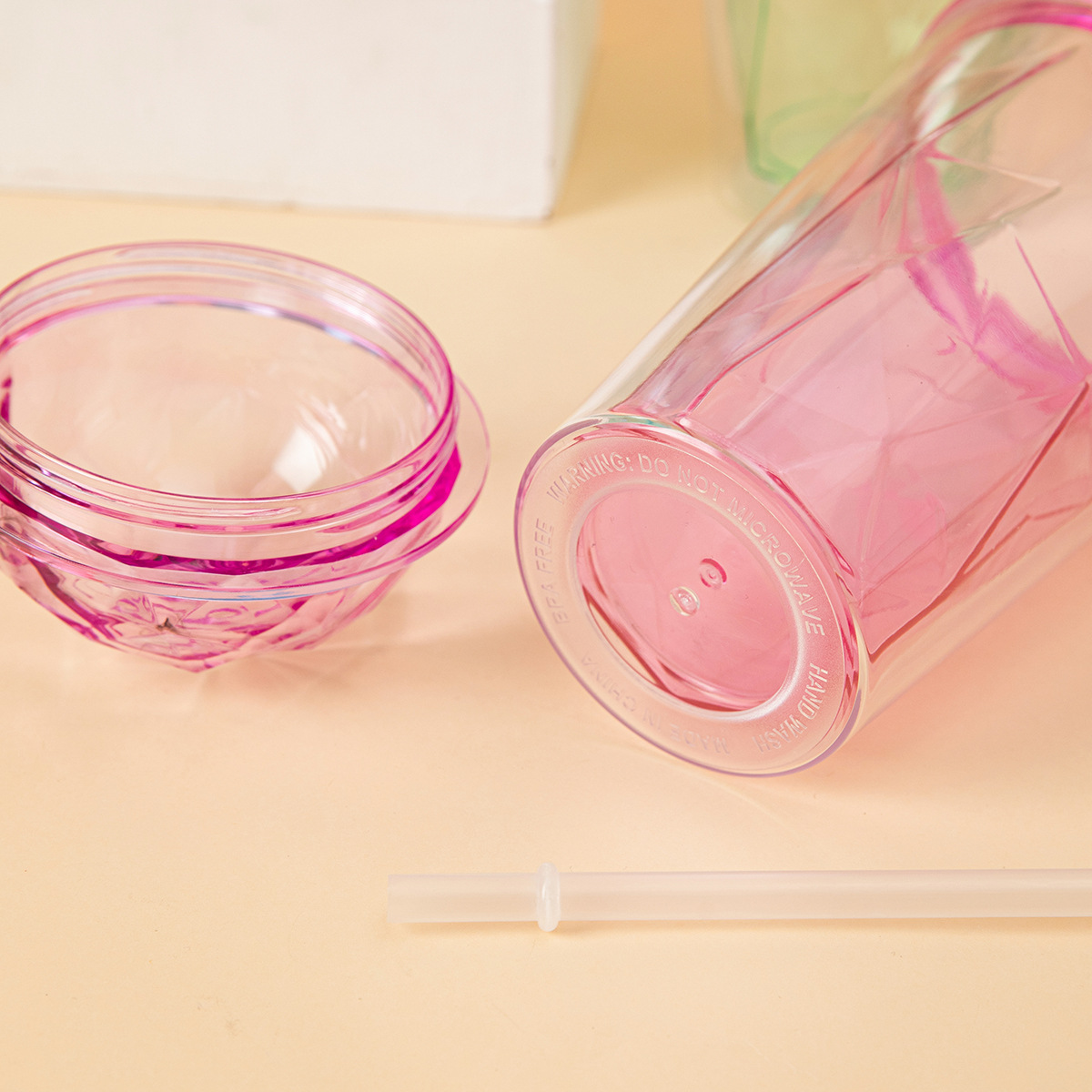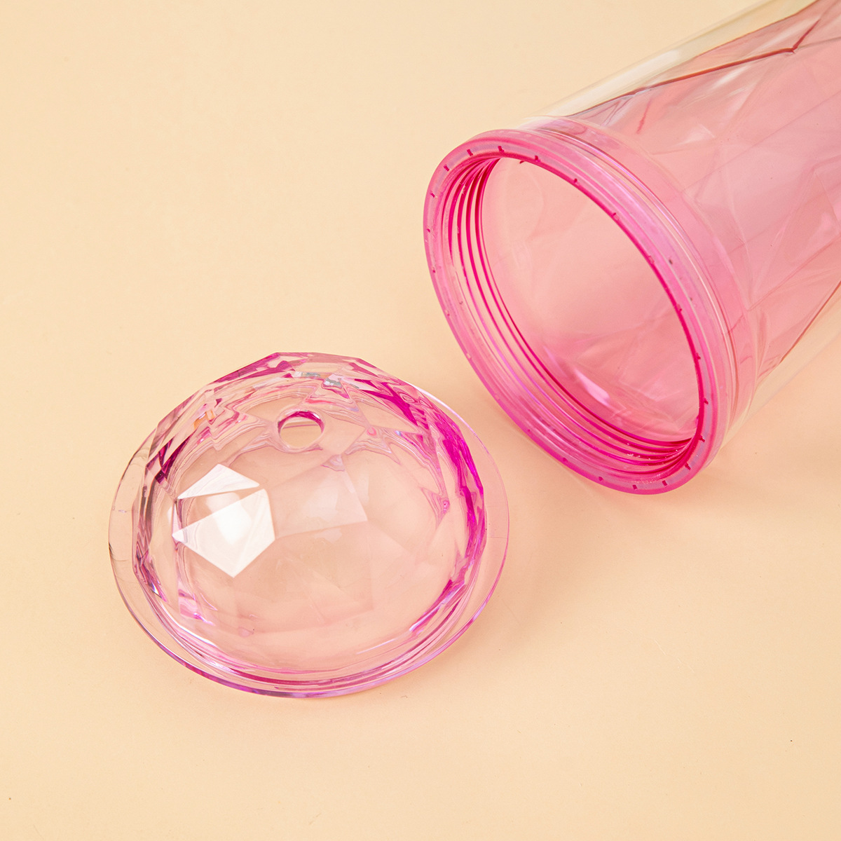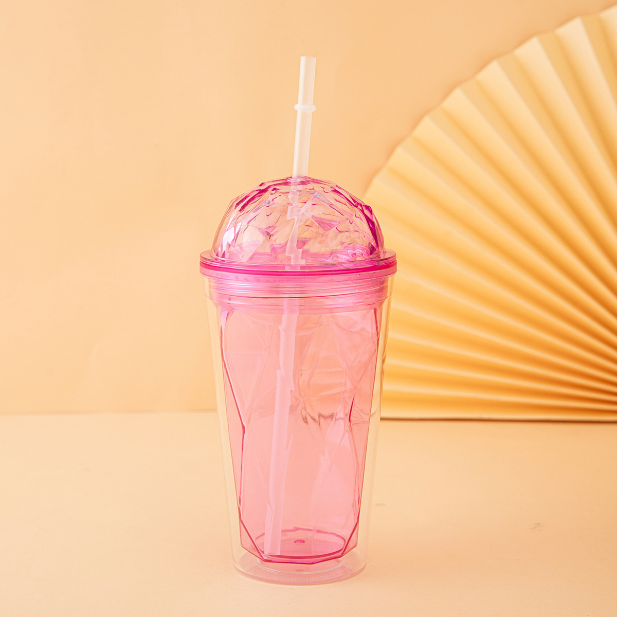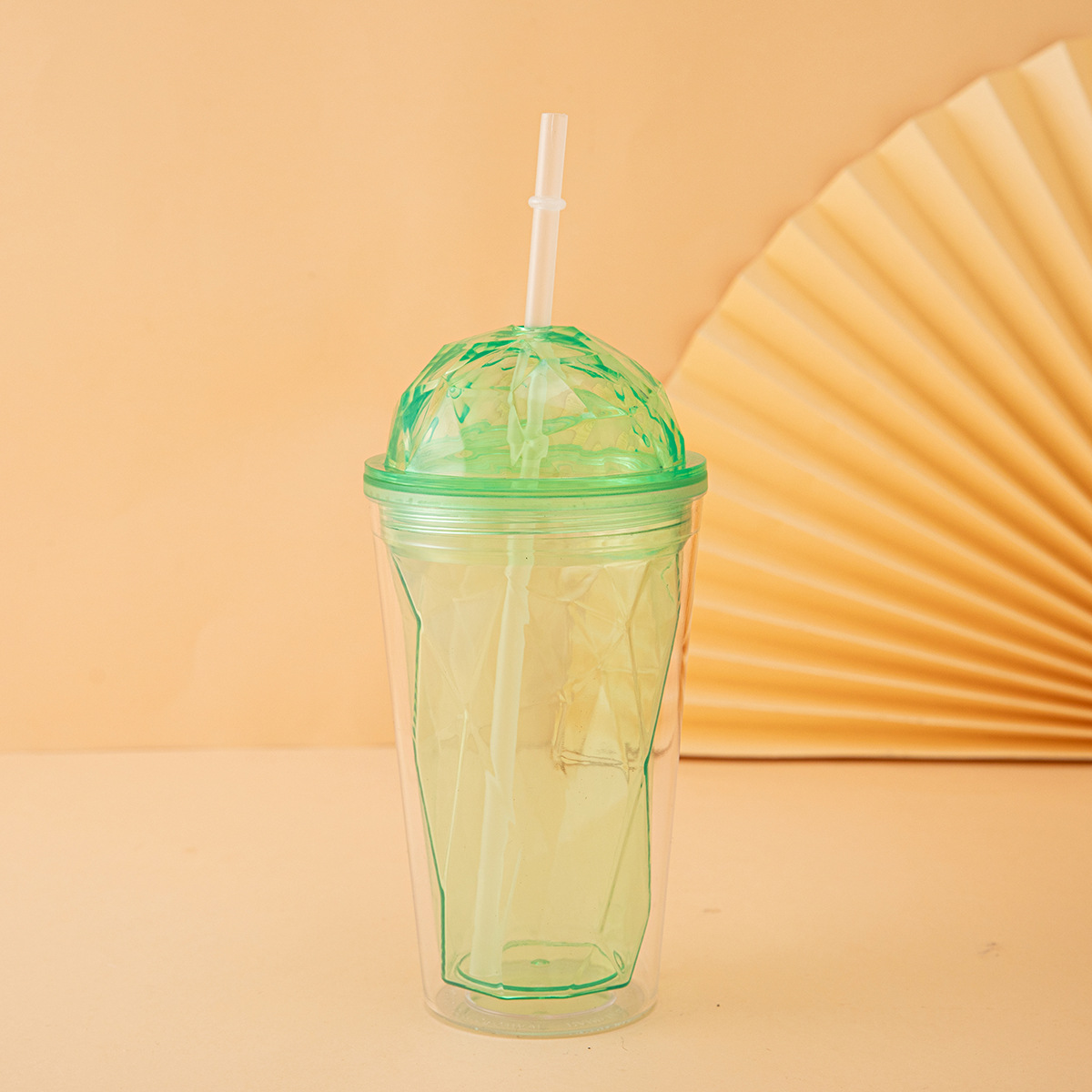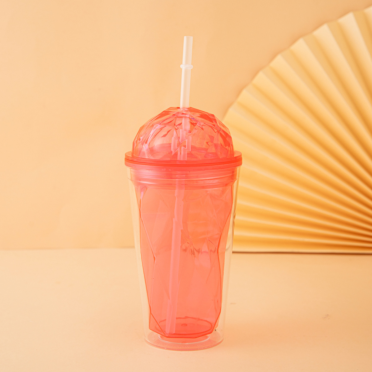 外贸新款塑料透明双层塑料杯批发夏日网红碎冰杯水晶盖菱形吸管杯