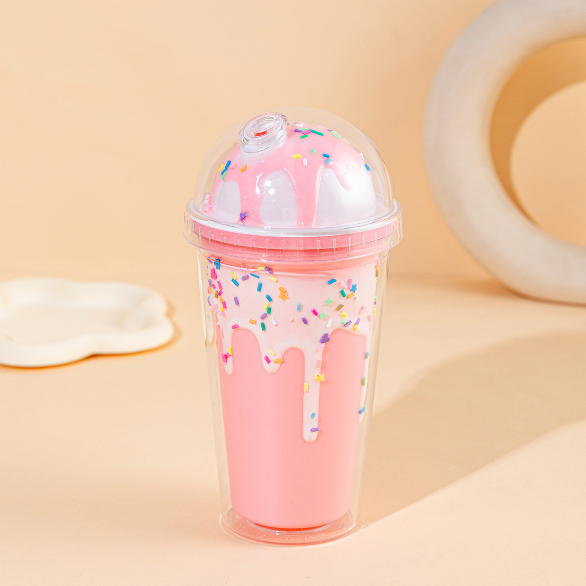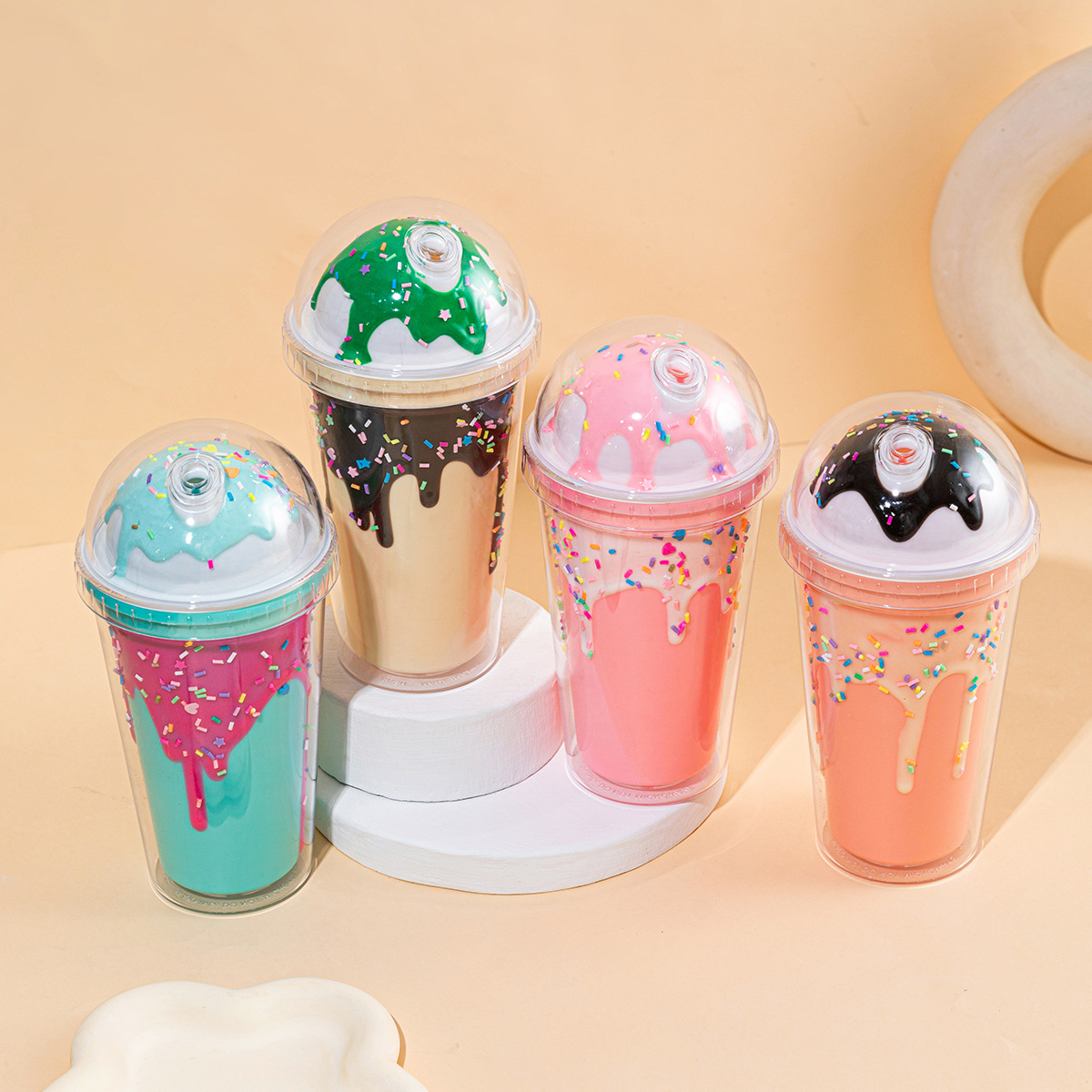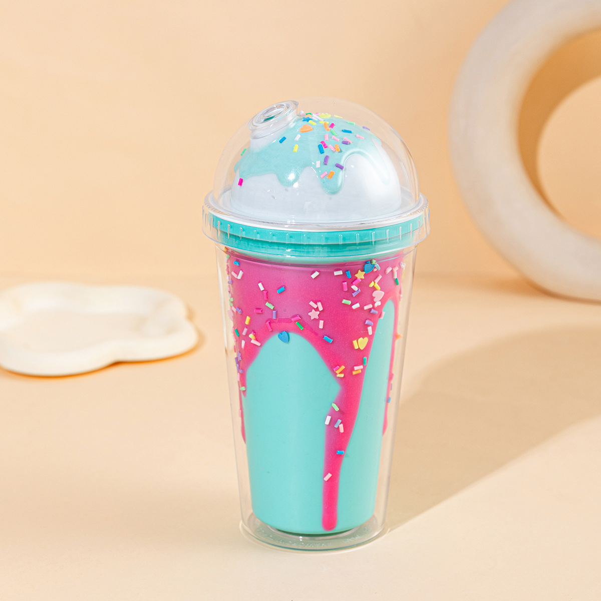 外贸新款网红吸管杯双层带盖情侣水杯批发奶油滴胶冰淇淋雪糕杯子
