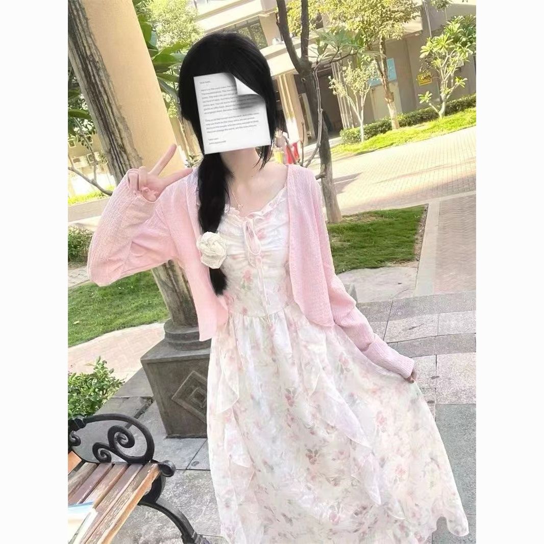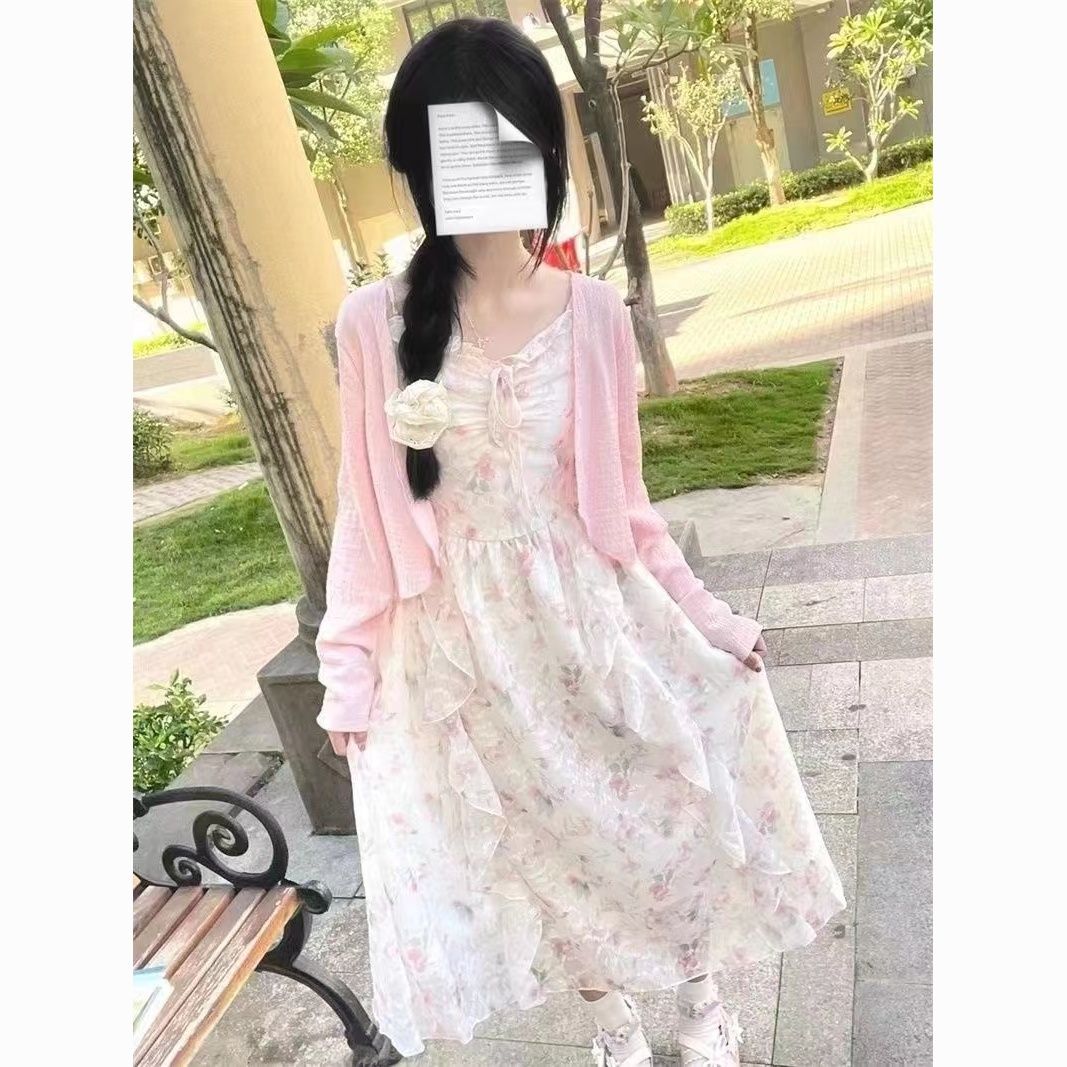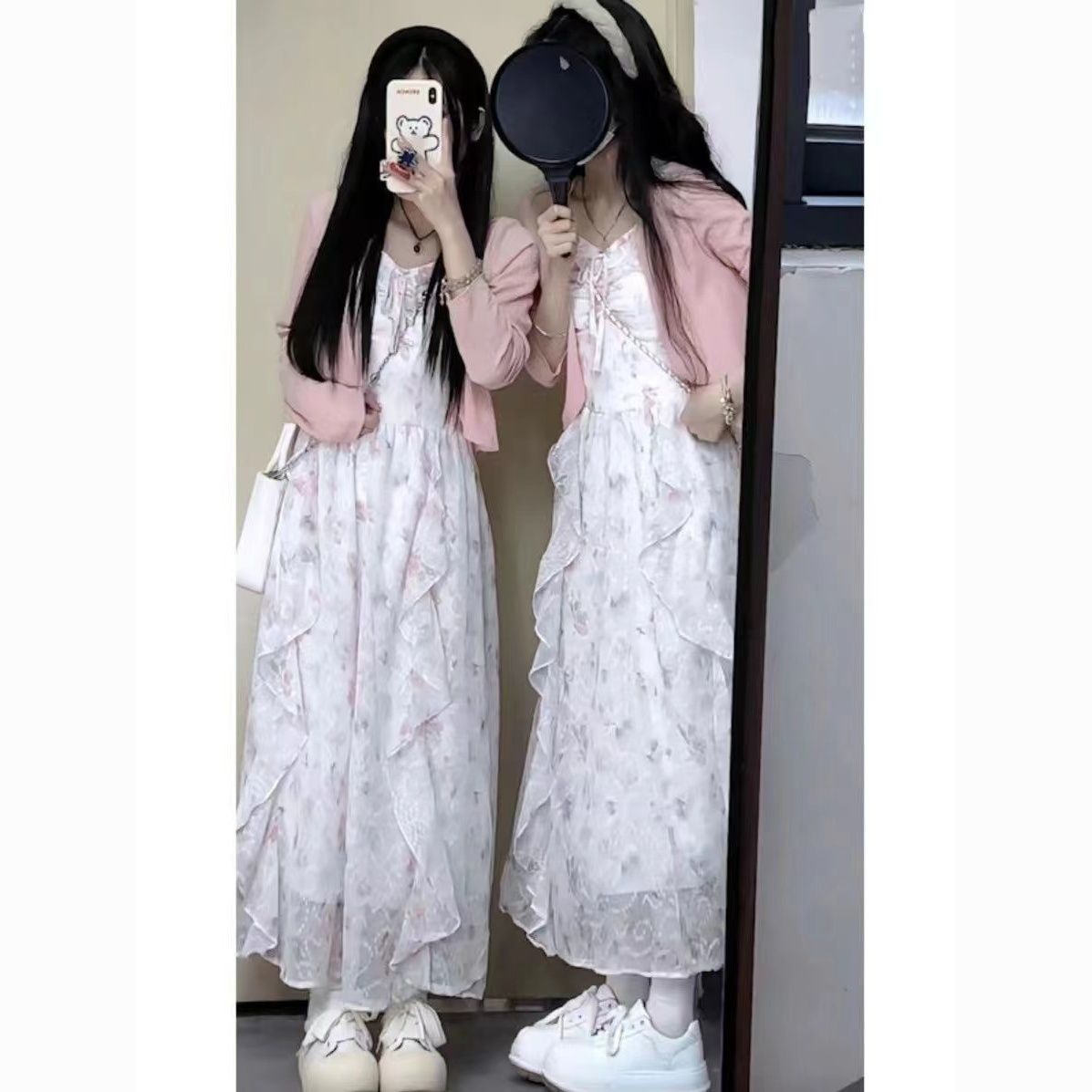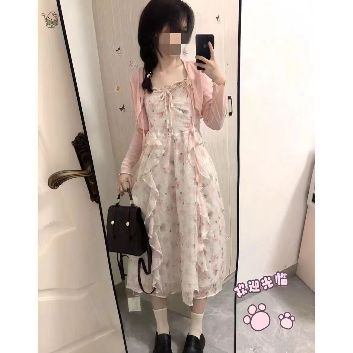 连衣裙秋夏季温柔风气质收腰长款胖妹妹遮肚两件套吊带裙开衫时尚