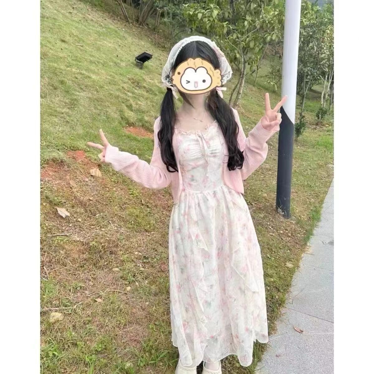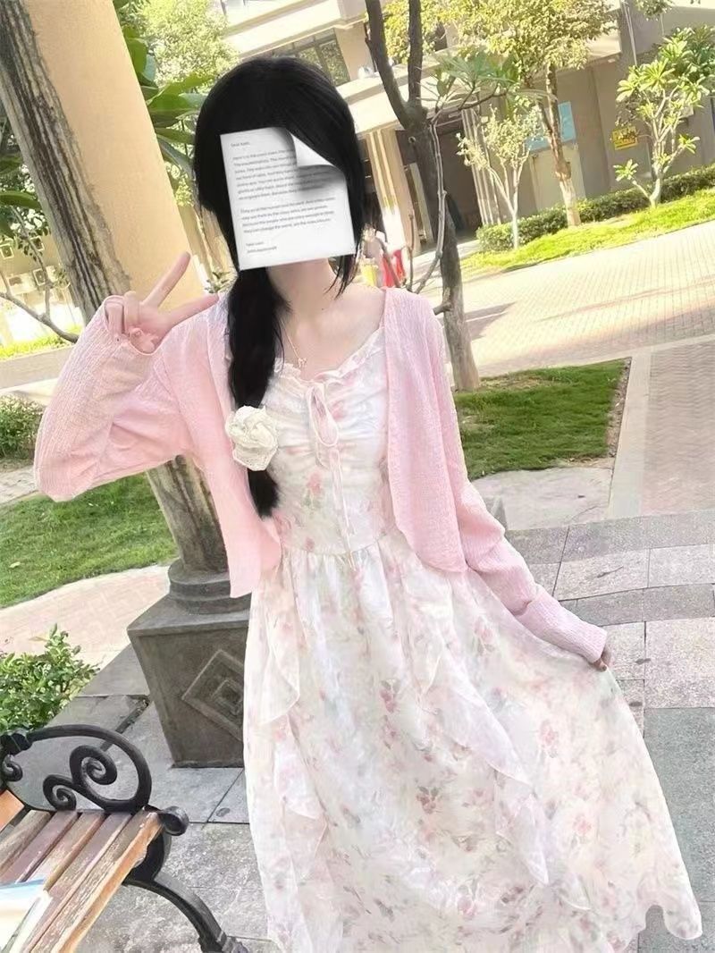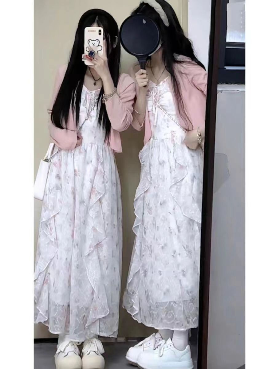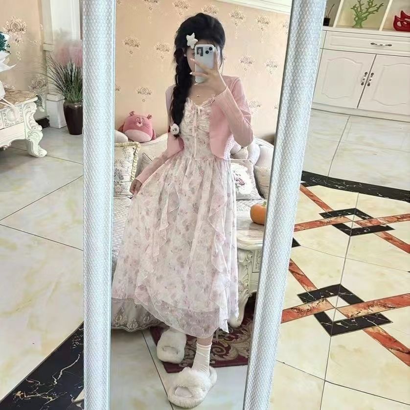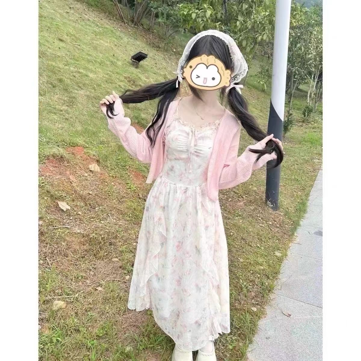 连衣裙秋夏季温柔风气质收腰长款胖妹妹遮肚两件套吊带裙开衫时尚