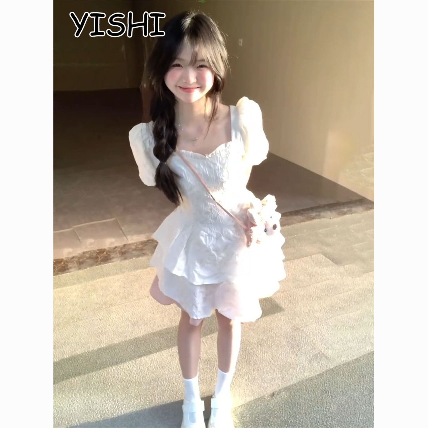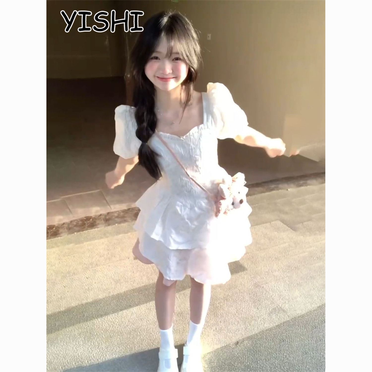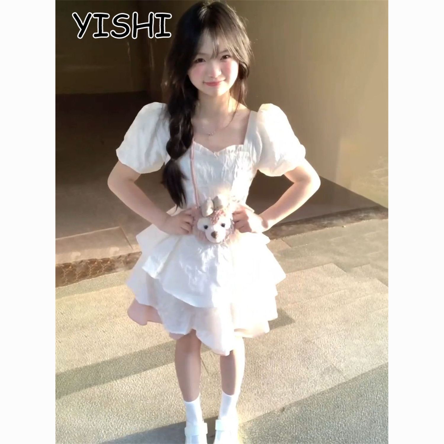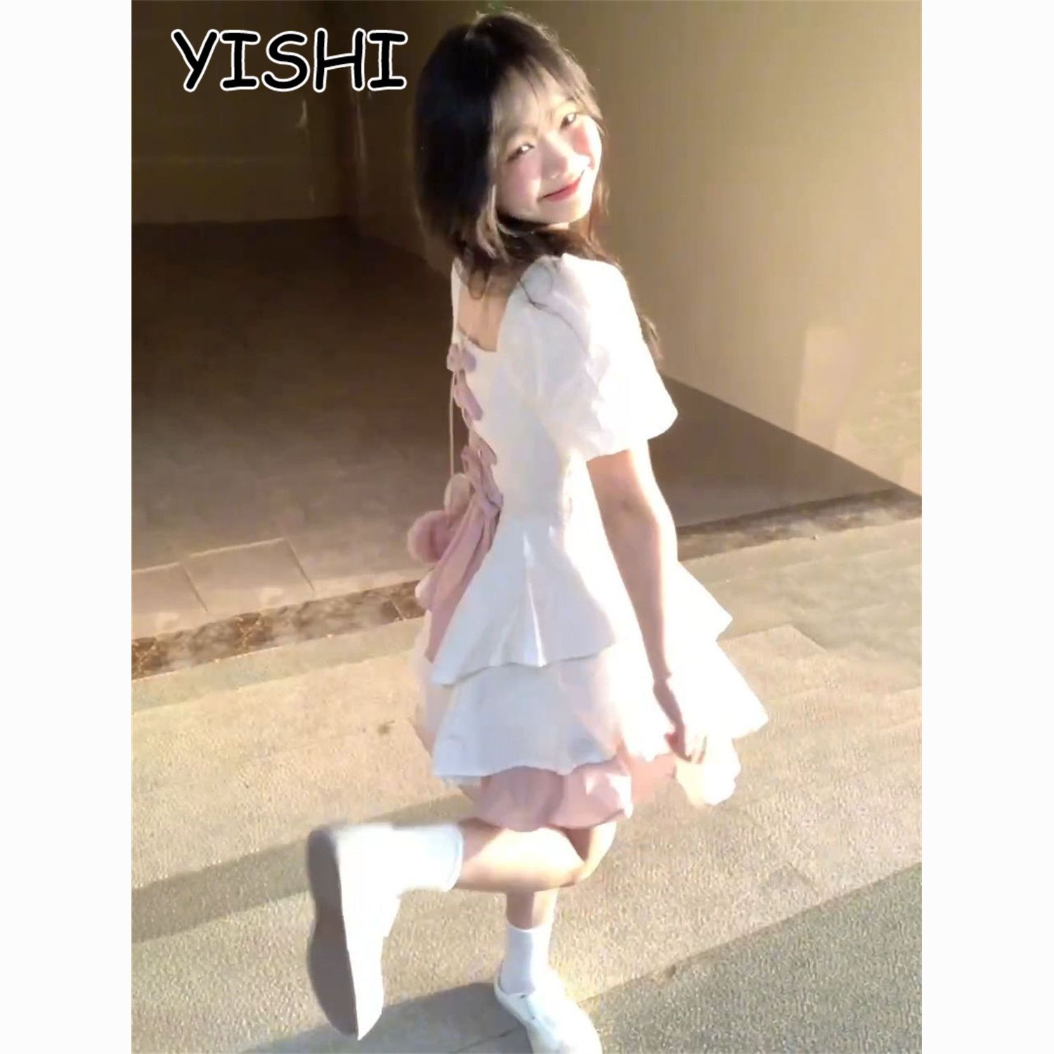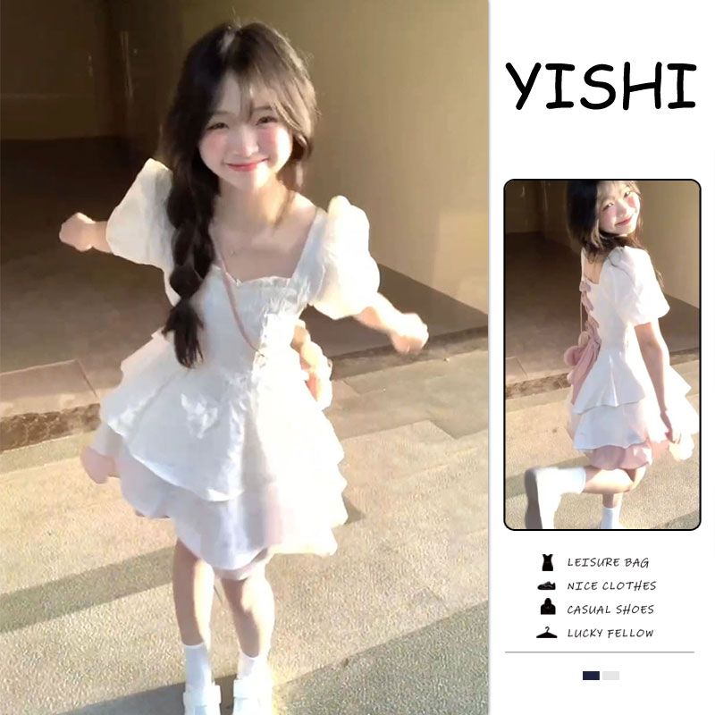 YISHI 甜美可爱系带收腰背后蝴蝶结连衣裙女学生夏新款公主蓬蓬裙