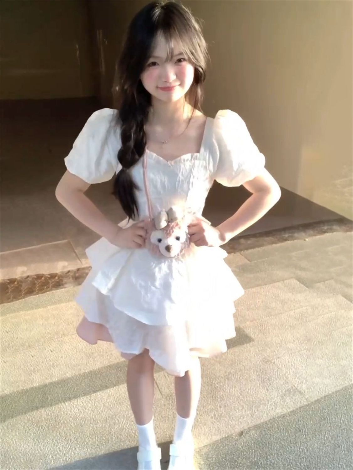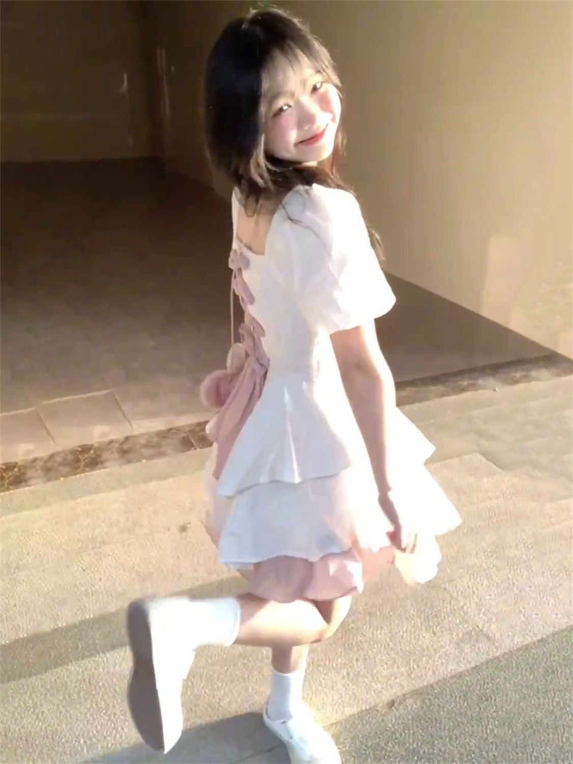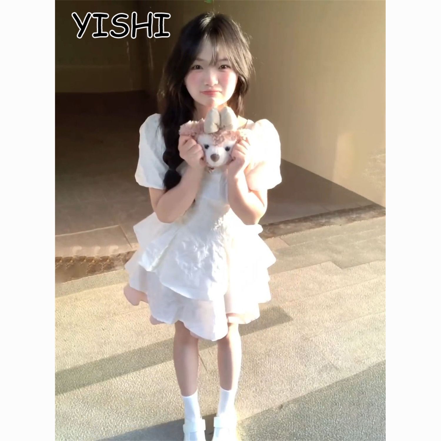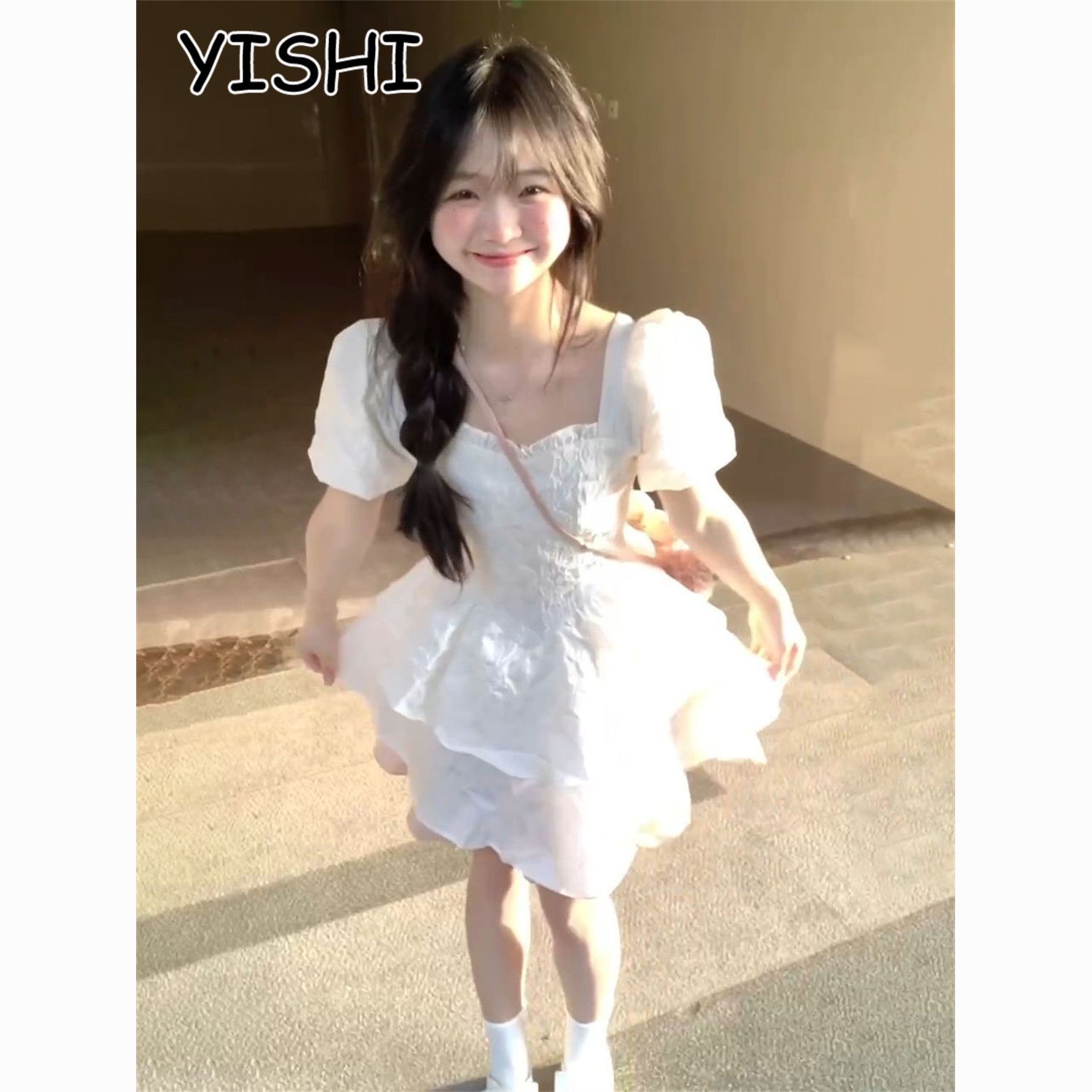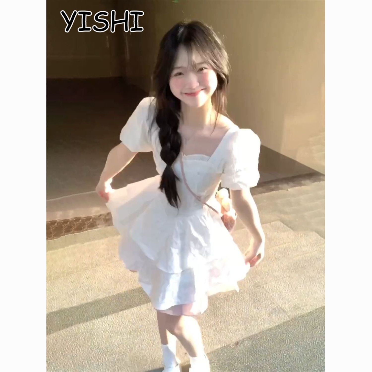 YISHI 甜美可爱系带收腰背后蝴蝶结连衣裙女学生夏新款公主蓬蓬裙