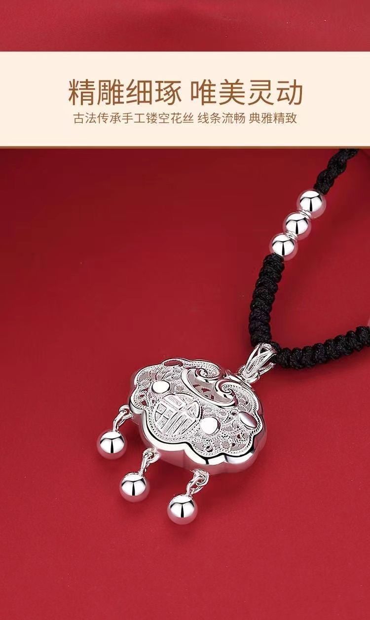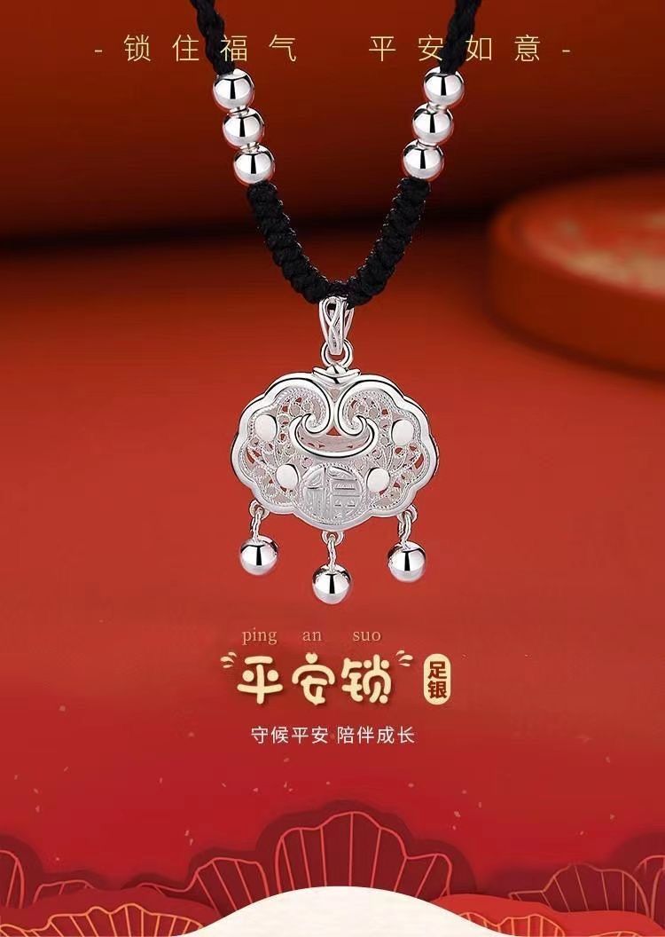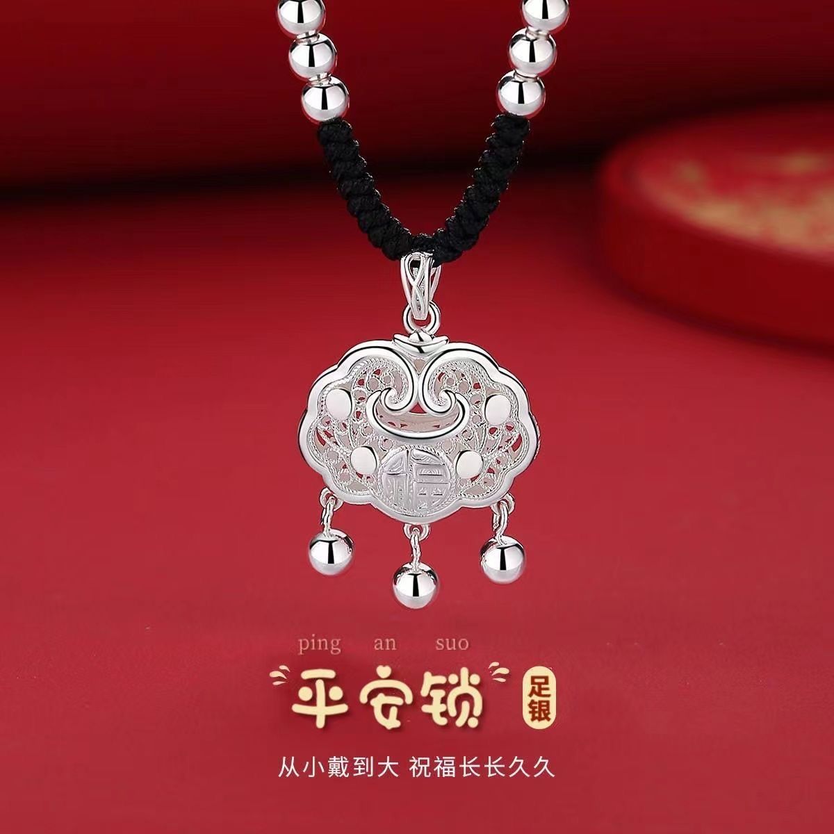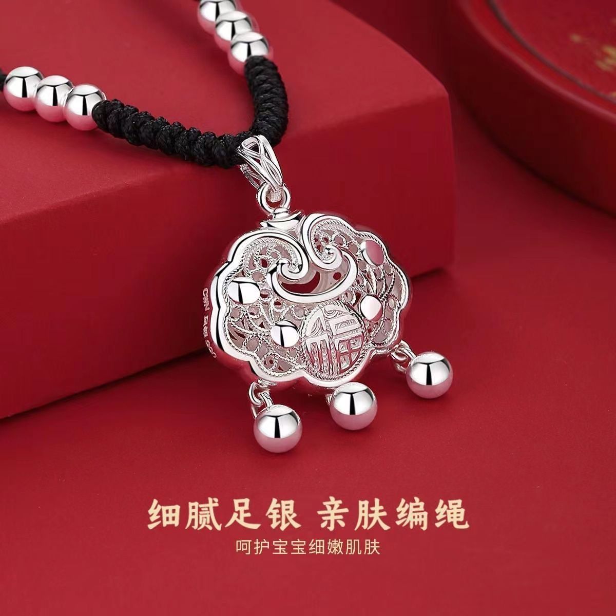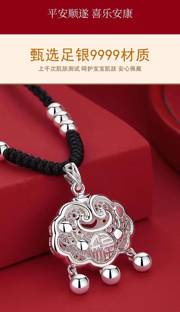 足银纯银正品宝宝999平安项链花丝镂空吊坠礼物手工福字长命锁
