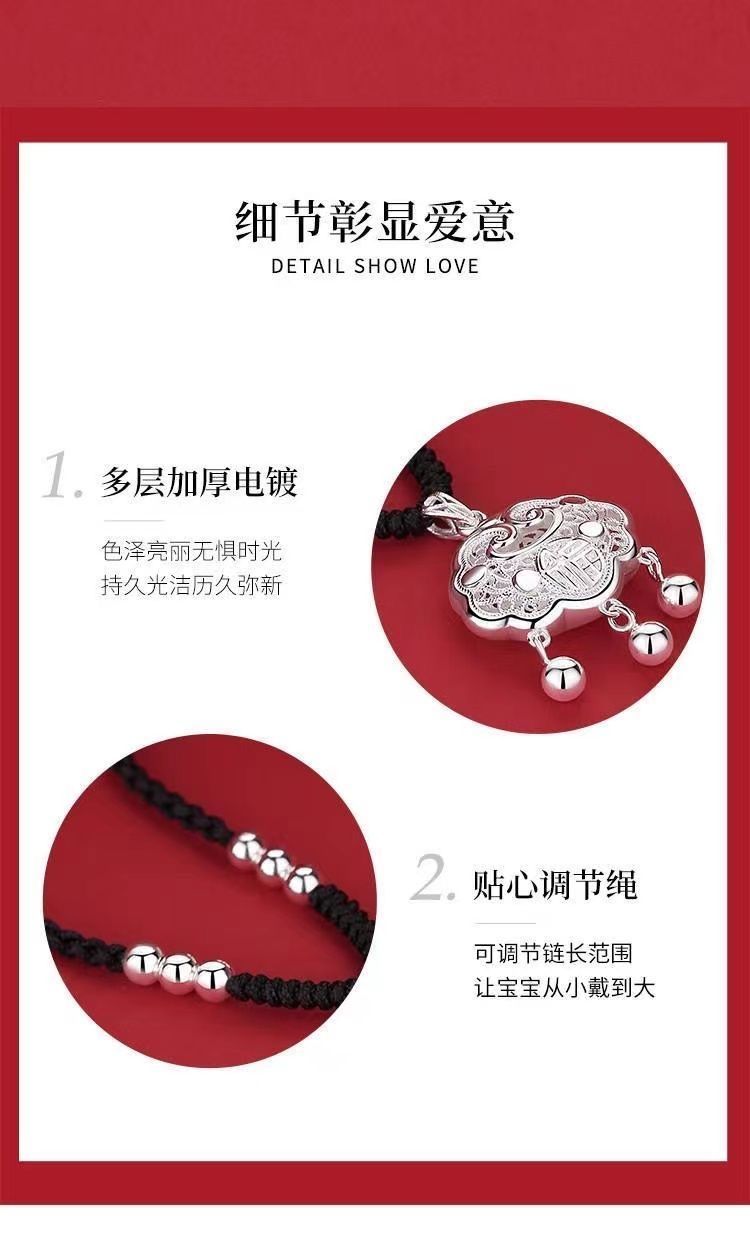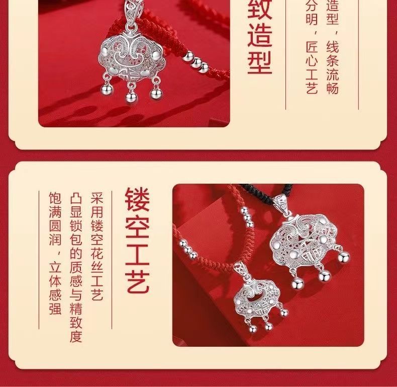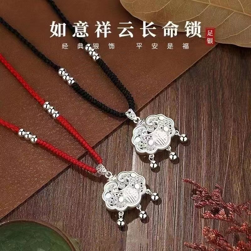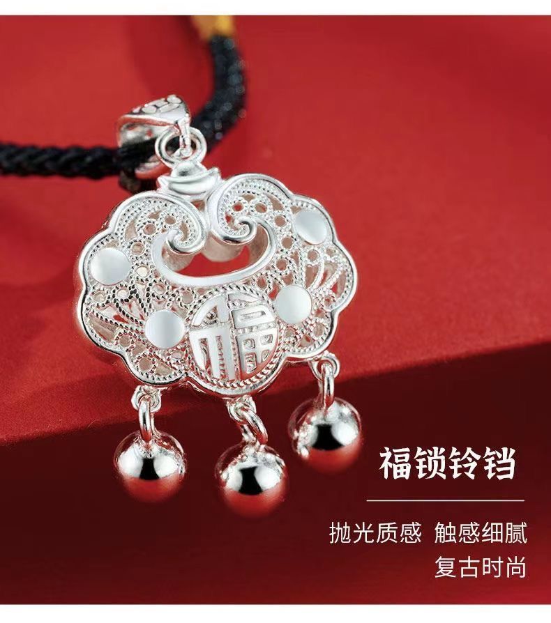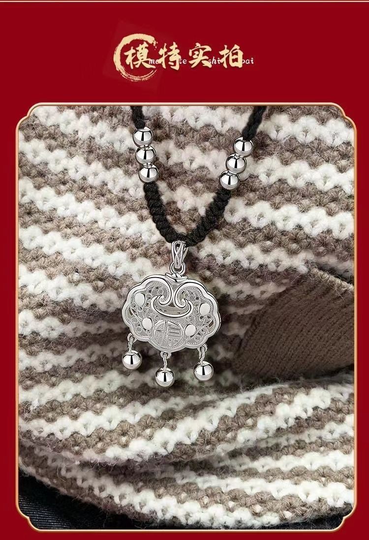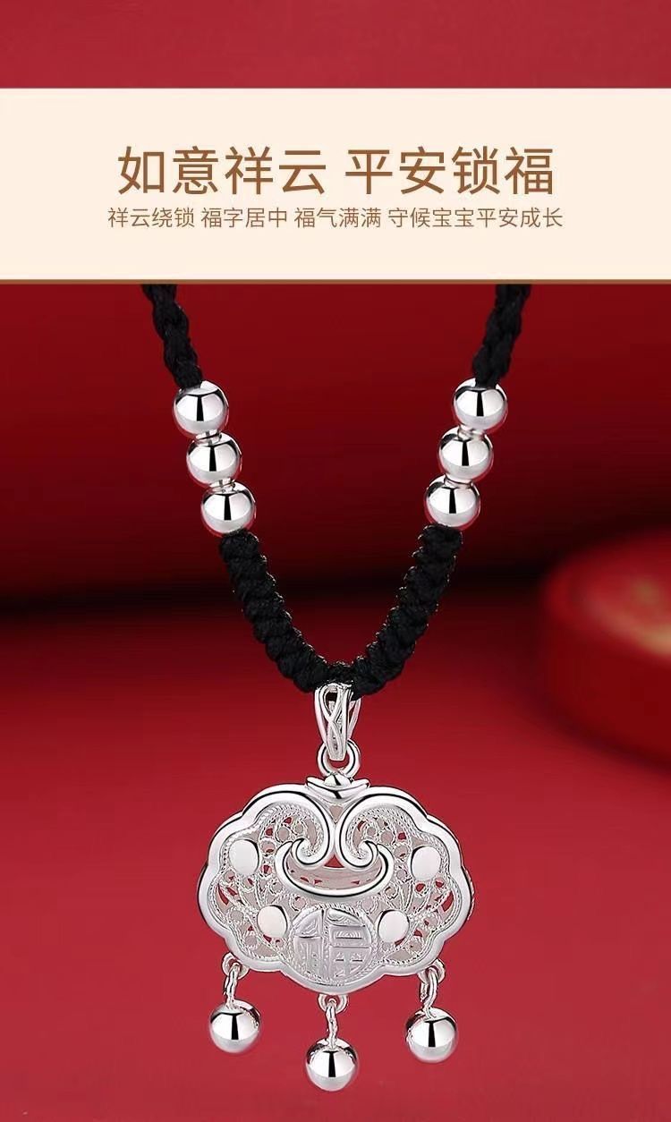 足银纯银正品宝宝999平安项链花丝镂空吊坠礼物手工福字长命锁