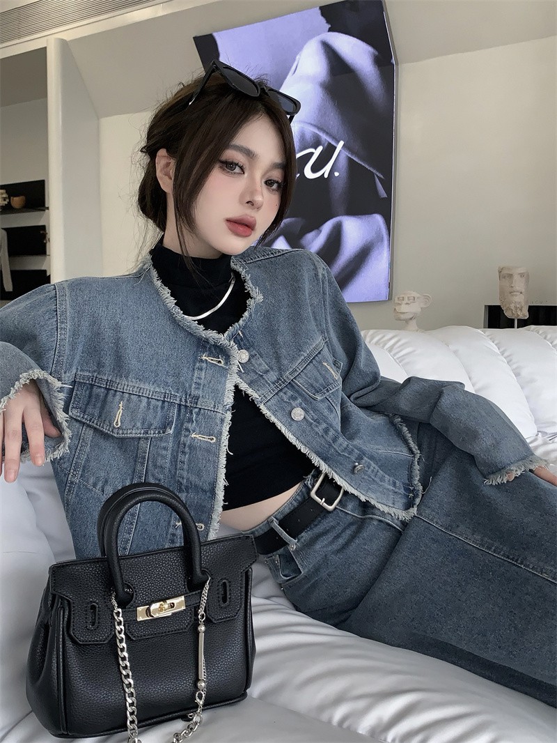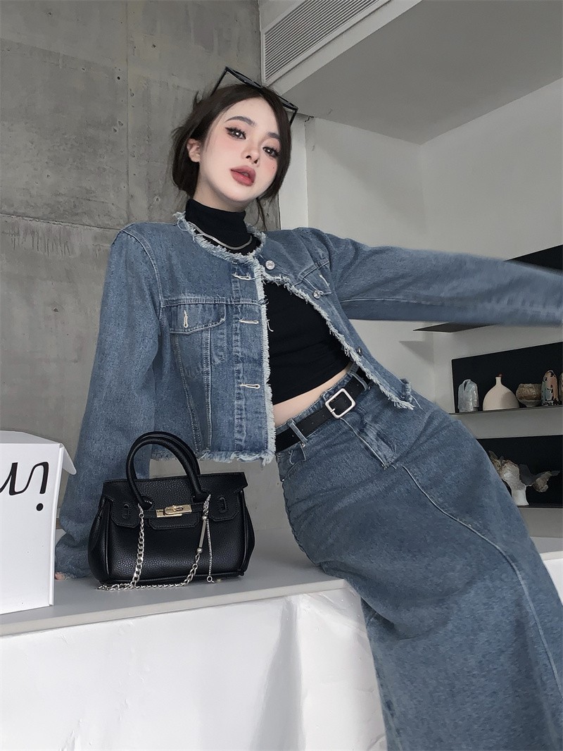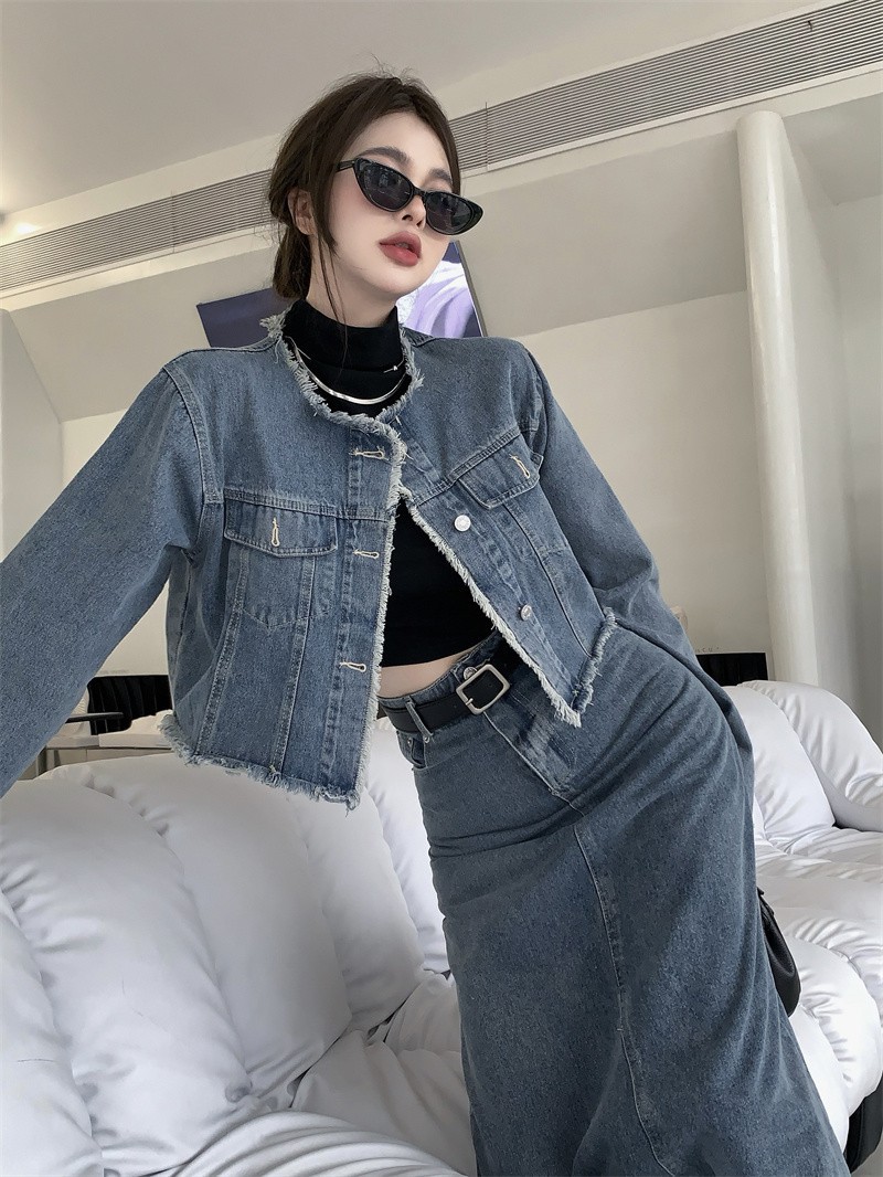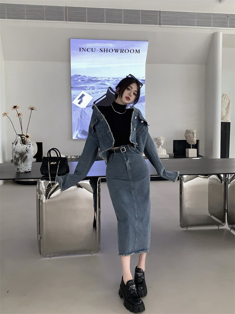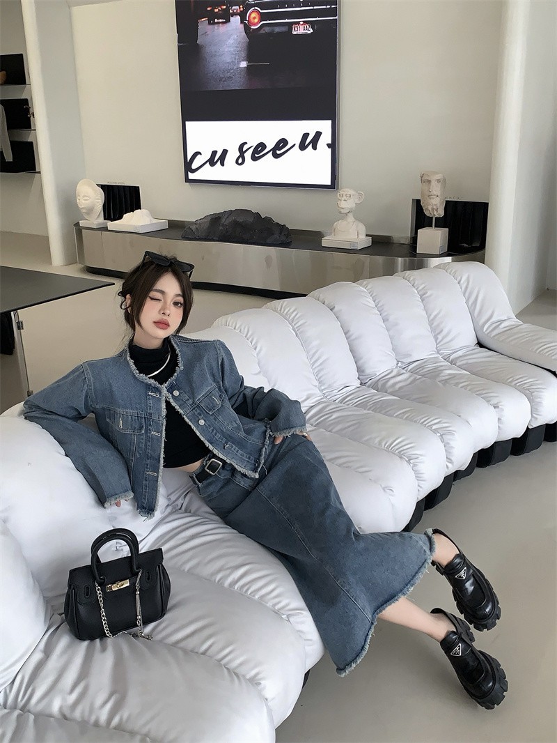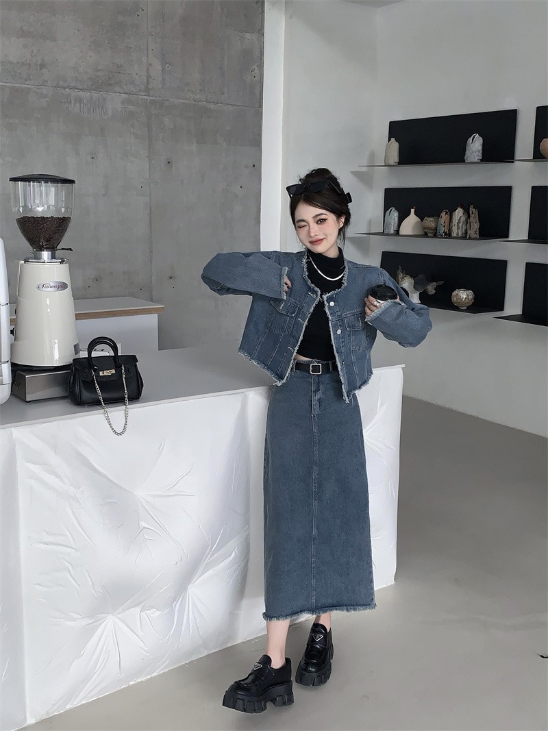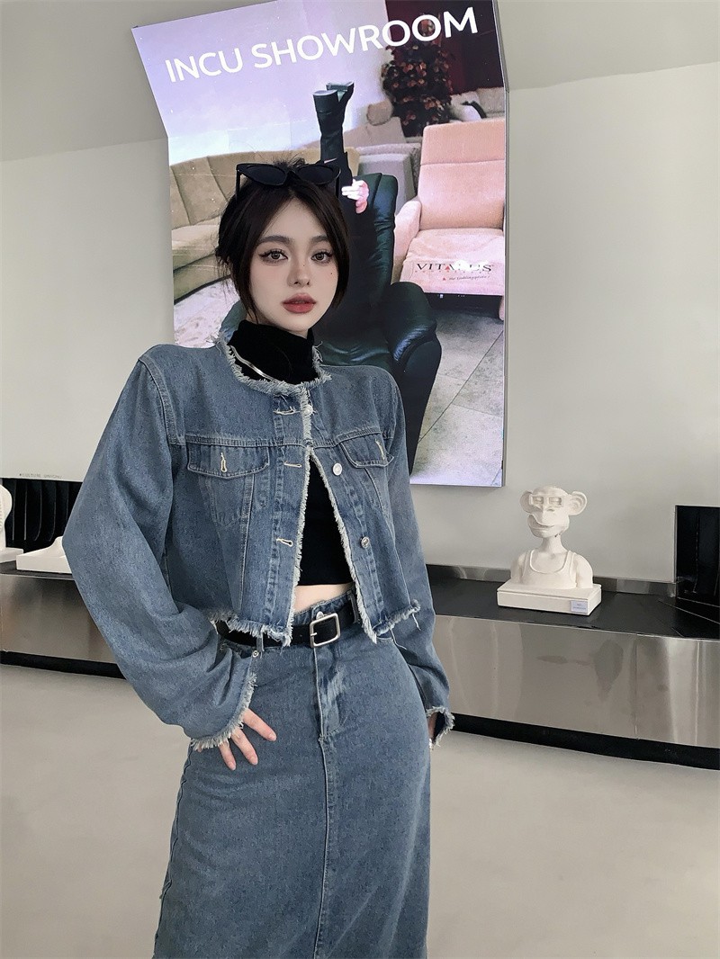 美式复古毛边牛仔套装女春季新款港风牛仔外套中长款半身裙两件套