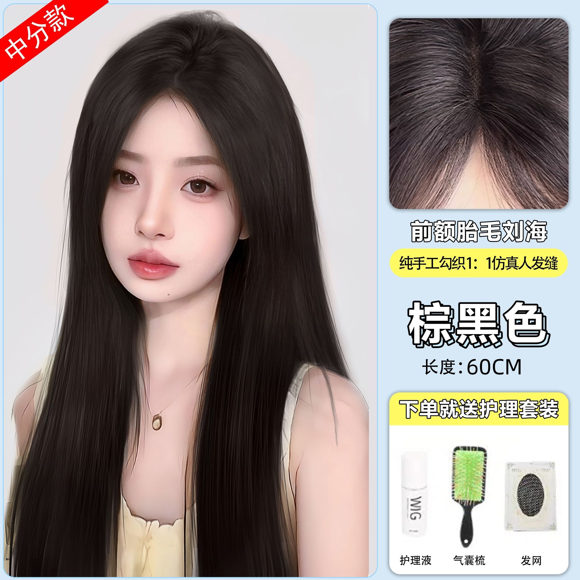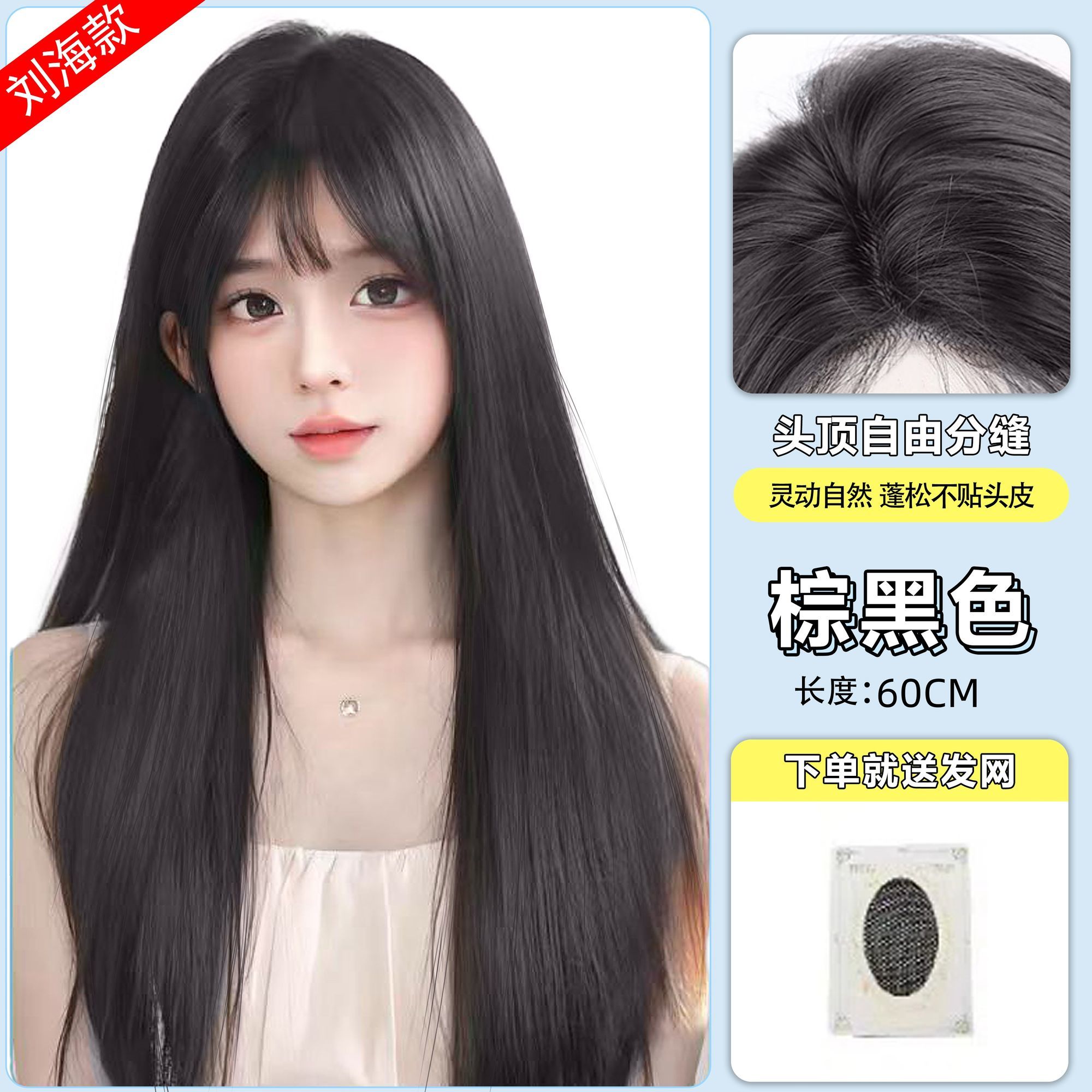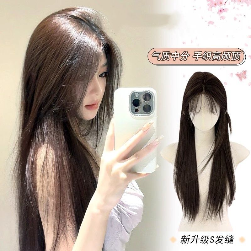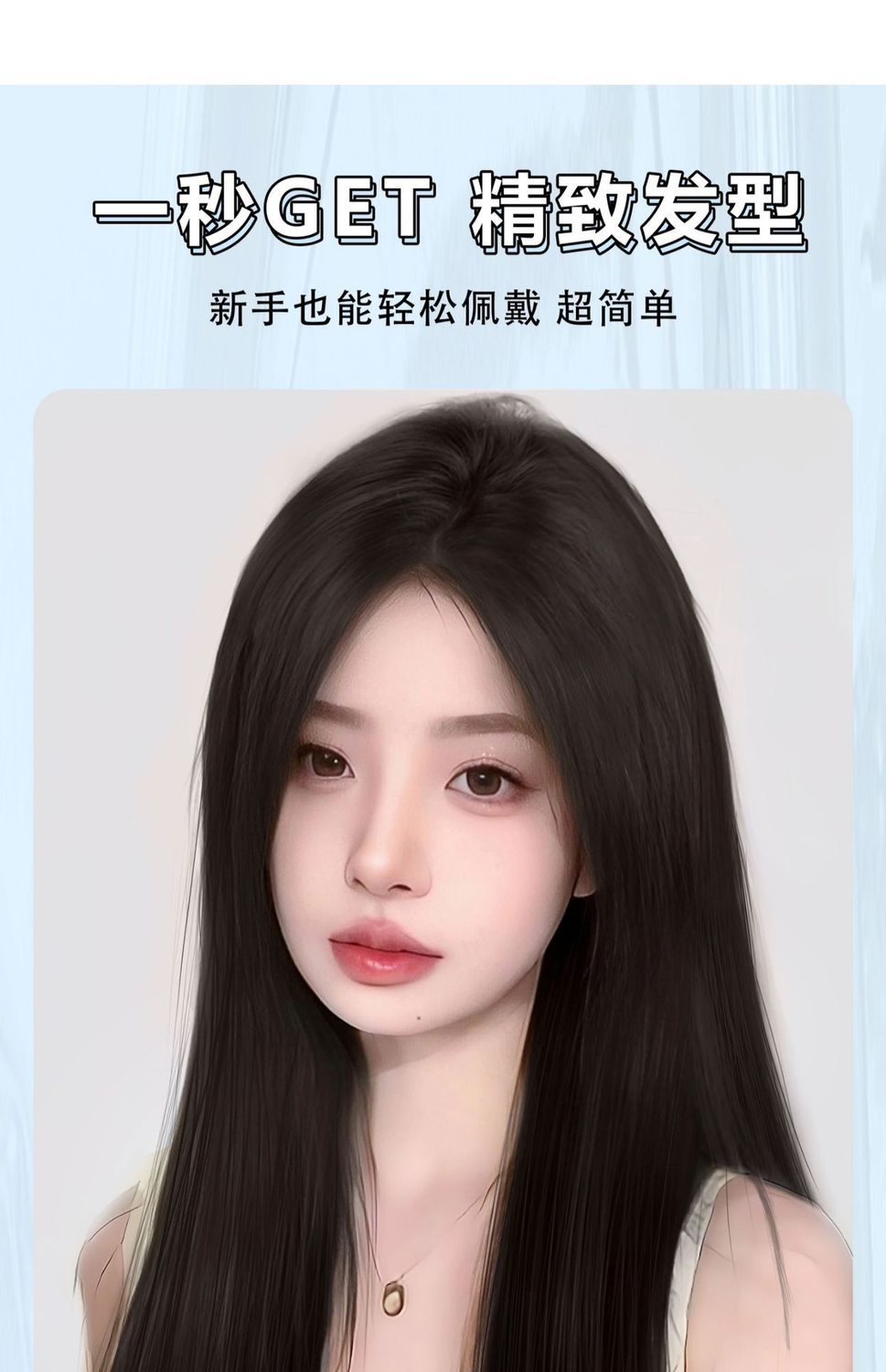 长直发女全头套式法式中分刘海整顶头套轻薄透气仿真发黑长直头套