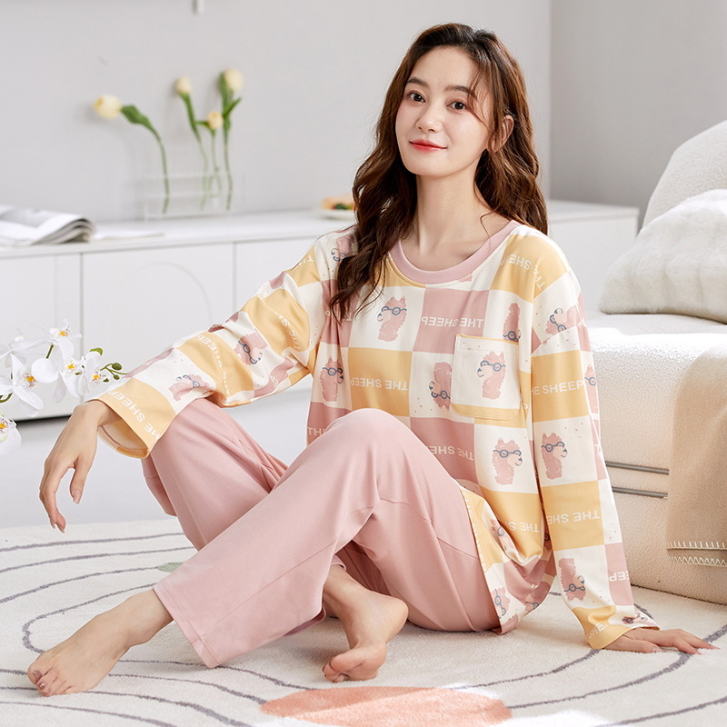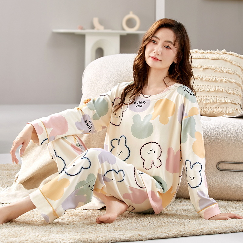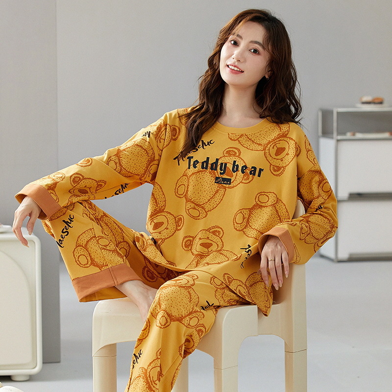 秋冬季针织棉睡衣女长袖长裤休闲舒适卡通大码套装少女宽松家居服