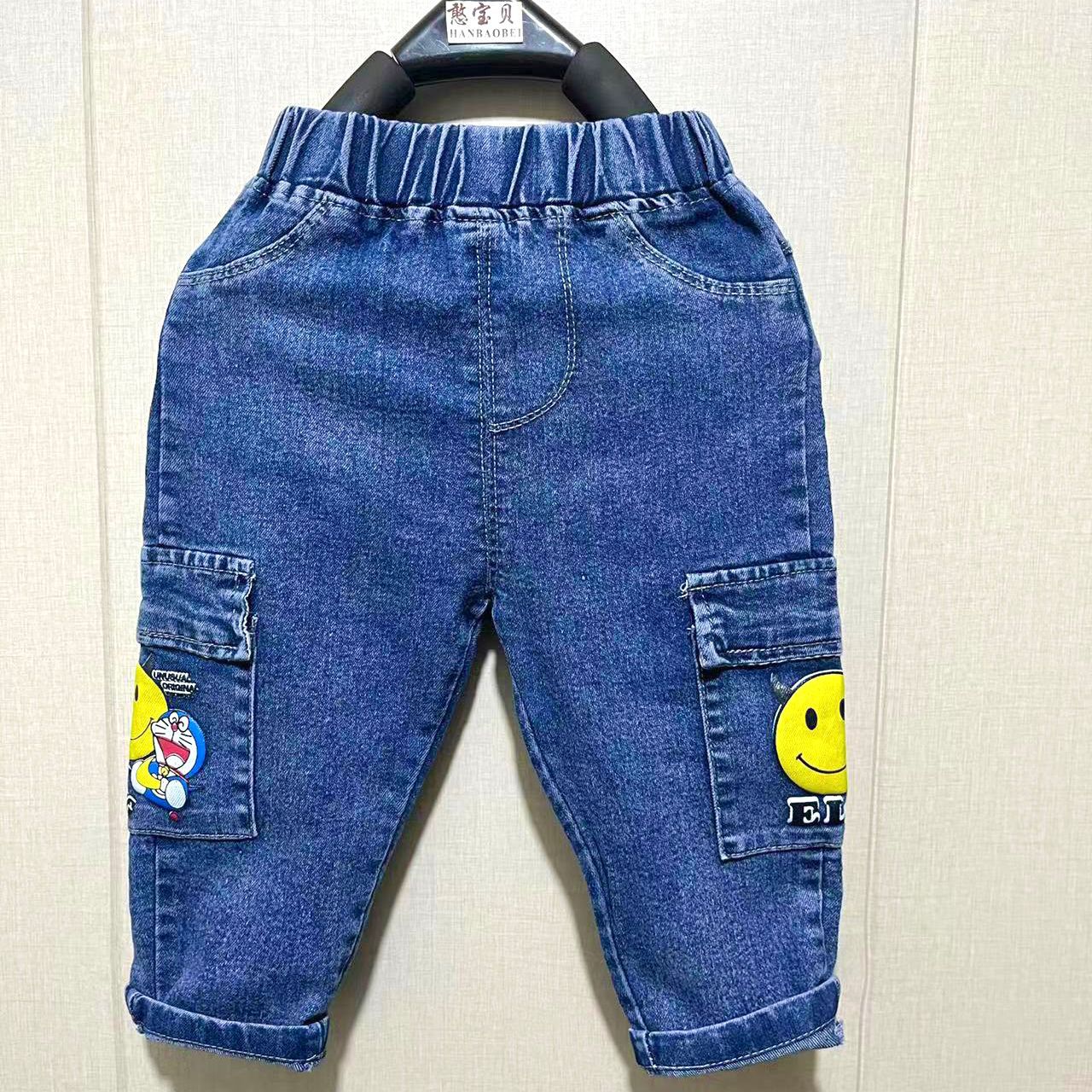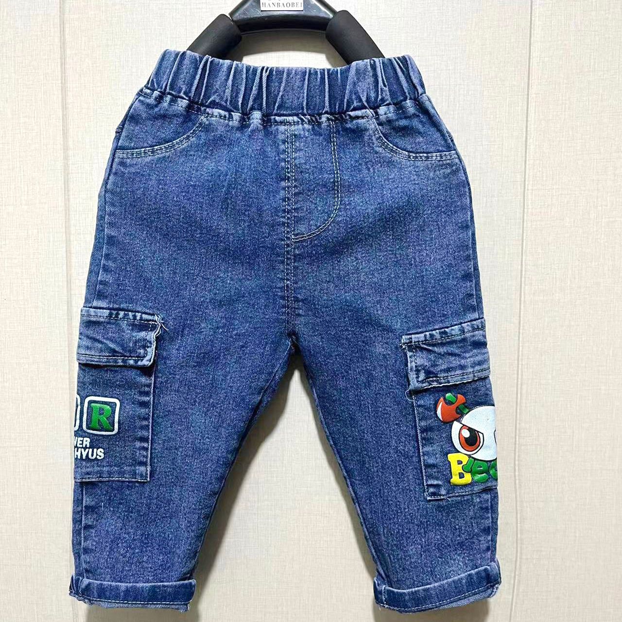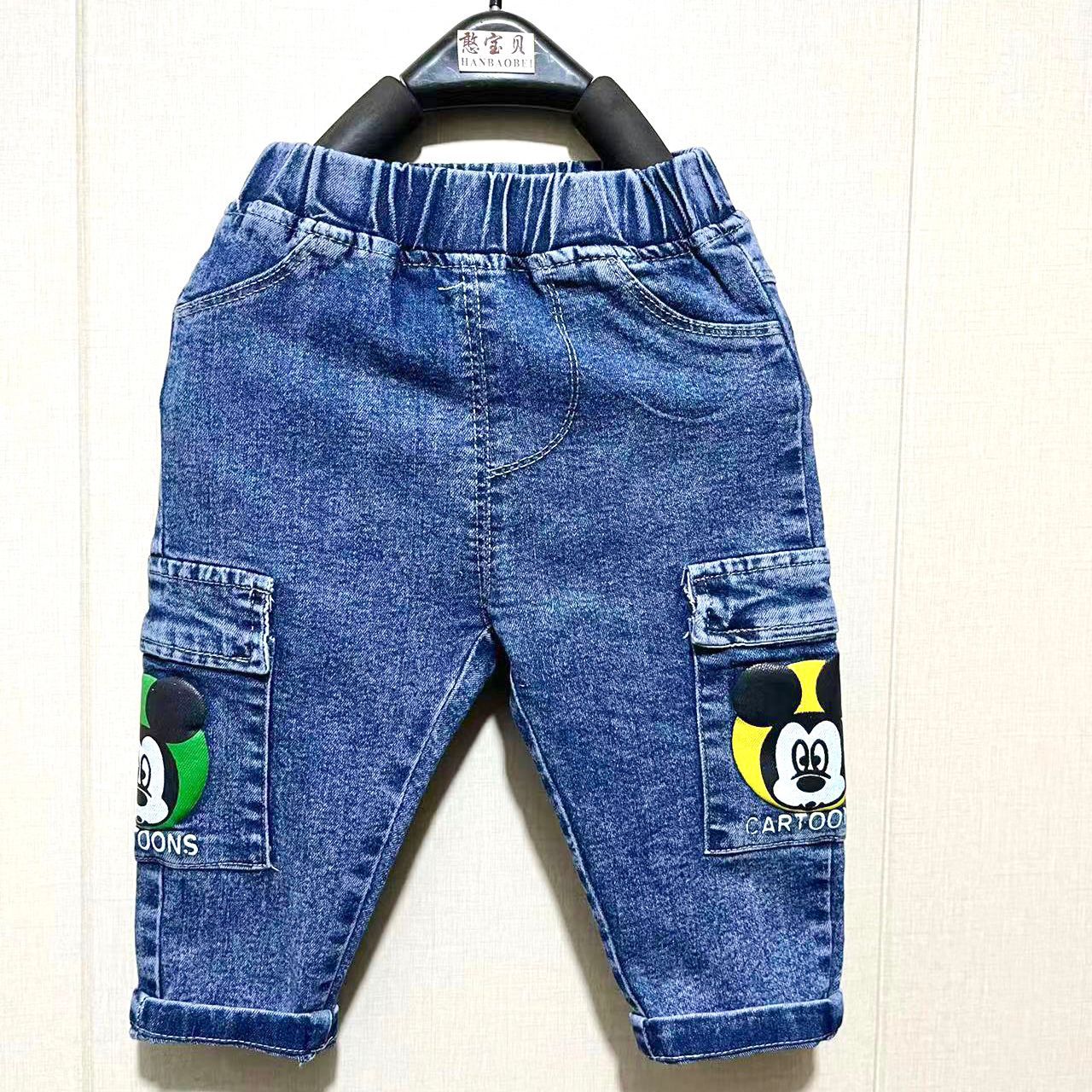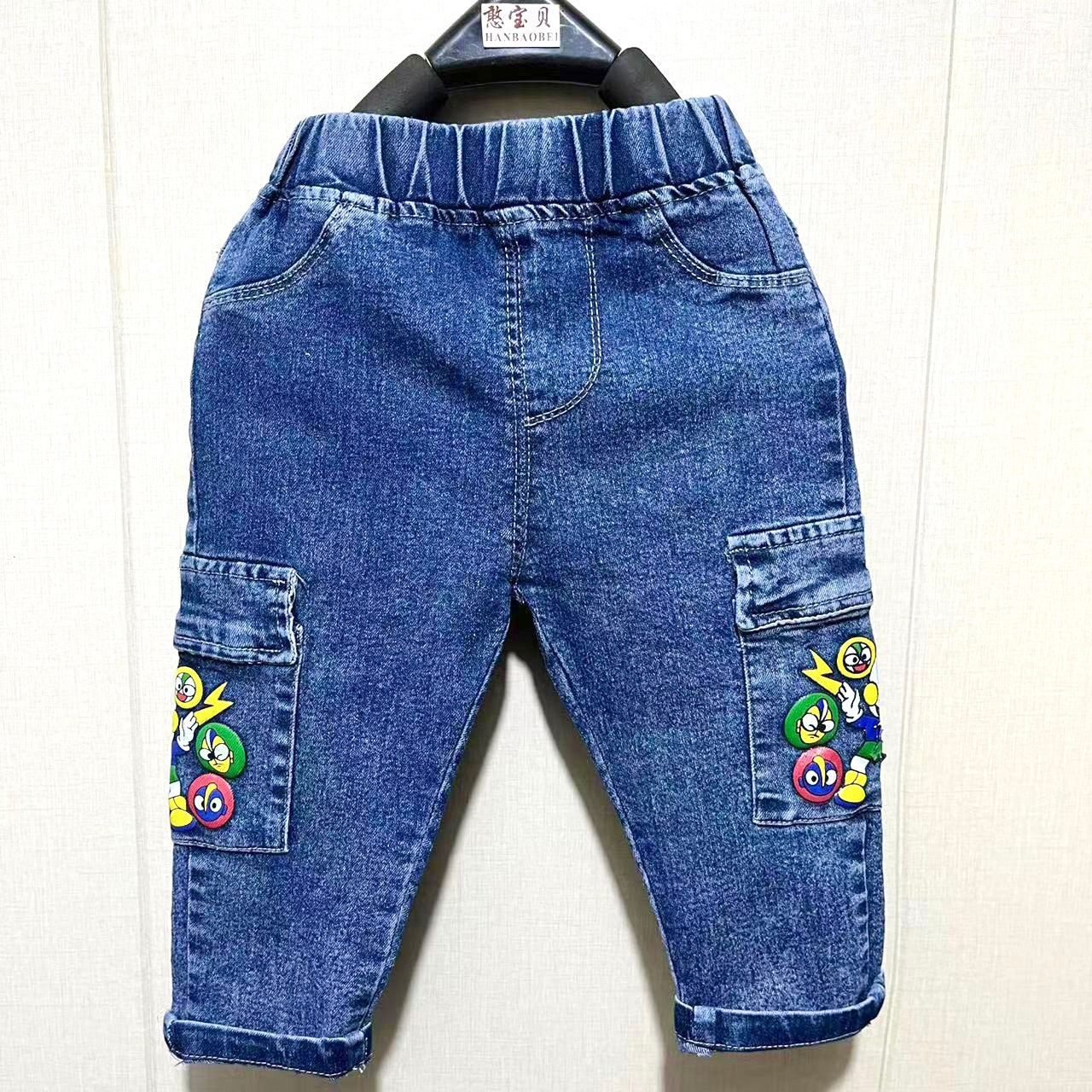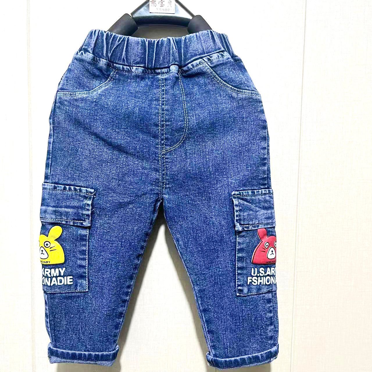 儿童牛仔裤春秋季男孩女孩长裤卡通弹力工装印花中小童宝宝喇叭裤
