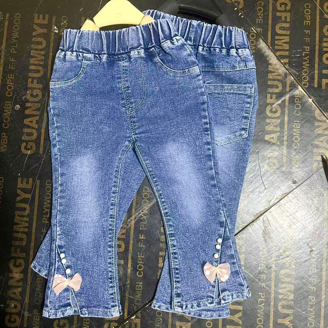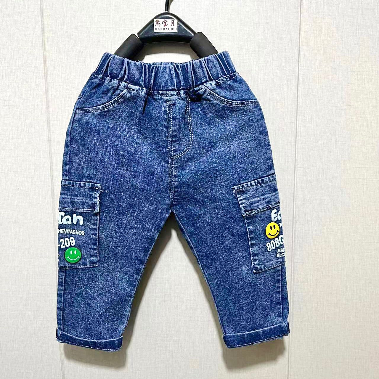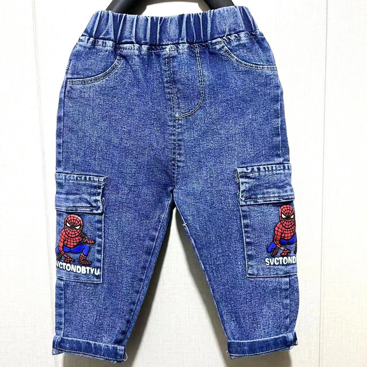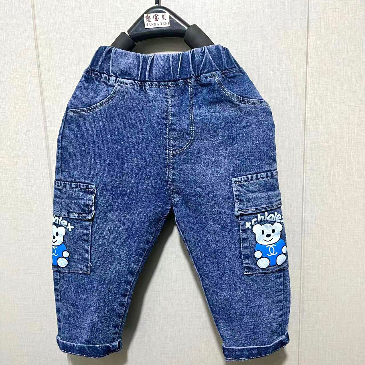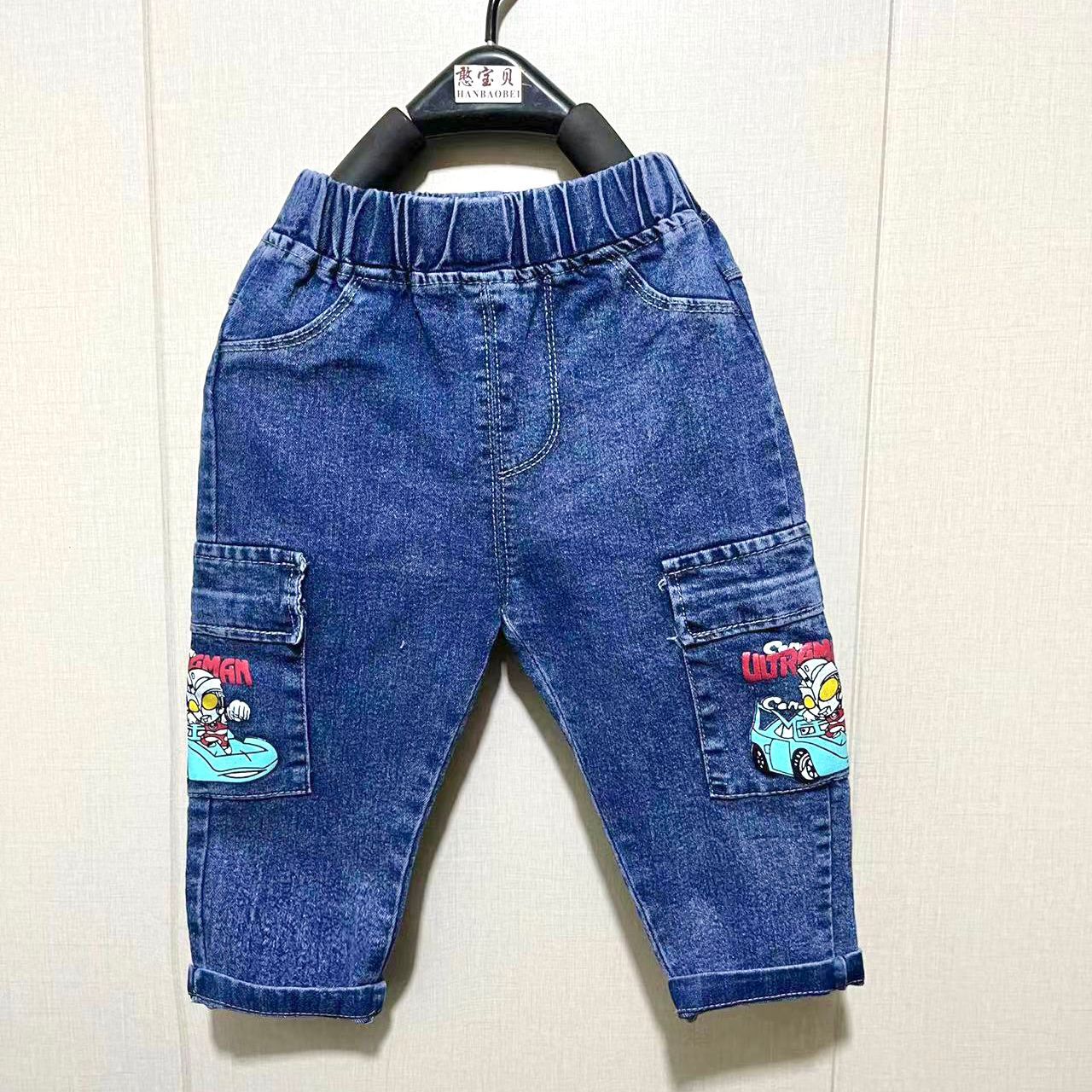 儿童牛仔裤春秋季男孩女孩长裤卡通弹力工装印花中小童宝宝喇叭裤