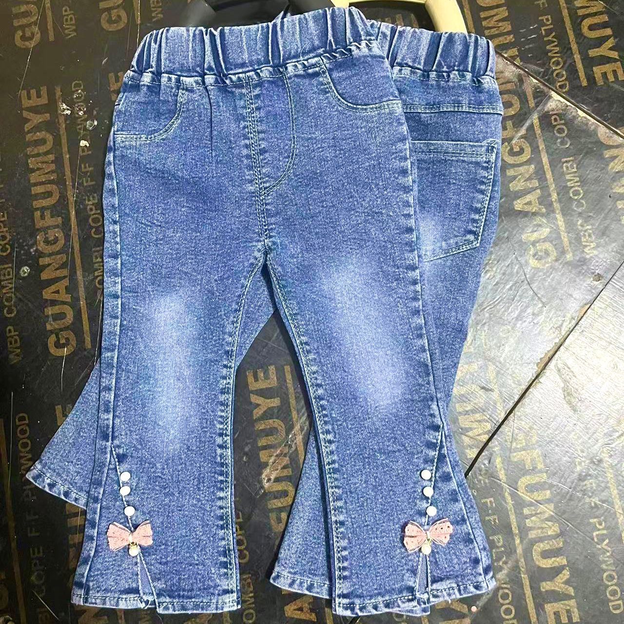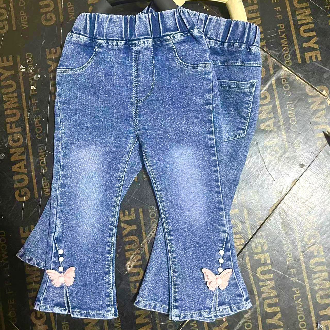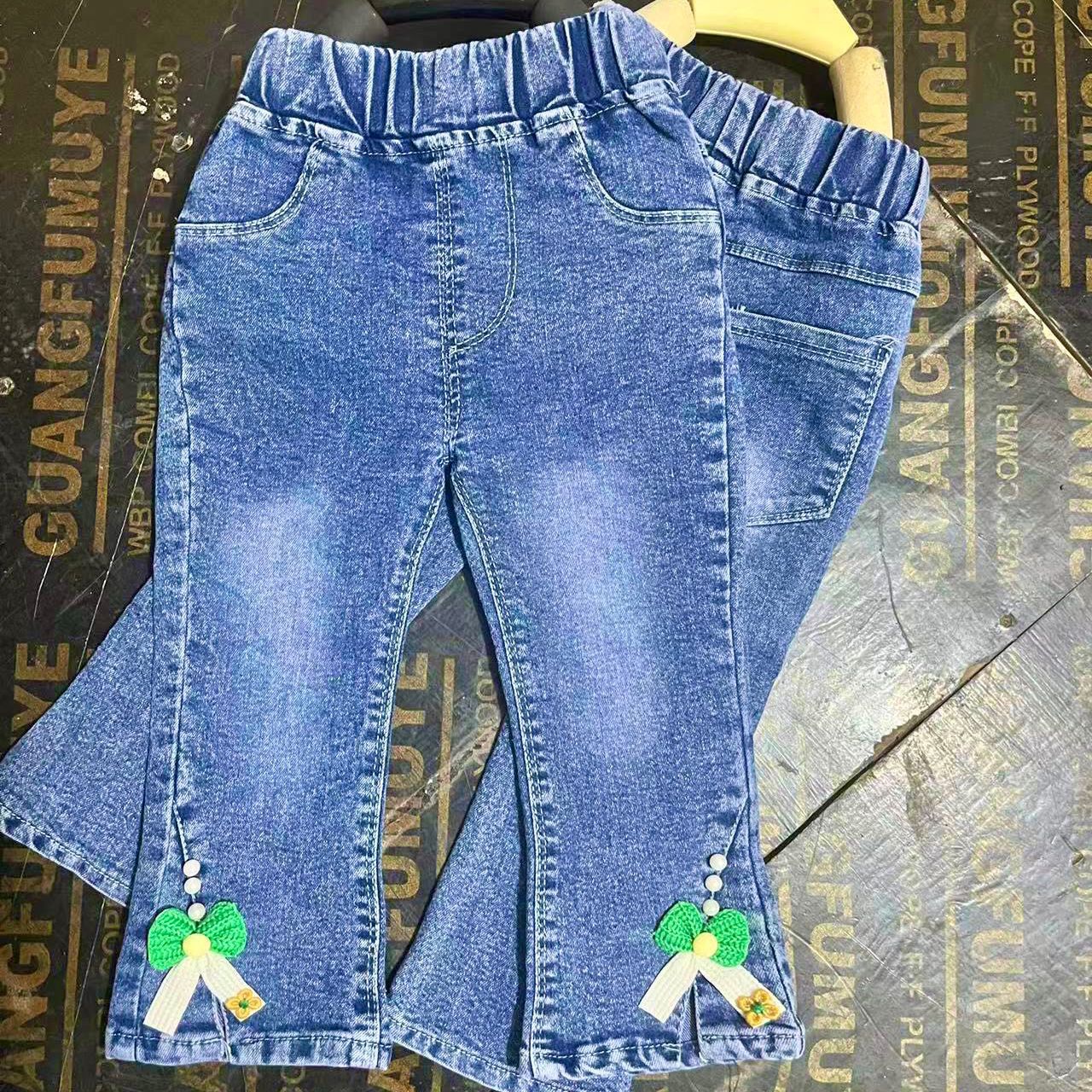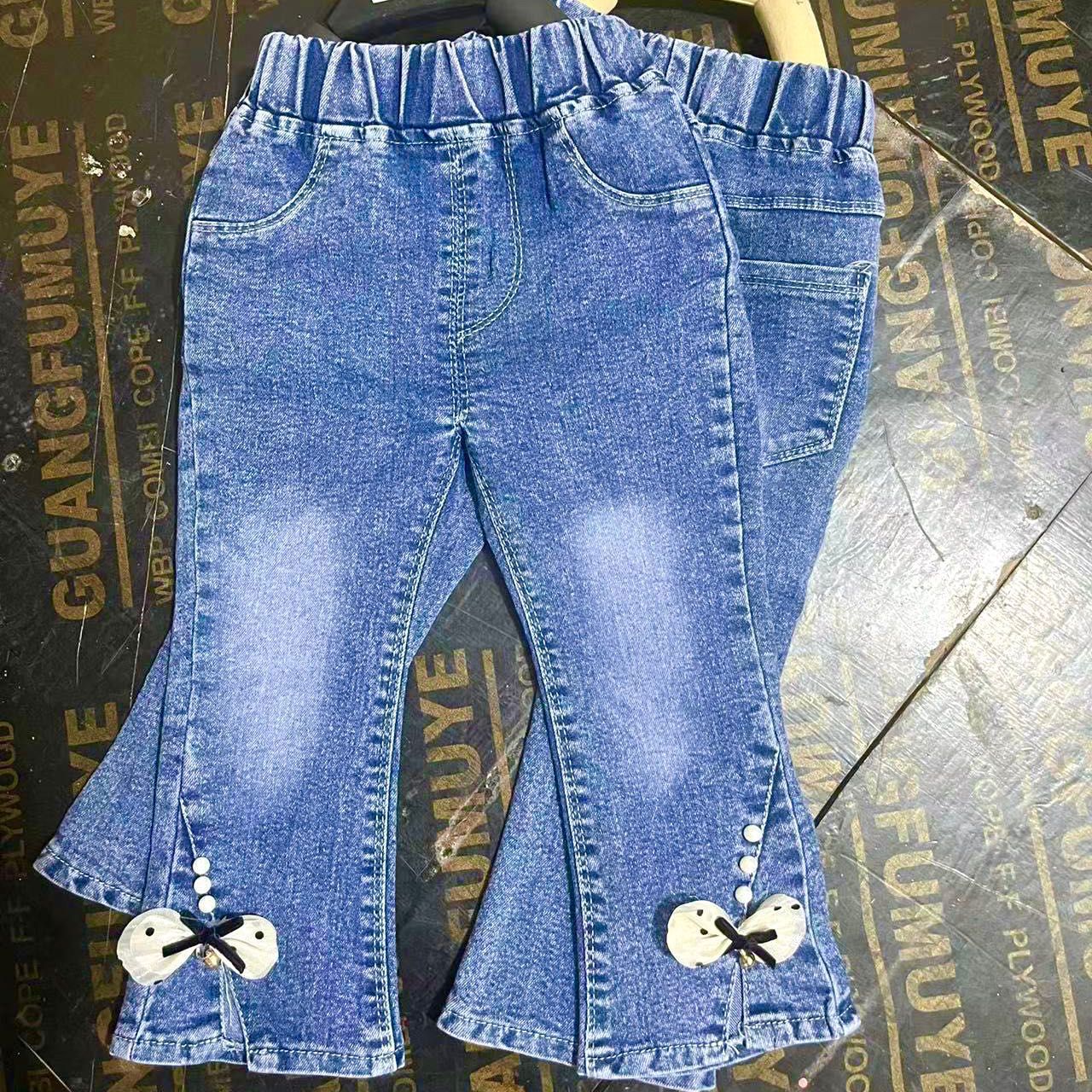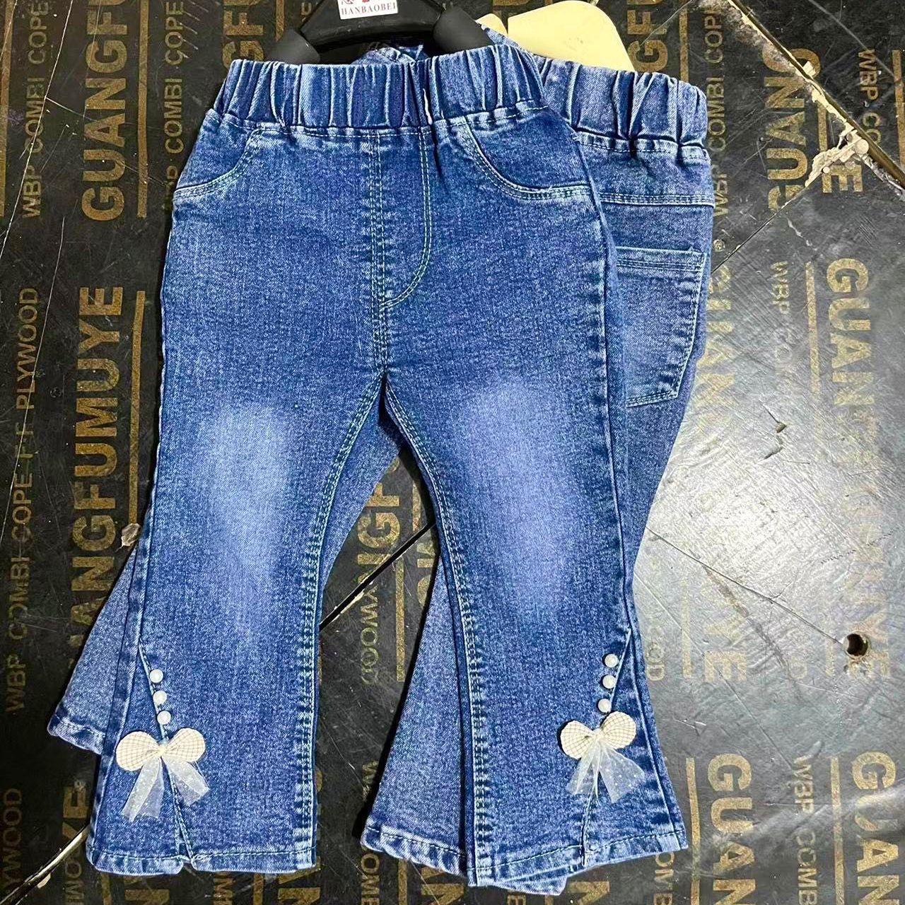 儿童牛仔裤春秋季男孩女孩长裤卡通弹力工装印花中小童宝宝喇叭裤