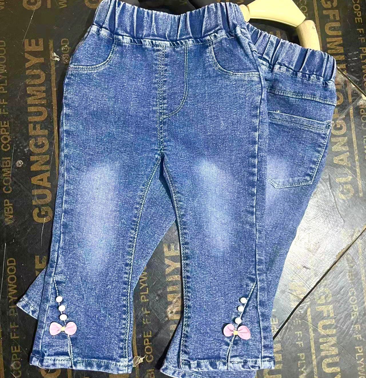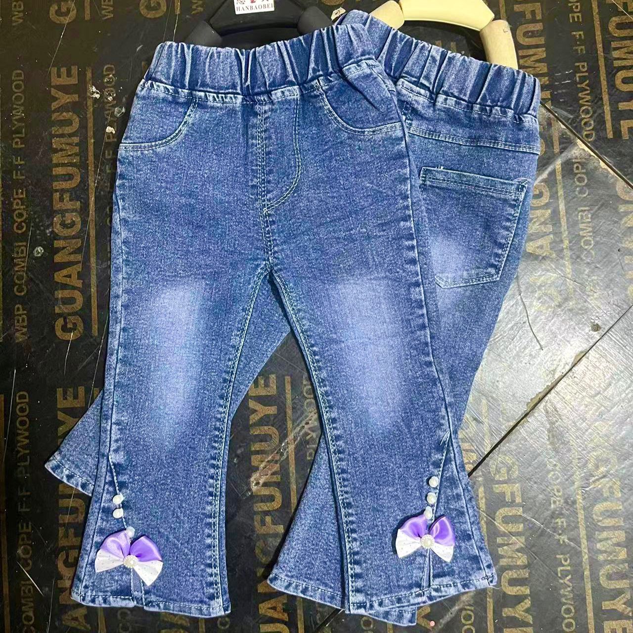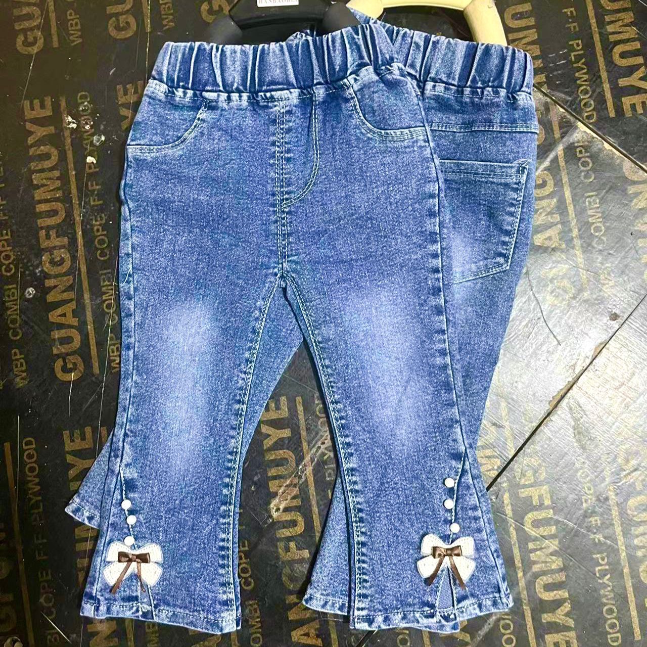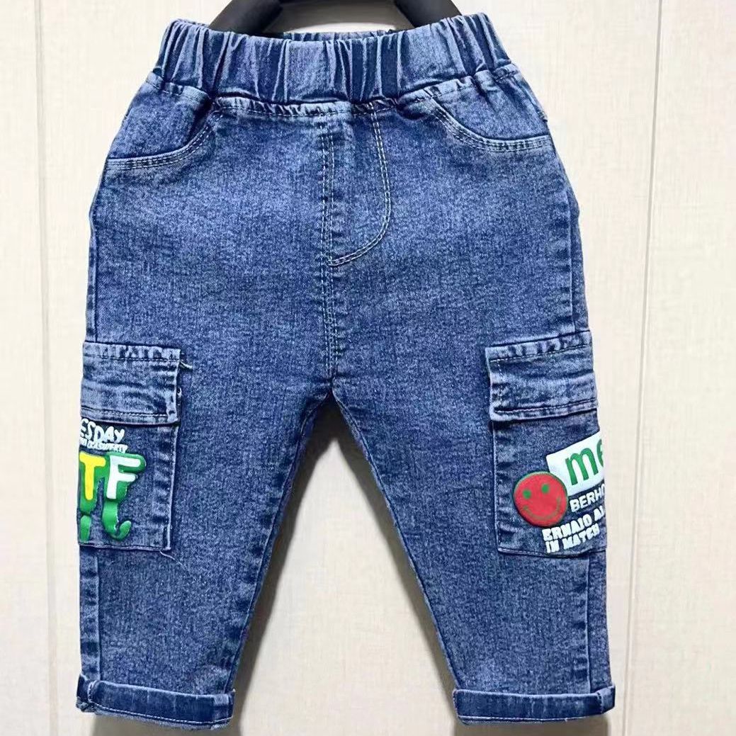 儿童牛仔裤春秋季男孩女孩长裤卡通弹力工装印花中小童宝宝喇叭裤