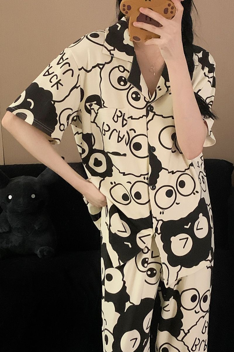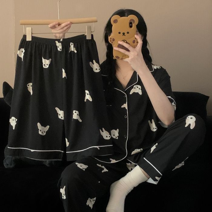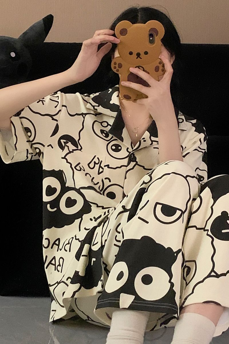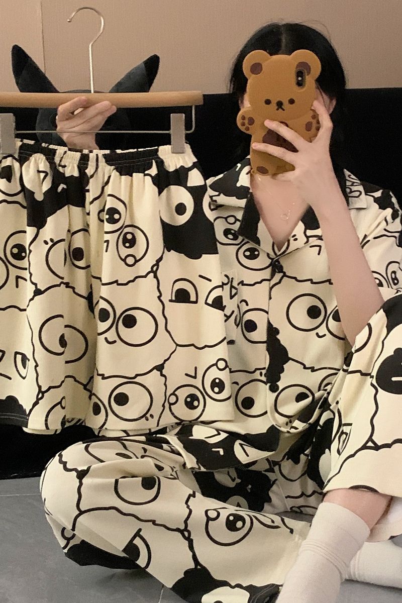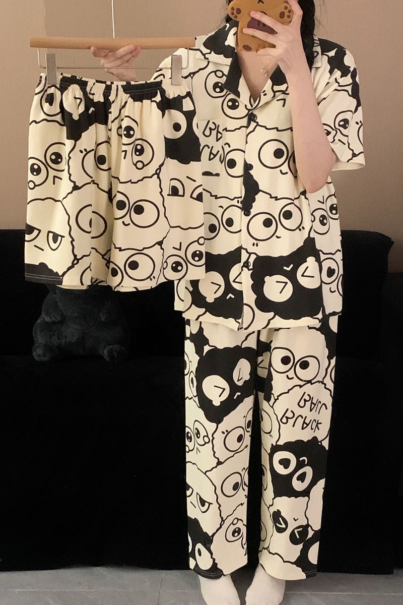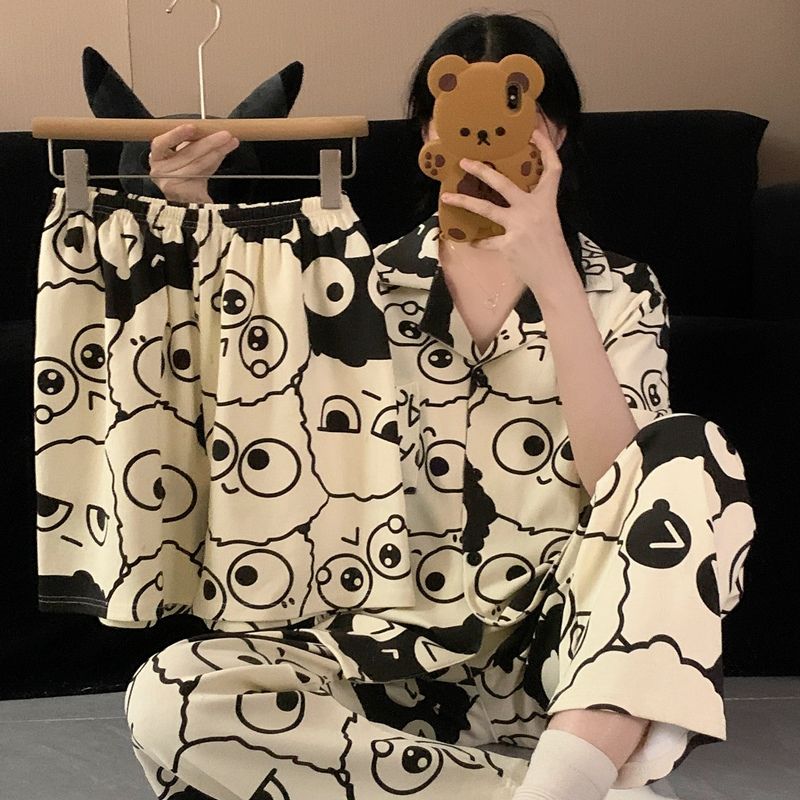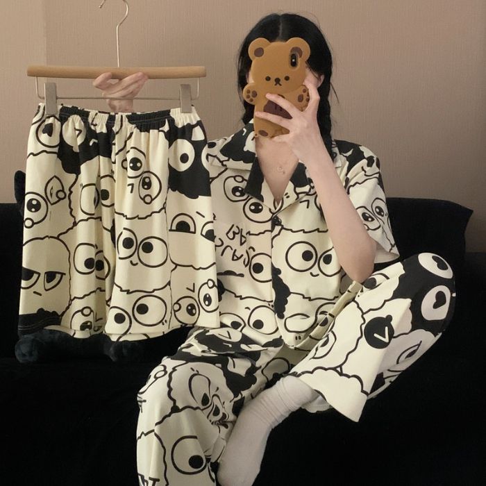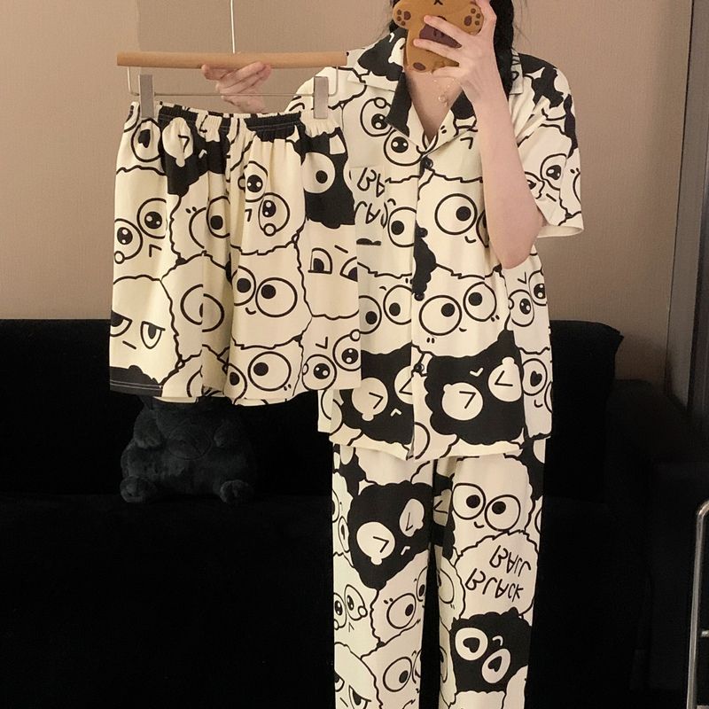 胖mm高颜值卡通煤球三件套短袖睡衣女学生夏季ins宽松大码家居服