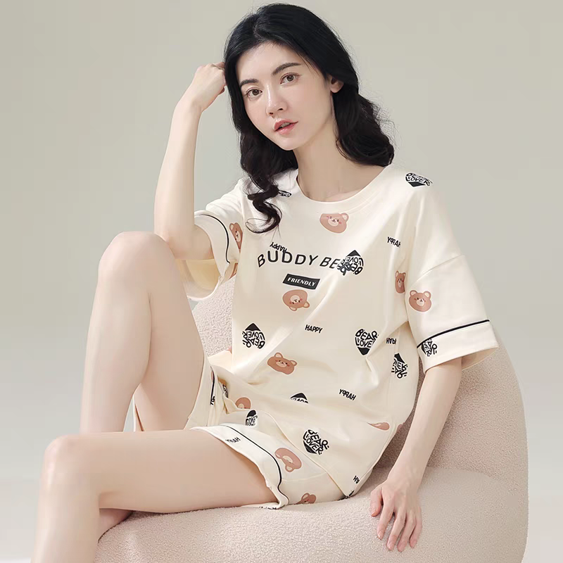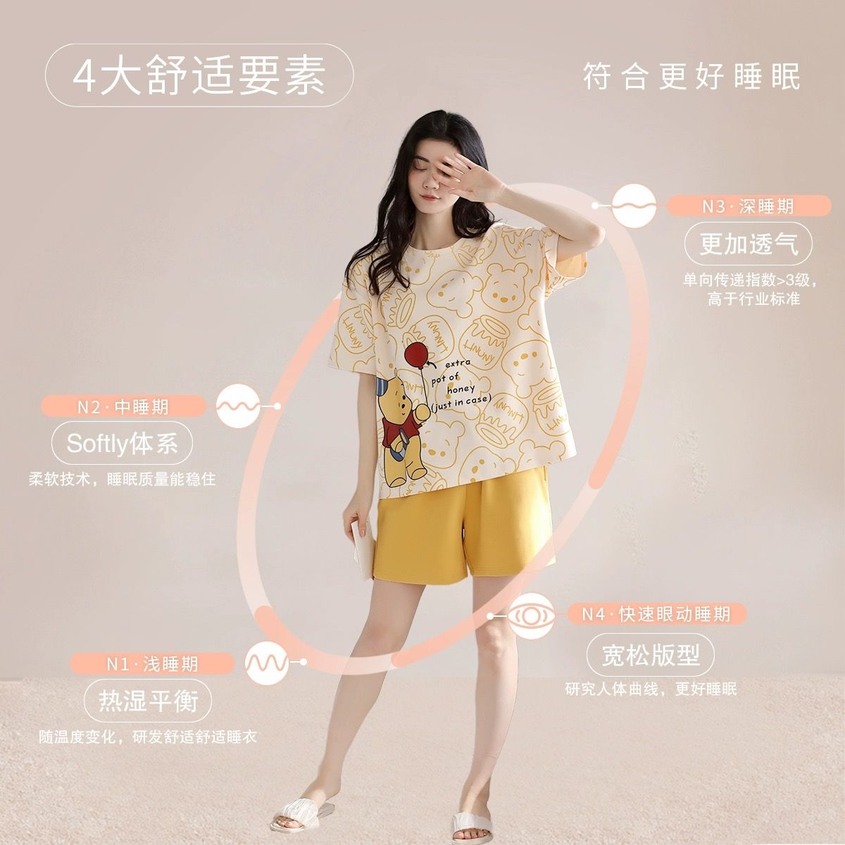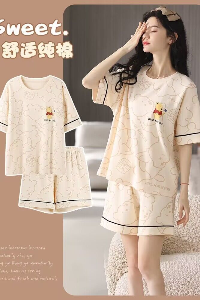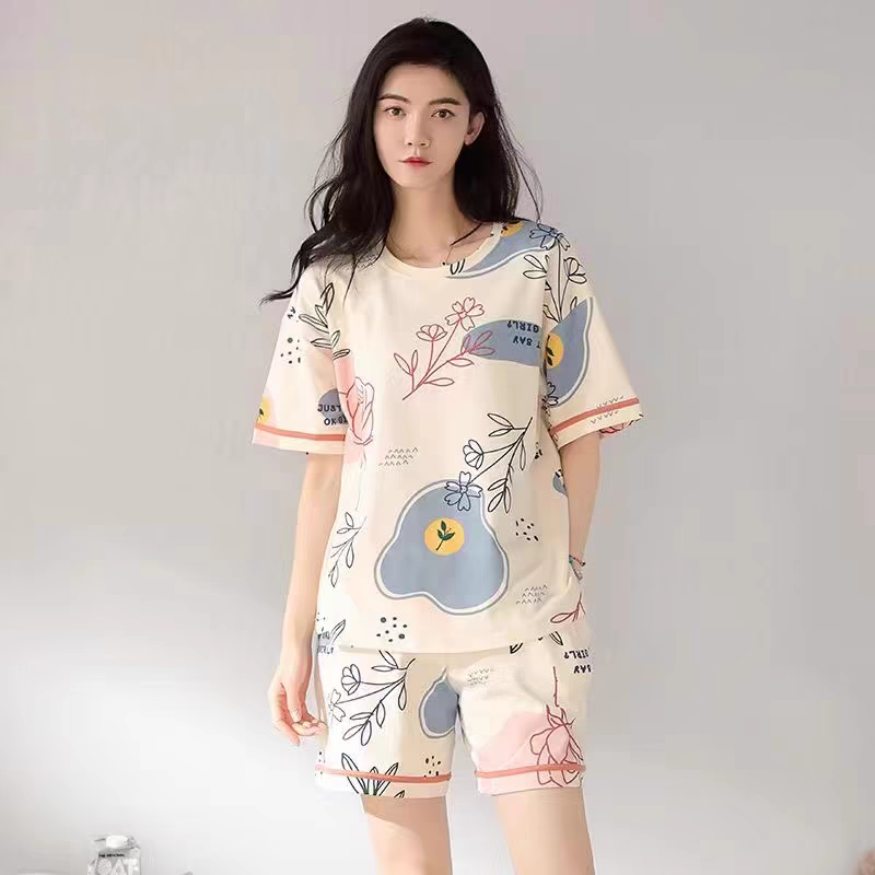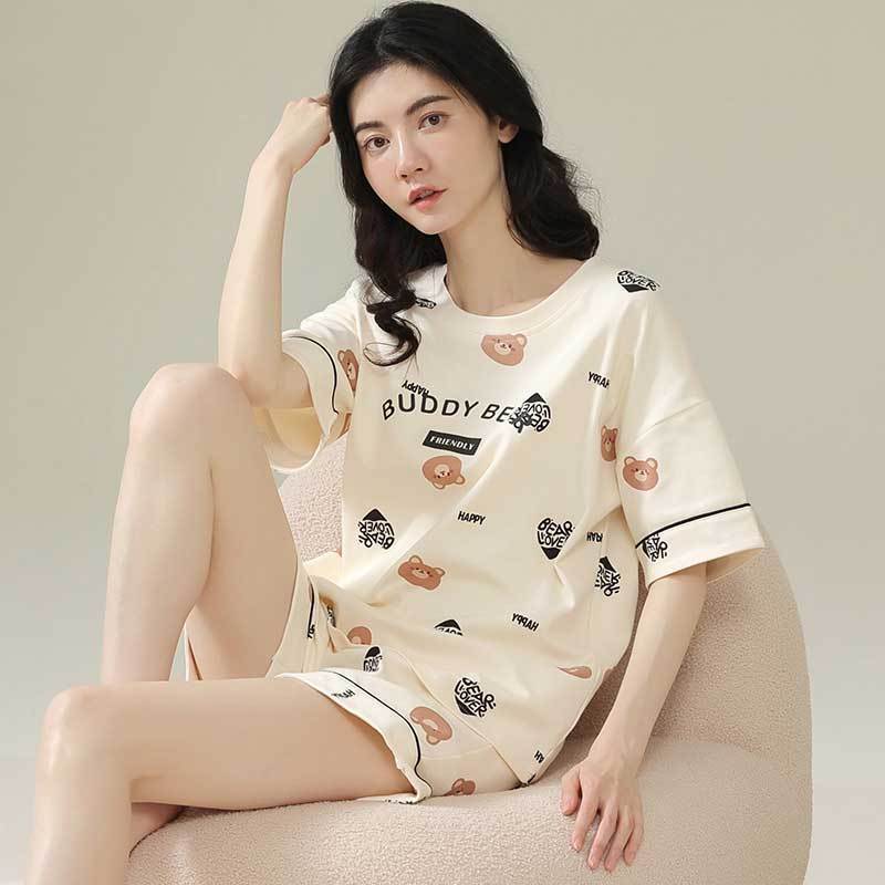 100%纯棉睡衣女短袖短裤可外穿韩版可爱圆领全棉家居服套装