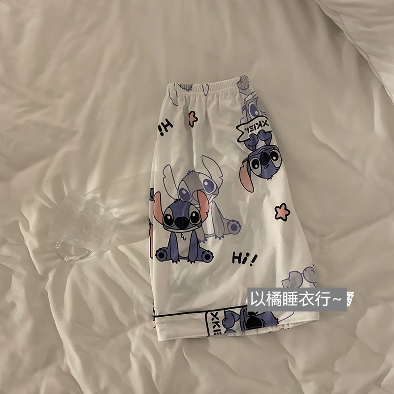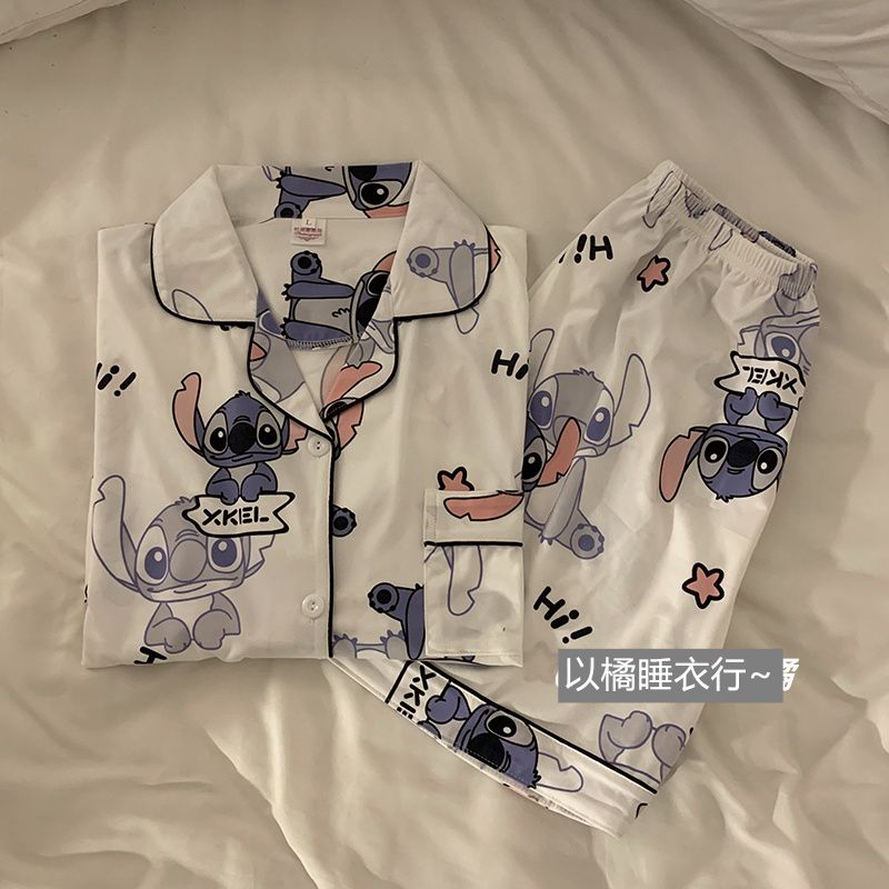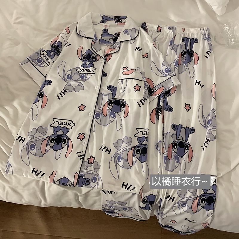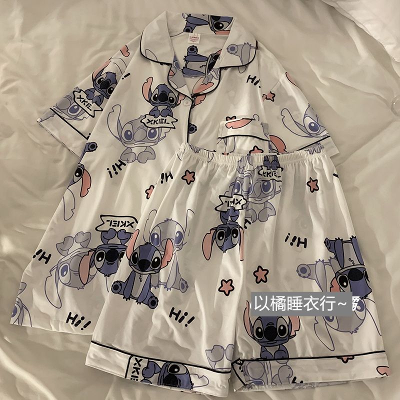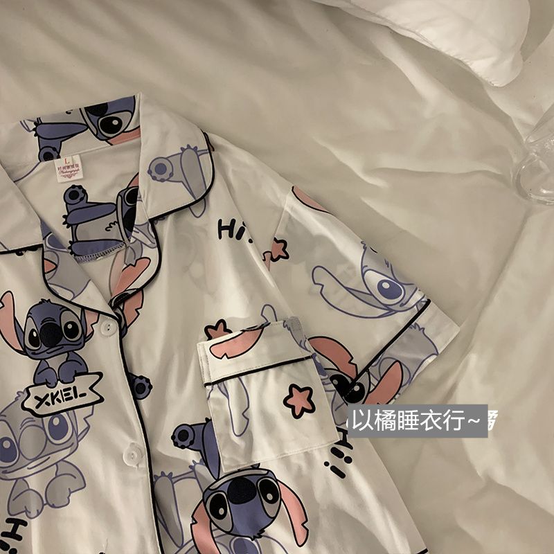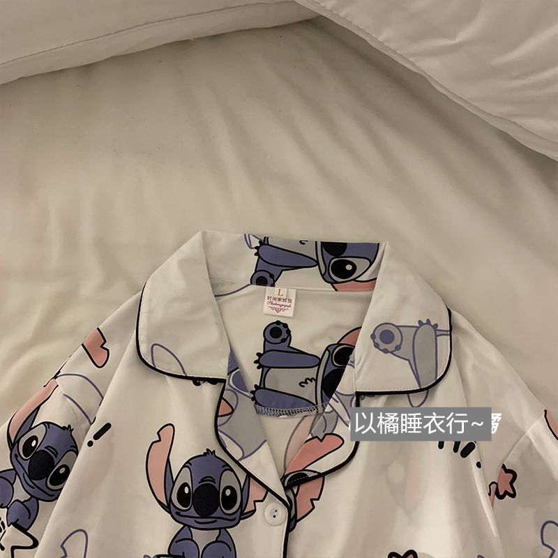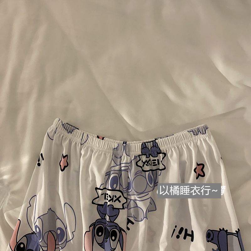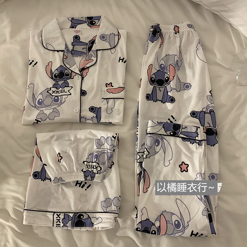 史迪仔三件套睡衣女夏季短袖卡通印花可爱薄款网红家居服大码套装