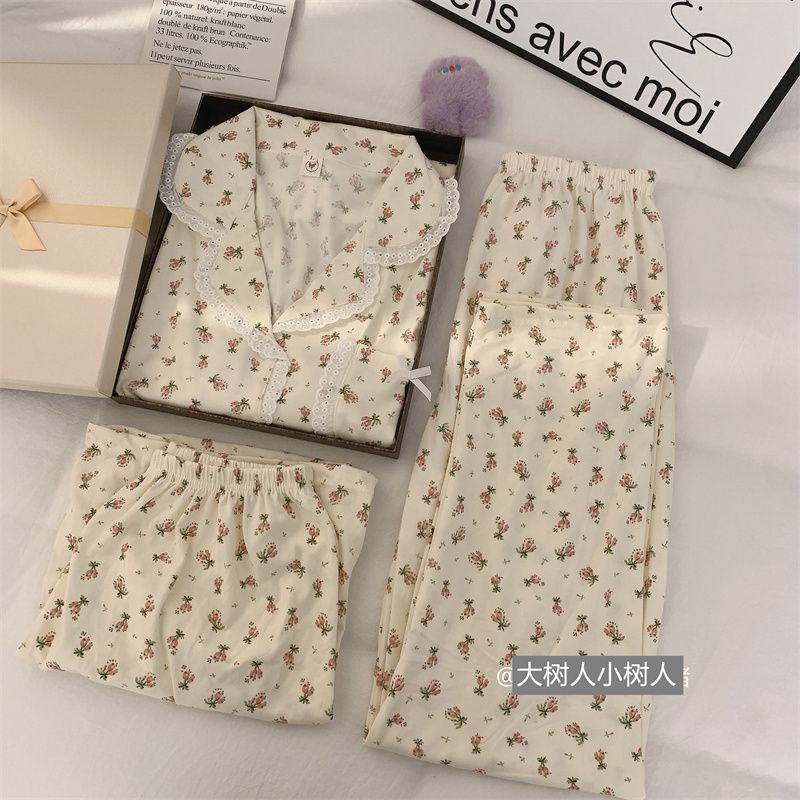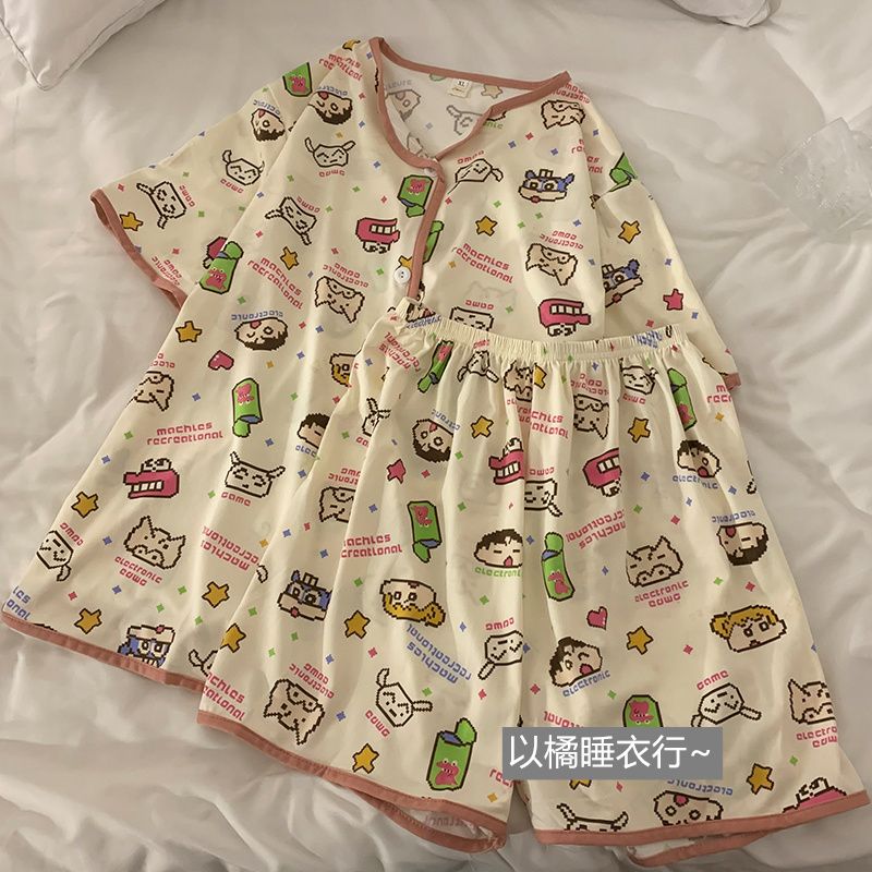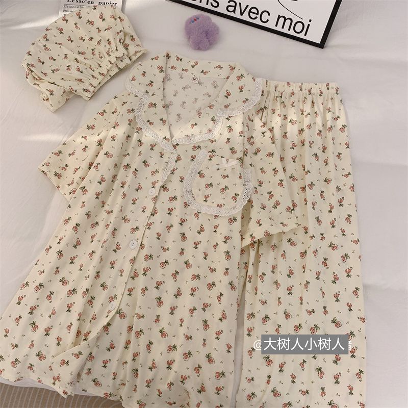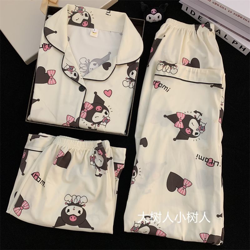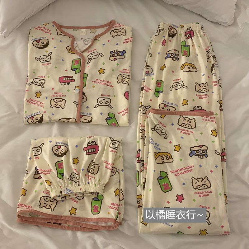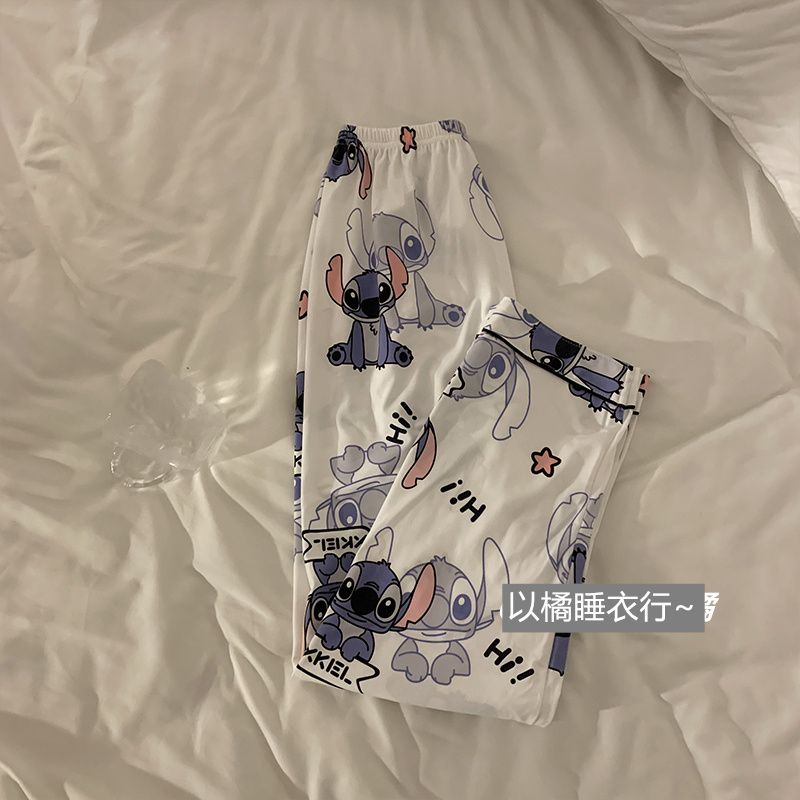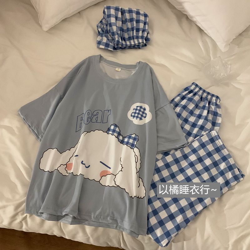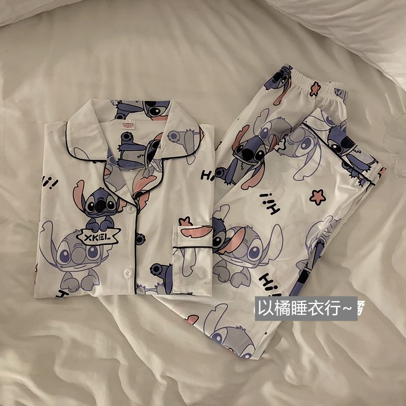史迪仔三件套睡衣女夏季短袖卡通印花可爱薄款网红家居服大码套装