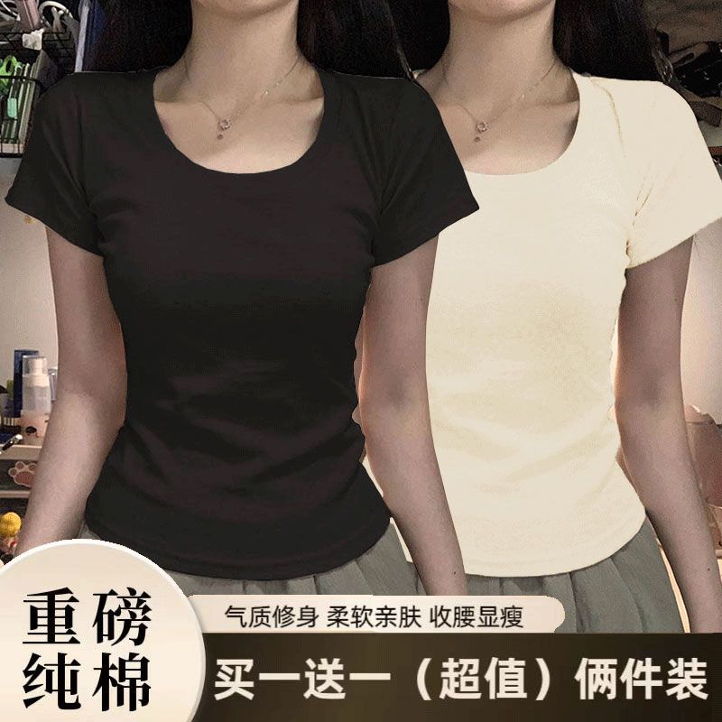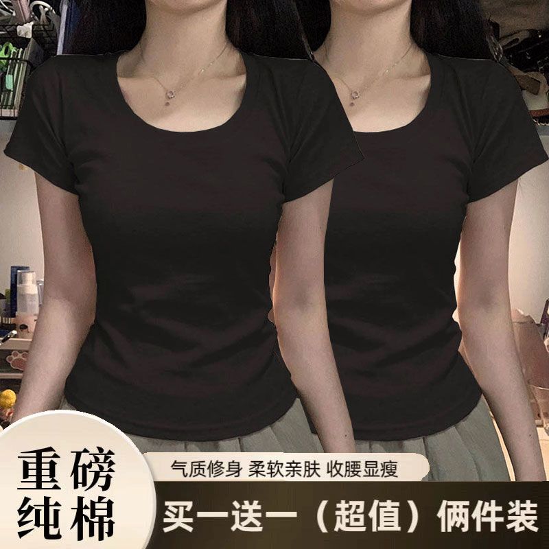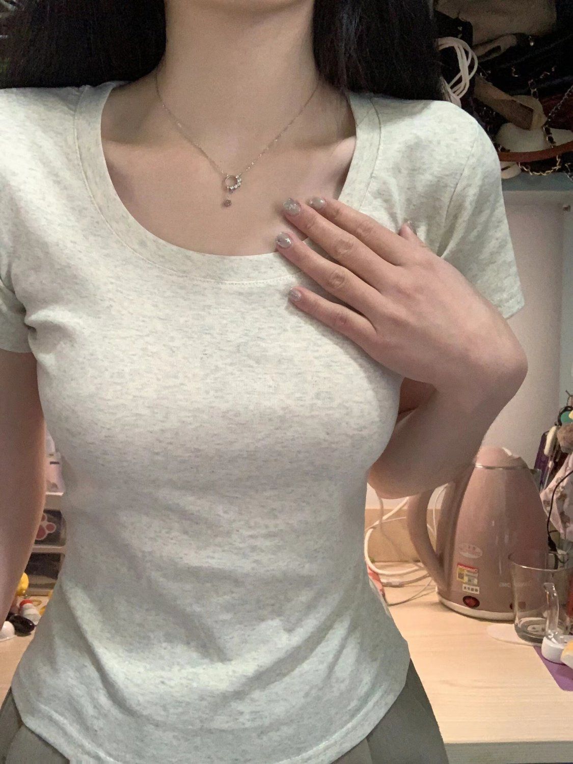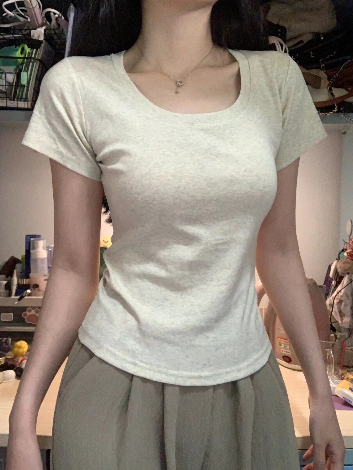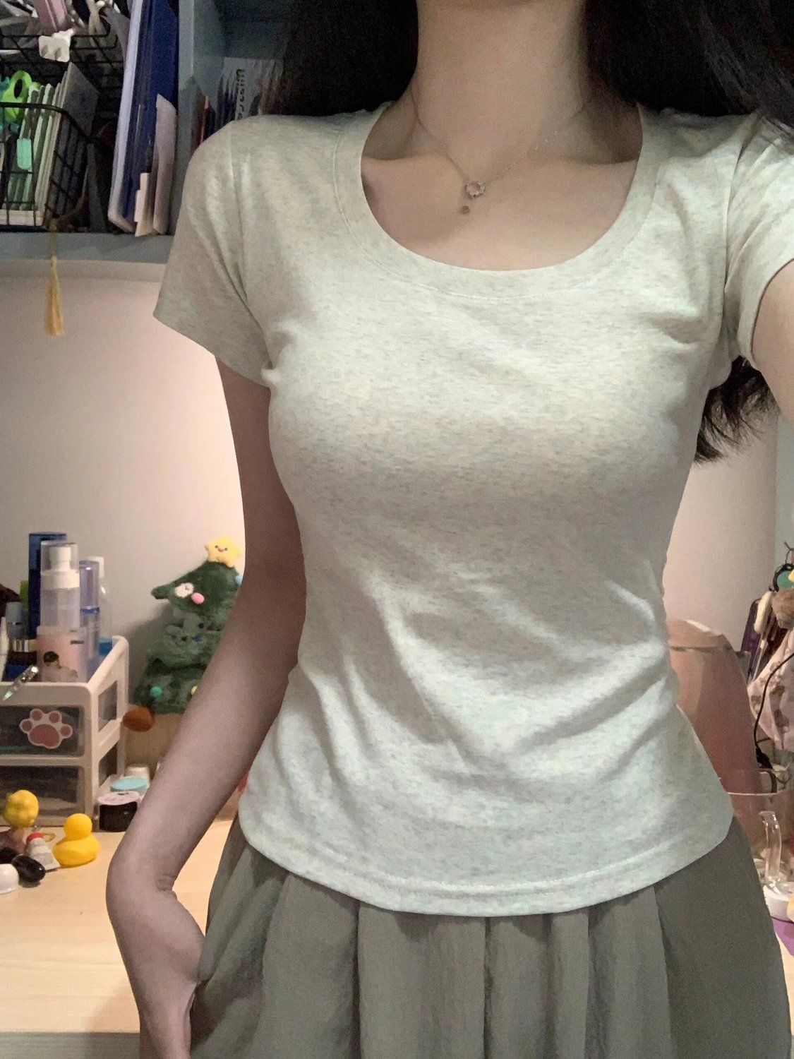 END韩版简约正肩t恤短袖女新款U领纯棉设计修身显瘦百搭ins上衣