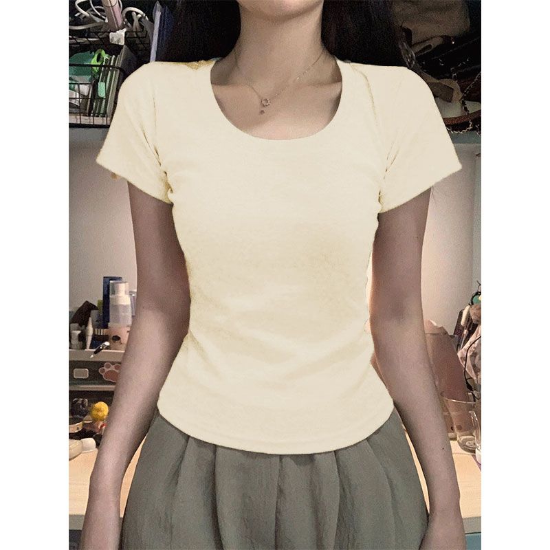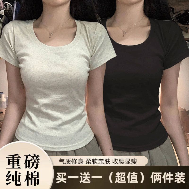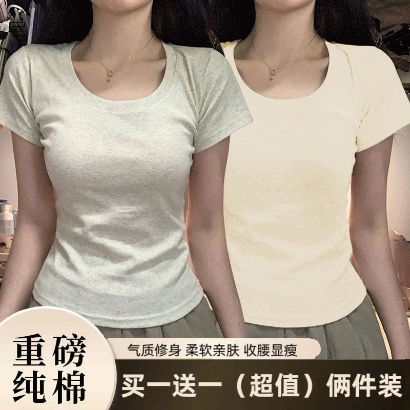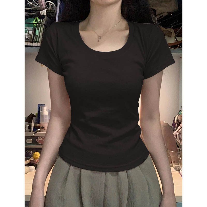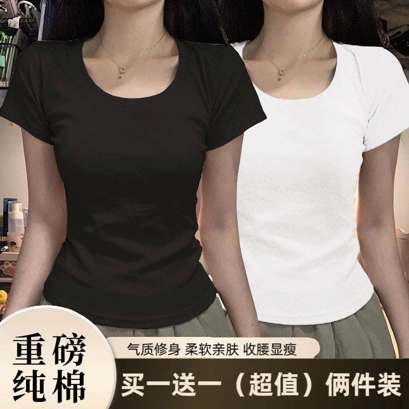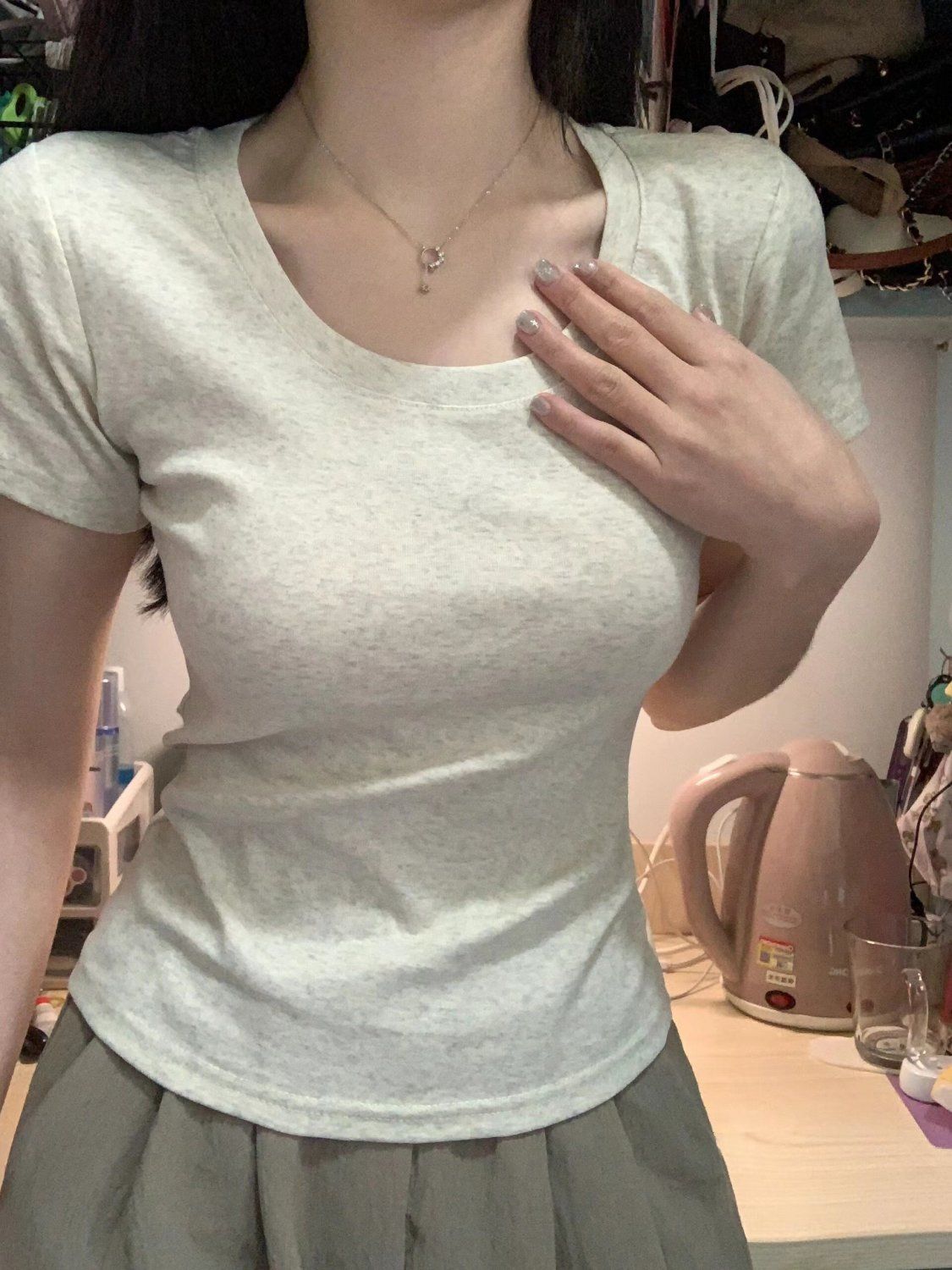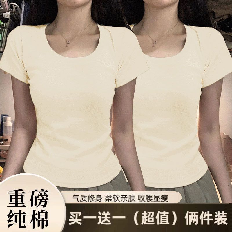 END韩版简约正肩t恤短袖女新款U领纯棉设计修身显瘦百搭ins上衣