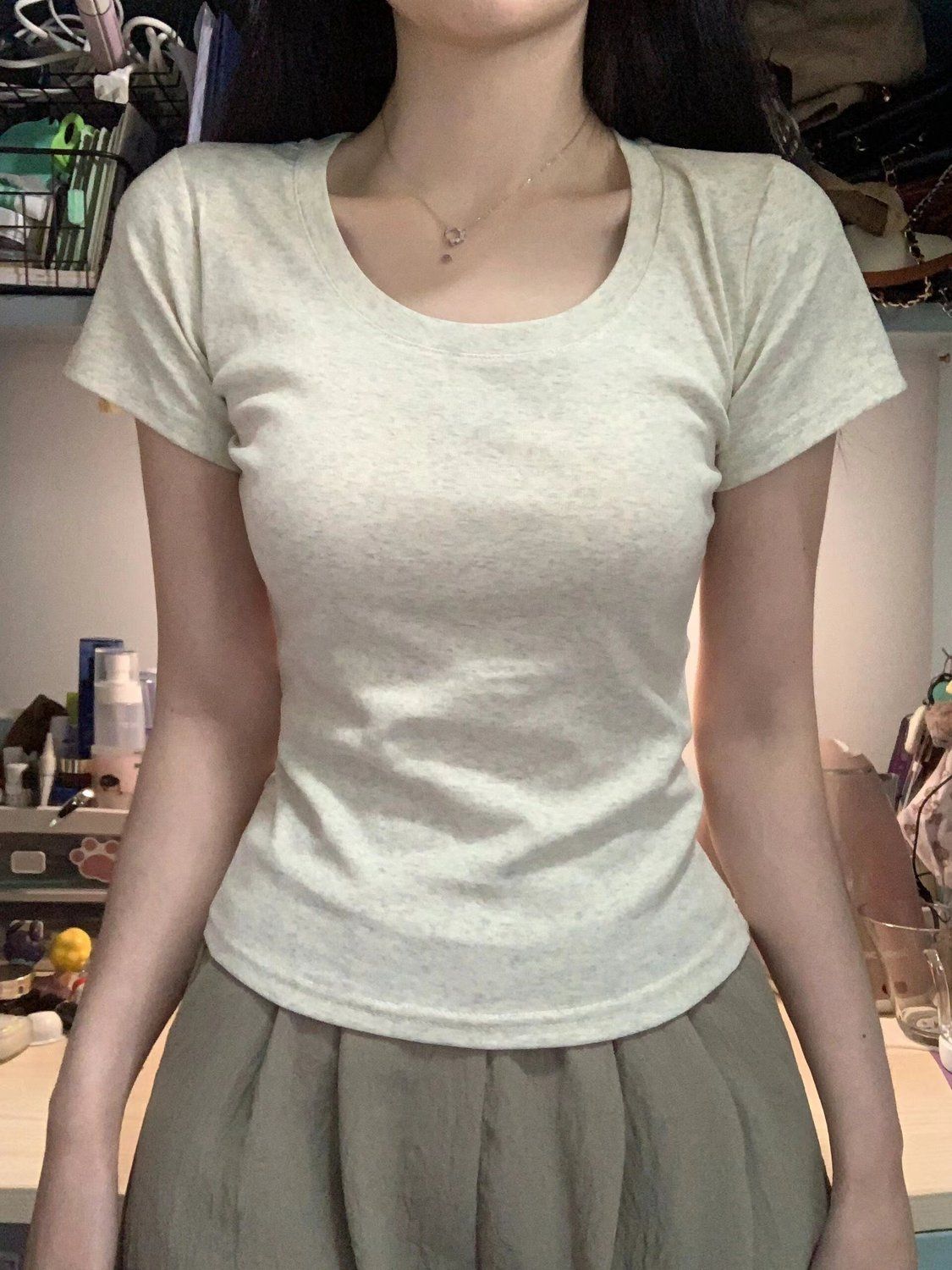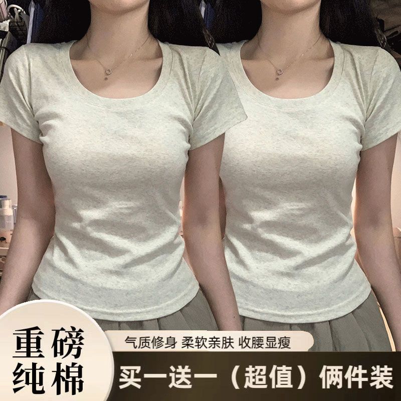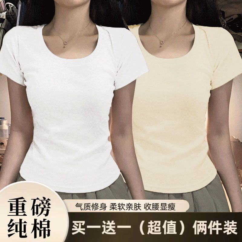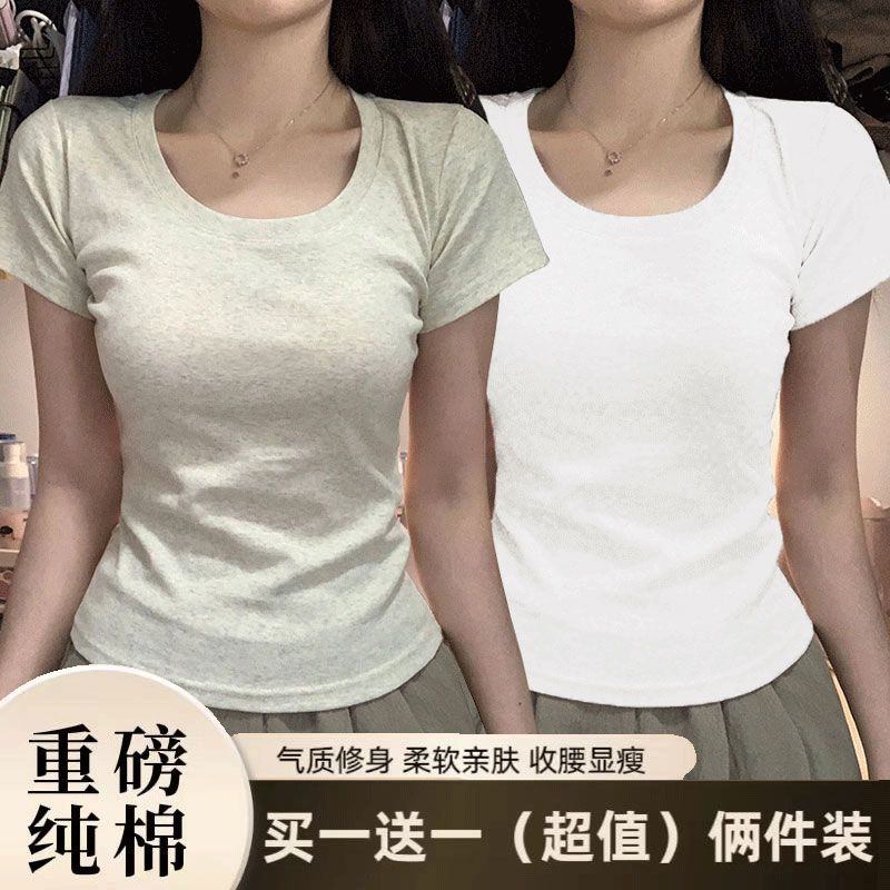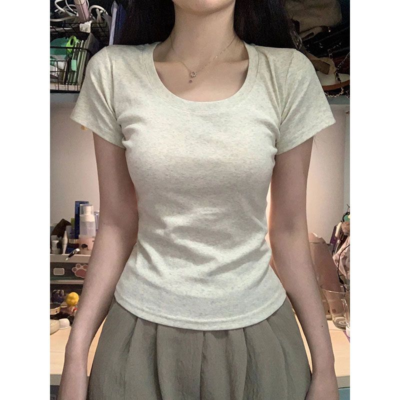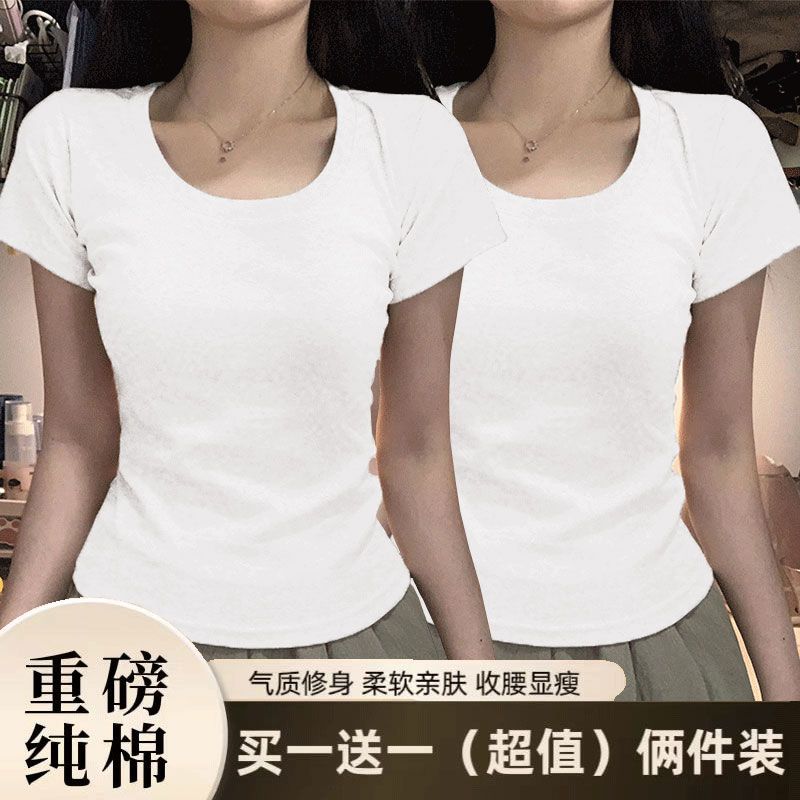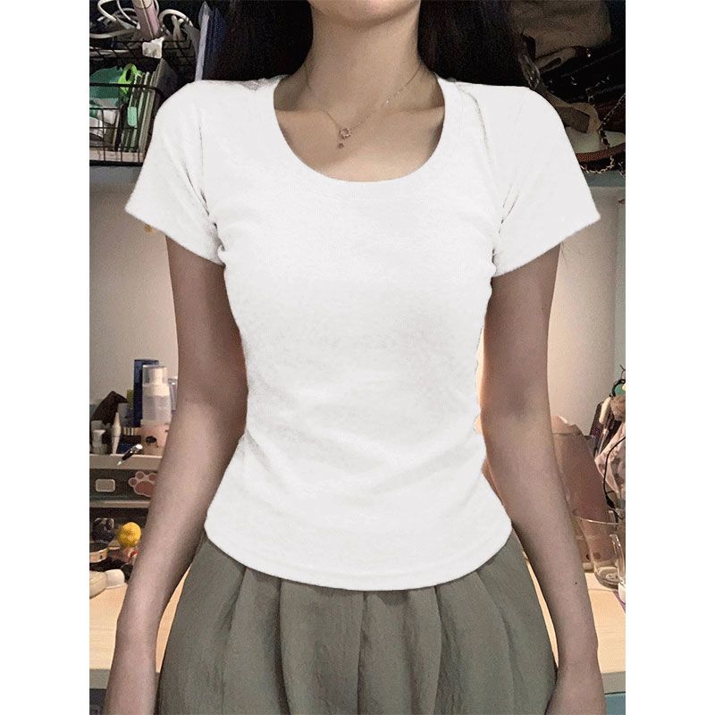 END韩版简约正肩t恤短袖女新款U领纯棉设计修身显瘦百搭ins上衣