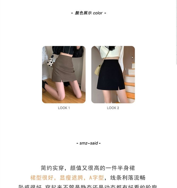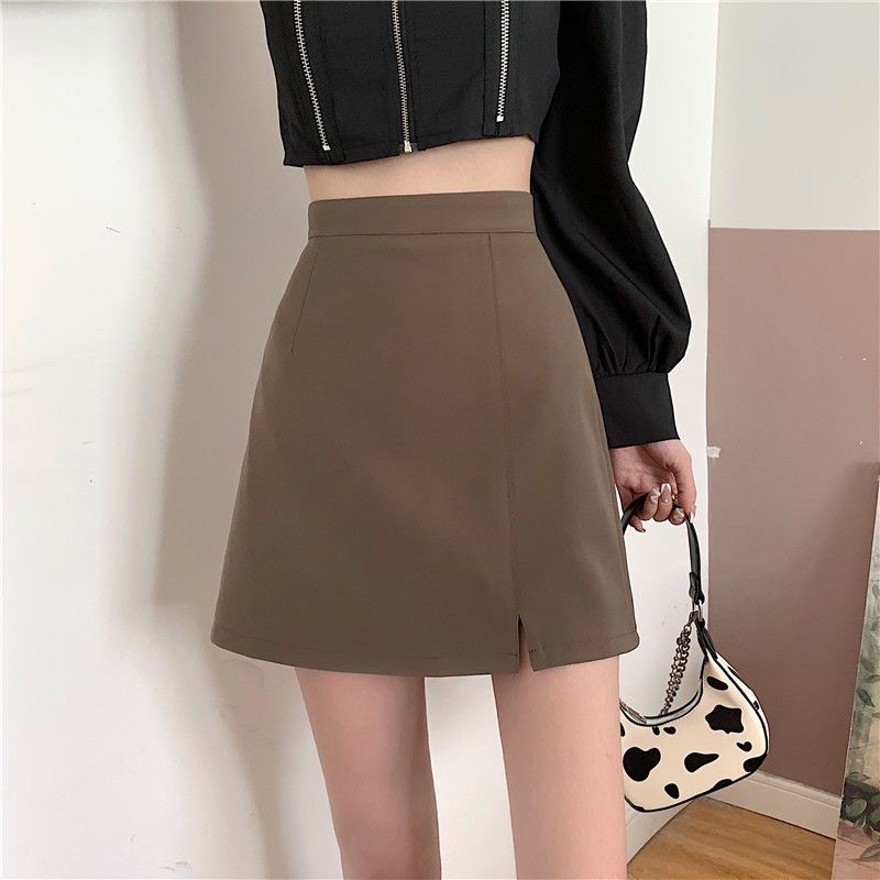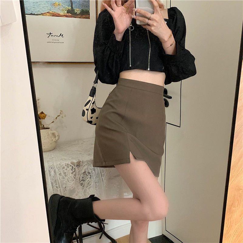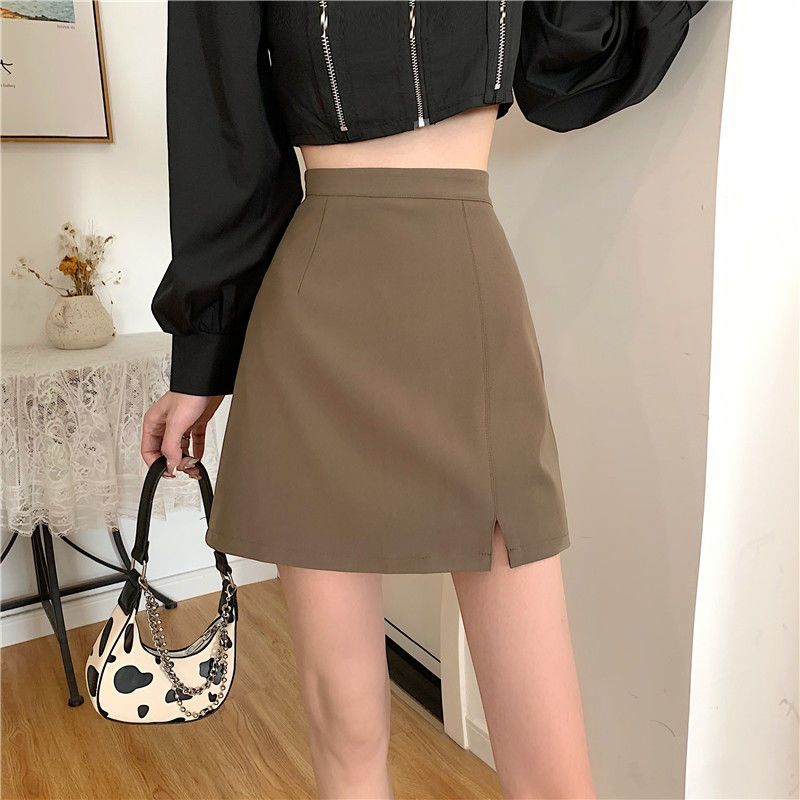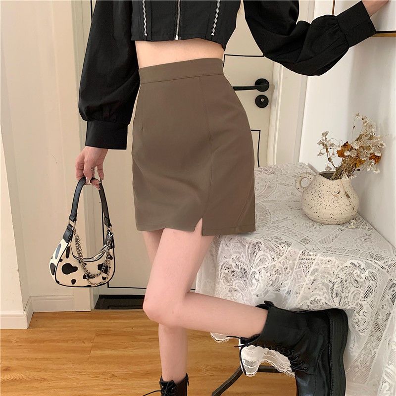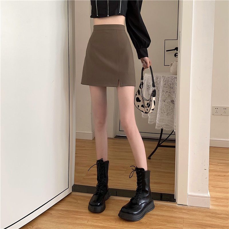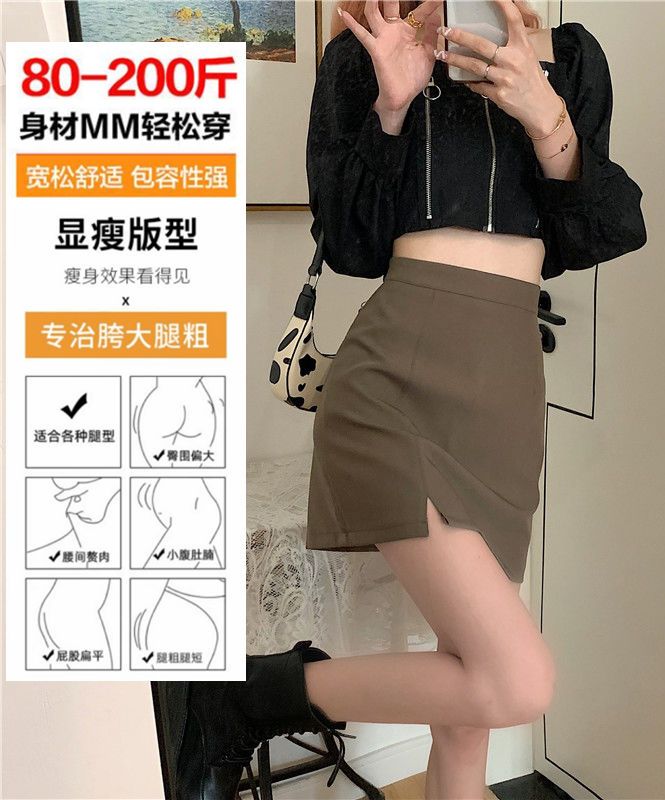 大码胖mm咖色开叉西装半身裙女夏季高腰包臀a字裙一步裙遮胯短裙