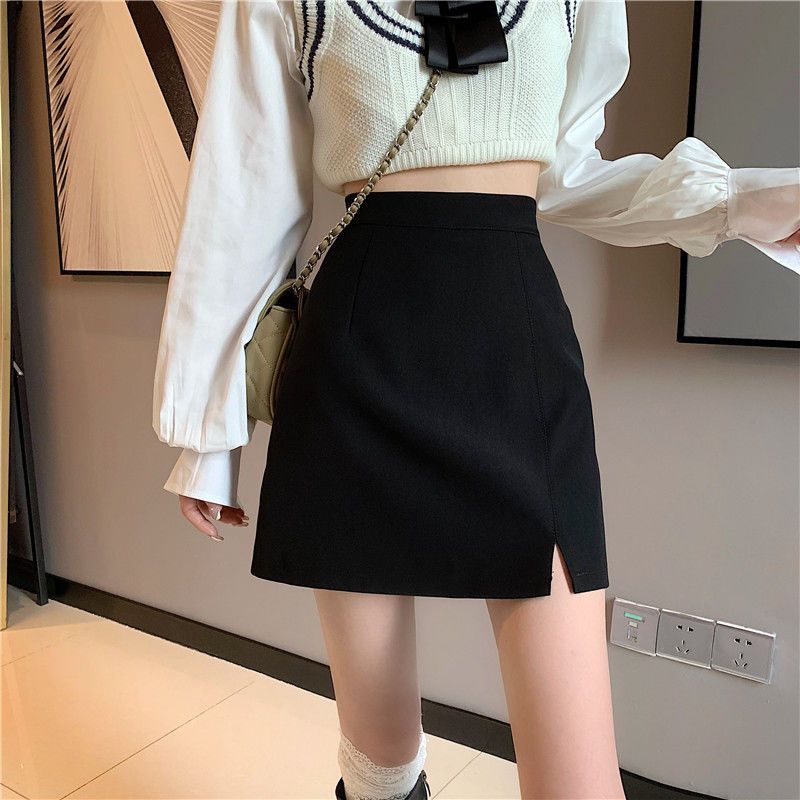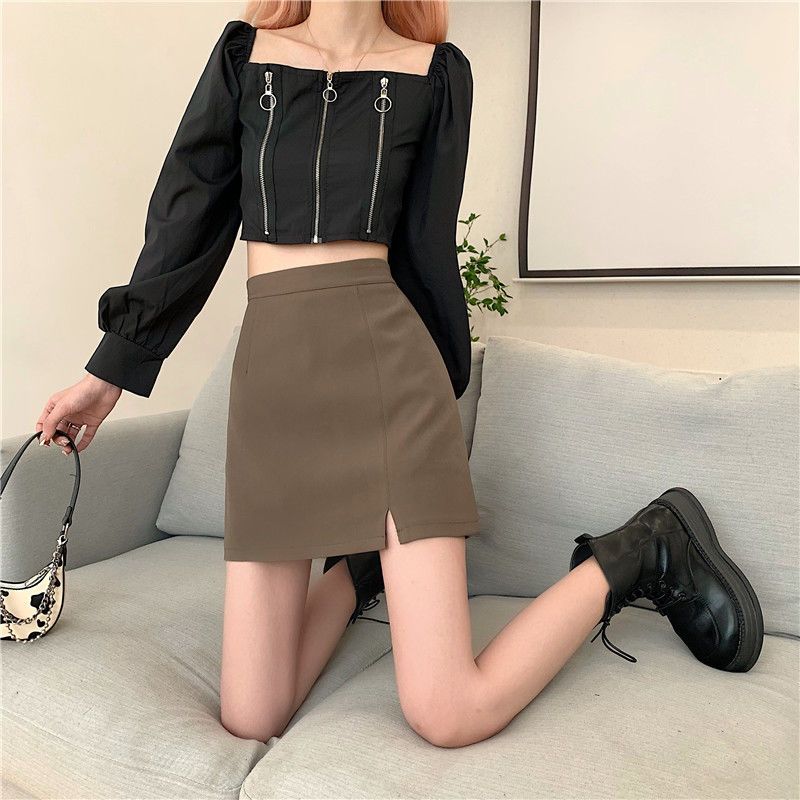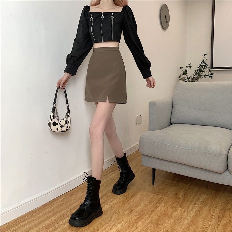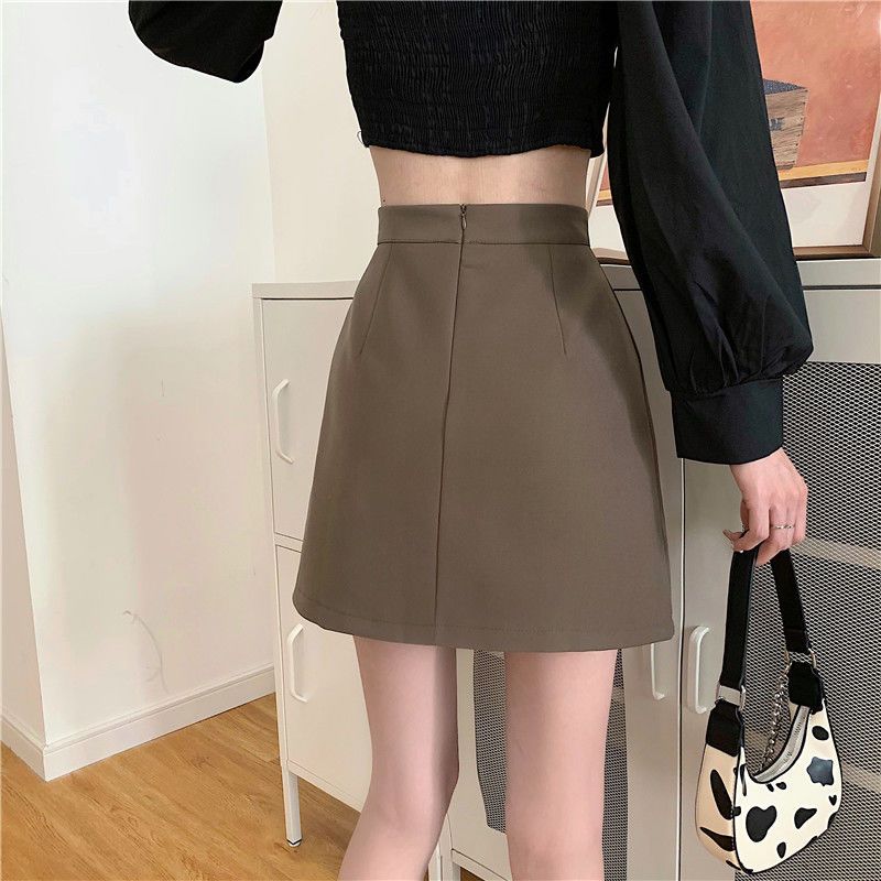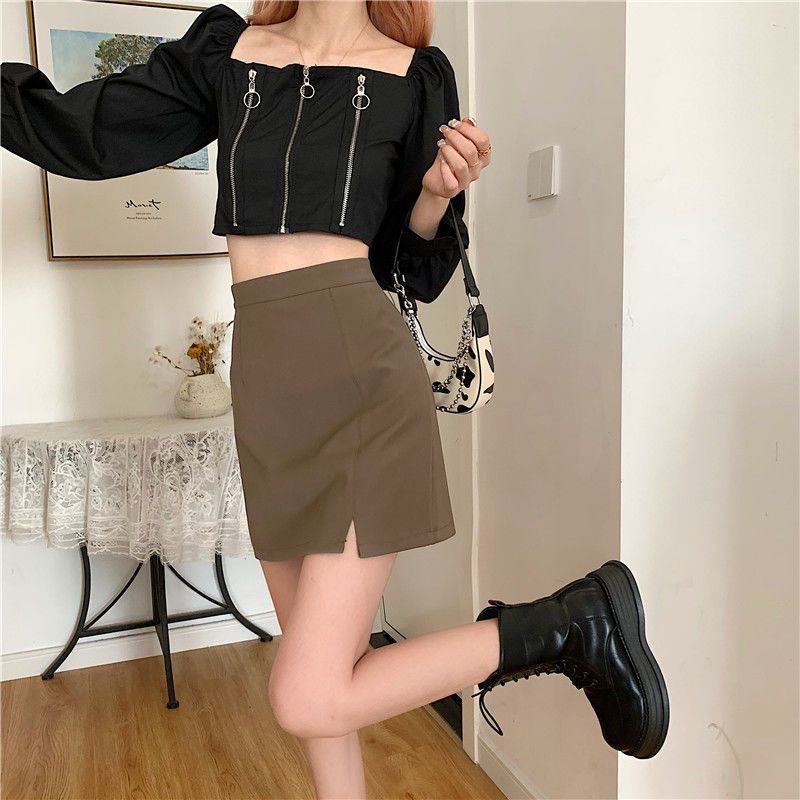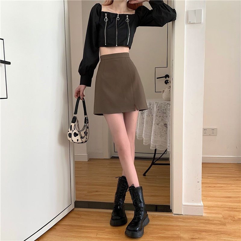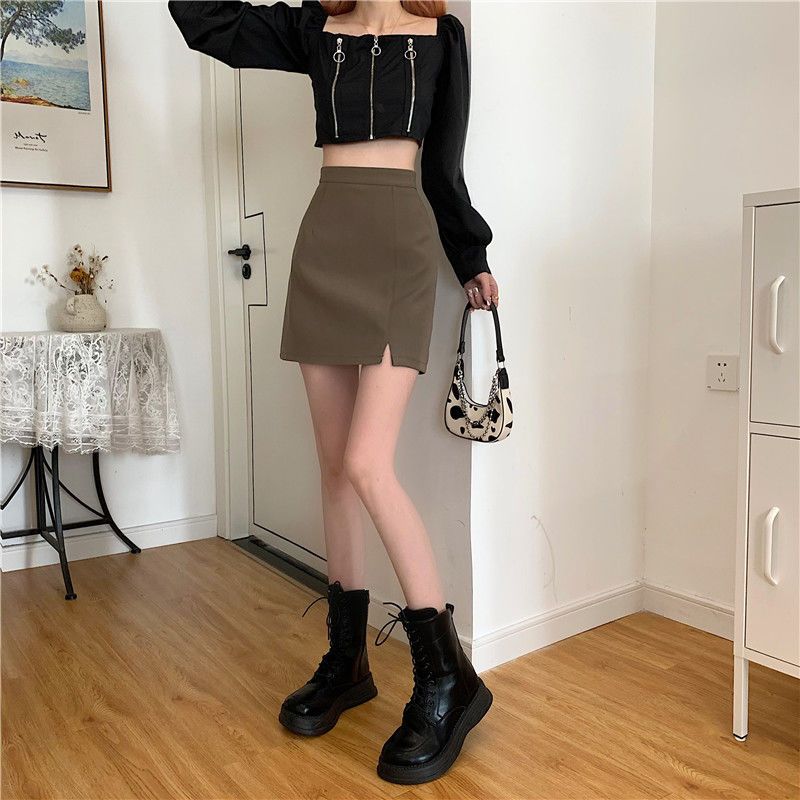 大码胖mm咖色开叉西装半身裙女夏季高腰包臀a字裙一步裙遮胯短裙