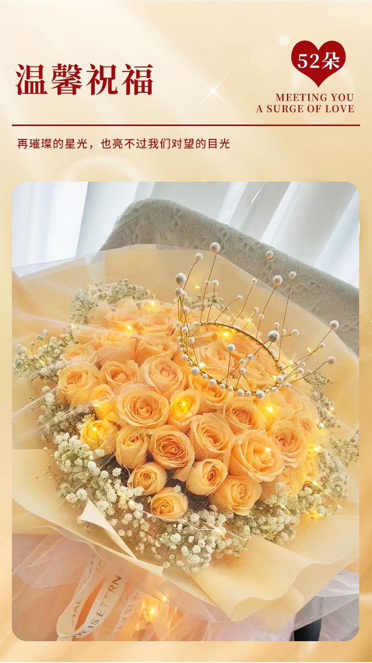 | 52 flowers champagne rose + crown(52朵香槟玫瑰+皇冠) | USD $34.62 | 99999 piece available |