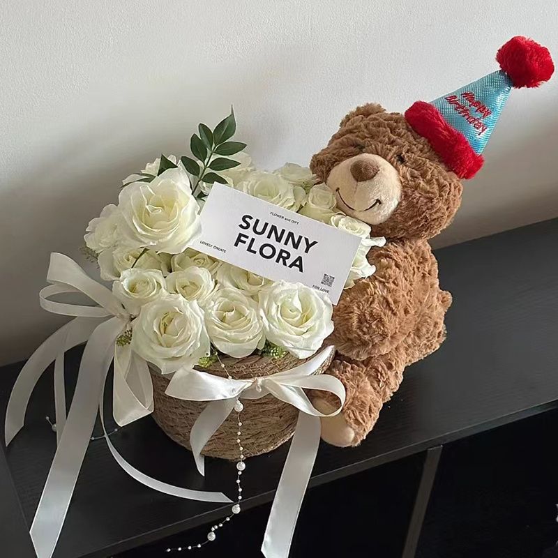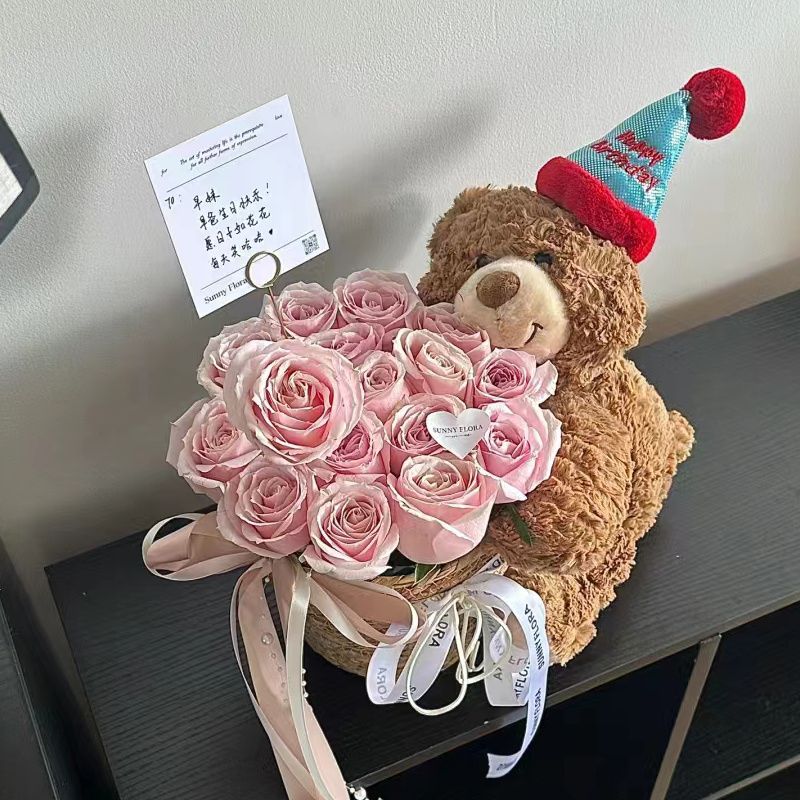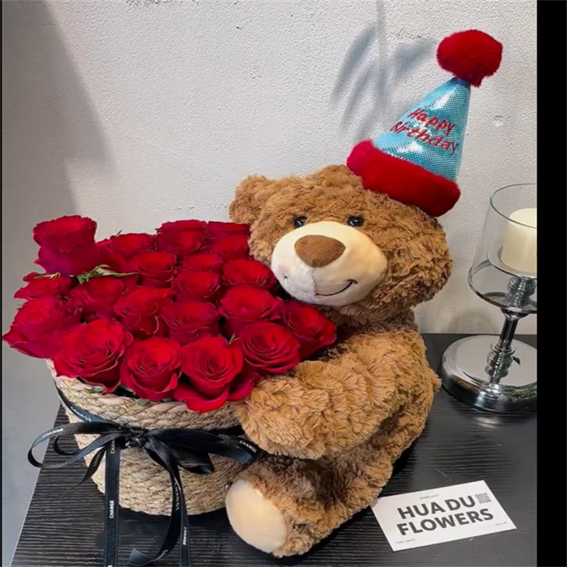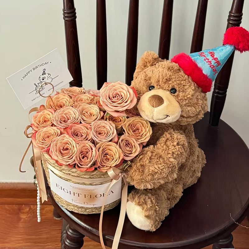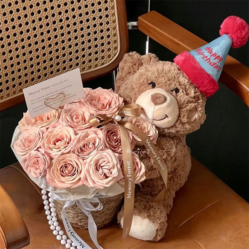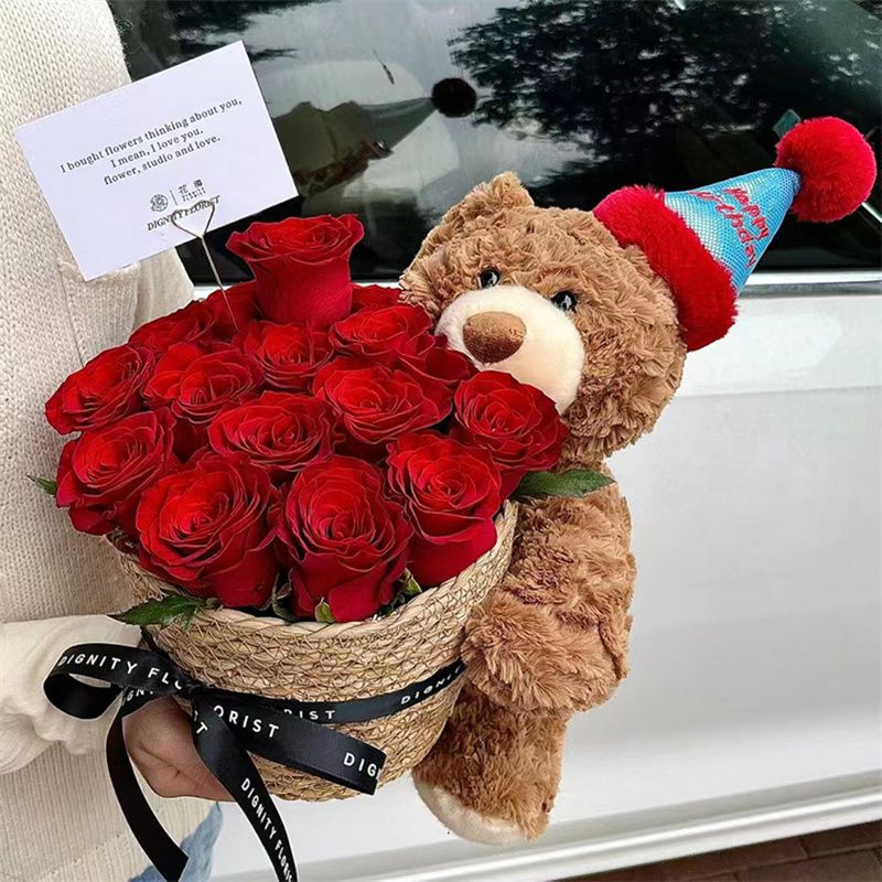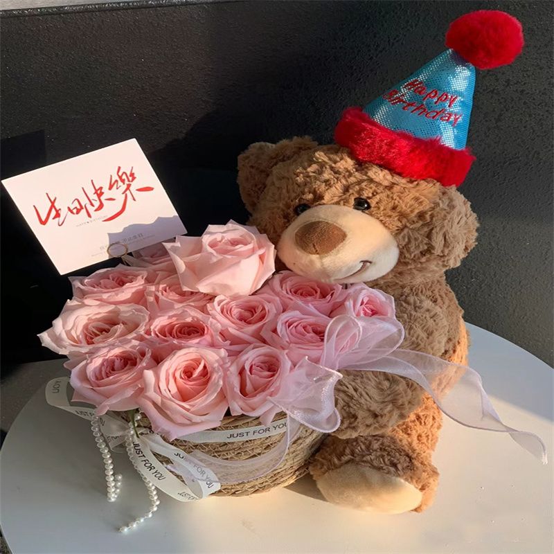 生日熊玫瑰仿真花抱抱桶情人节送女友闺蜜生日礼物高级感永久花束