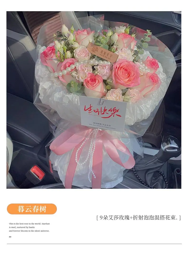 | [twilight spring tree] 9 aisha roses + refraction bubble mixed bouquet(【暮云春树】9朵艾莎玫瑰+折射泡泡混搭花束) | USD $23.02 | 99999 piece available |