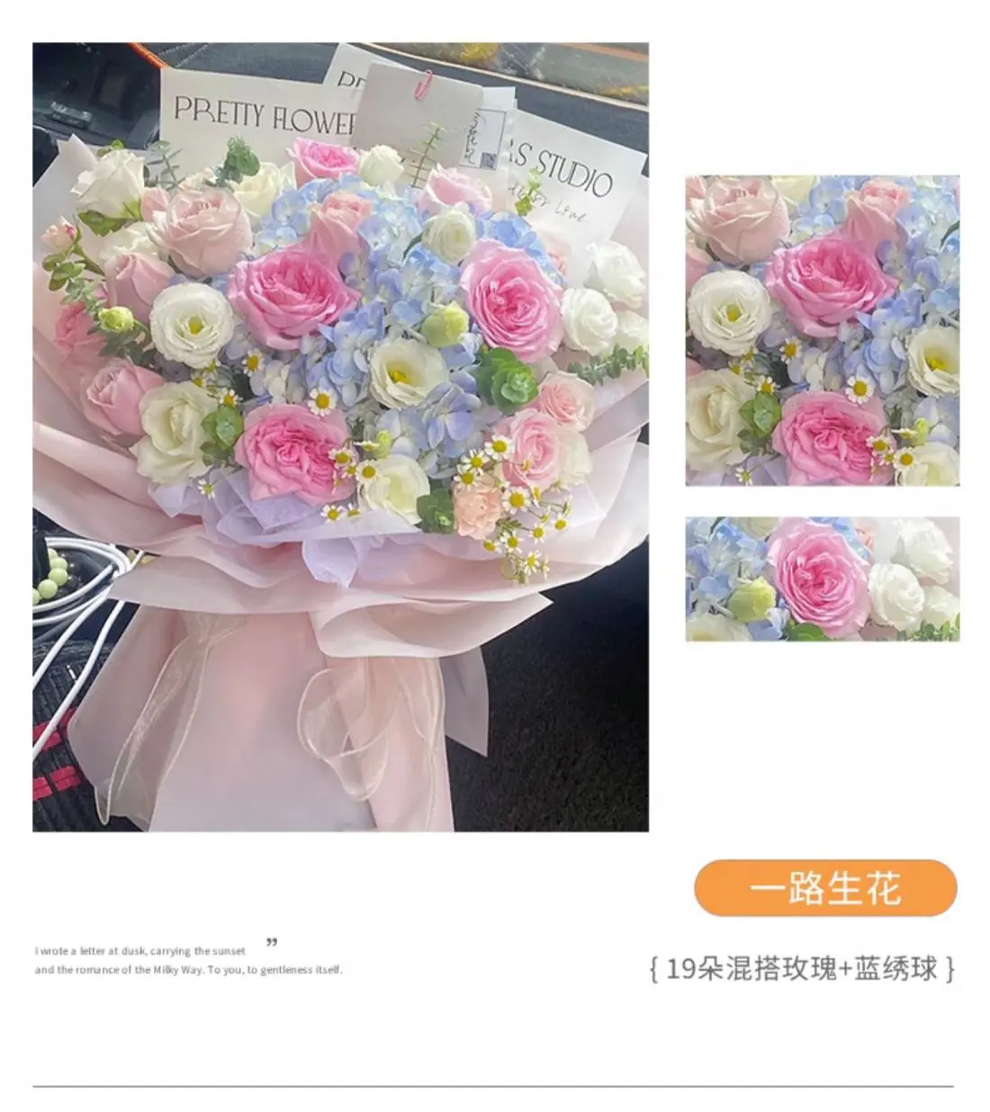 | [flowers all the way] 19 mixed roses + blue hydrangea(【一路生花】19朵混搭玫瑰+蓝绣球) | USD $23.02 | 99999 piece available |