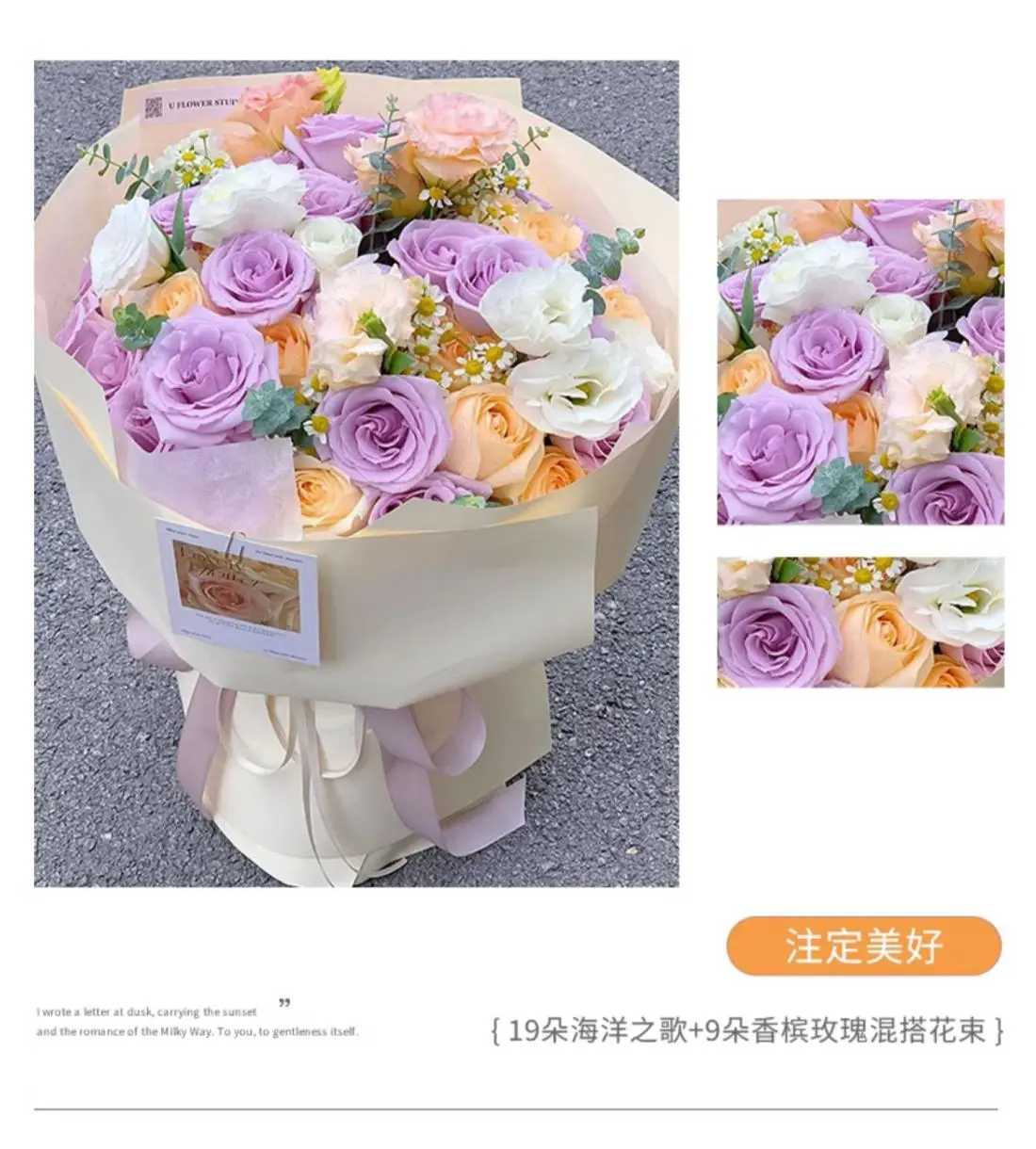 | [destined to be beautiful] 19 ocean songs +9 champagne rose mixed bouquet(【注定美好】19朵海洋之歌+9朵香槟玫瑰混搭花束) | USD $26.15 | 99999 piece available |