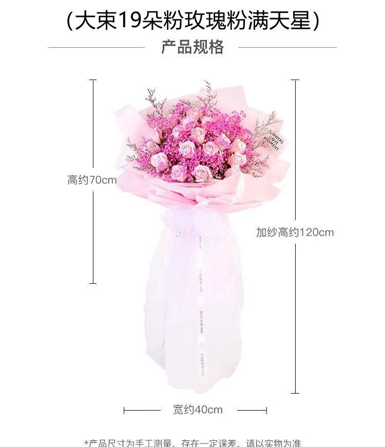 | 19 flowers, pink rose colorful stars, the most beautiful goddess(19朵粉玫瑰彩满天星 最美女神) | USD $13.39 | 99999 piece available |