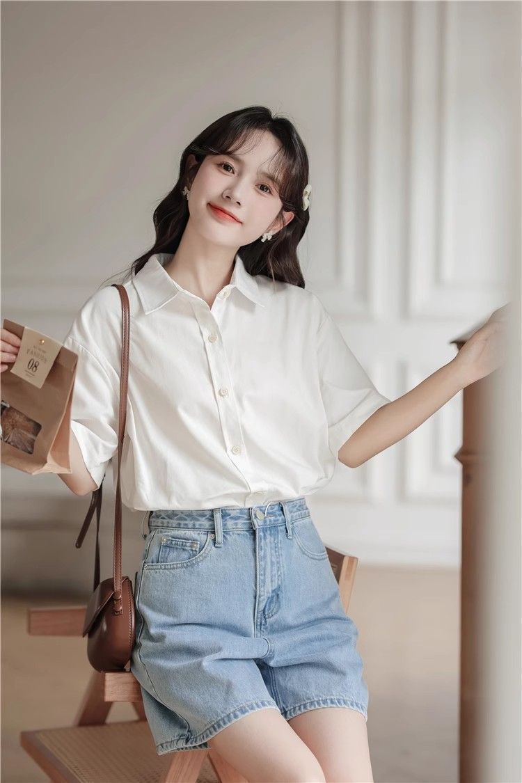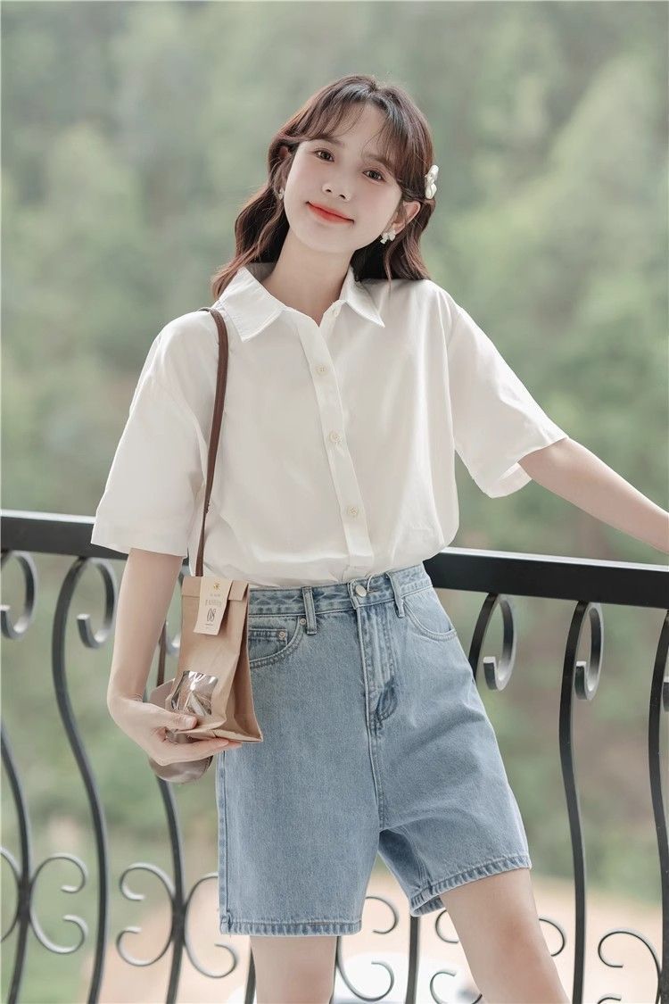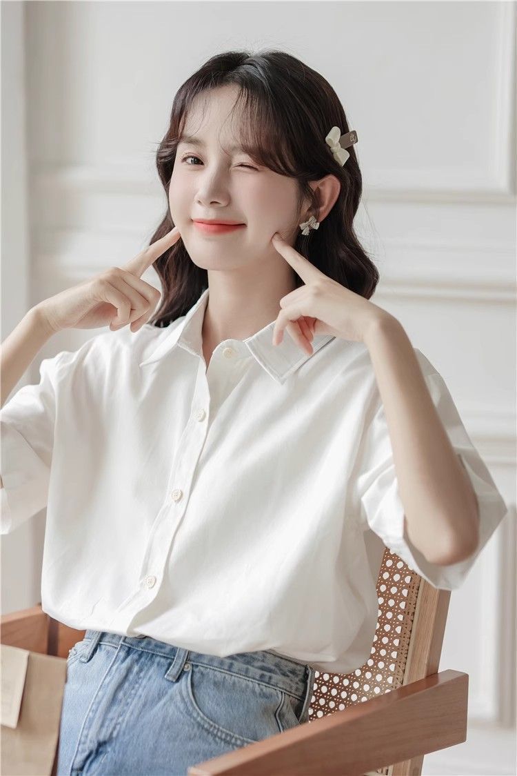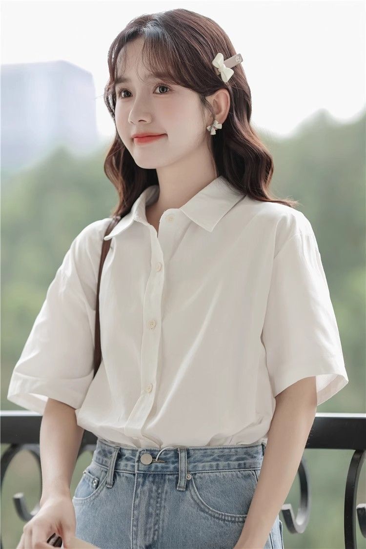 XIXN白色短袖衬衫女夏季2024新款气质显瘦Polo领职业正装百搭上衣