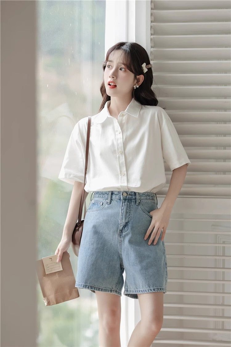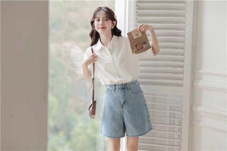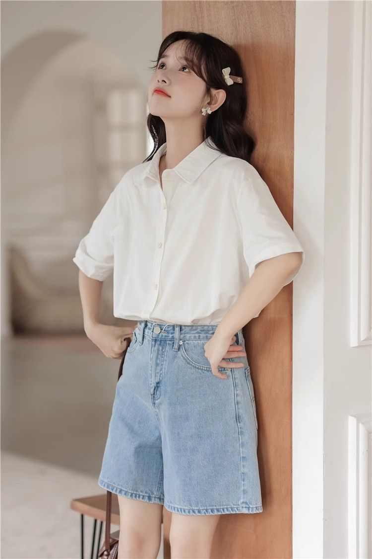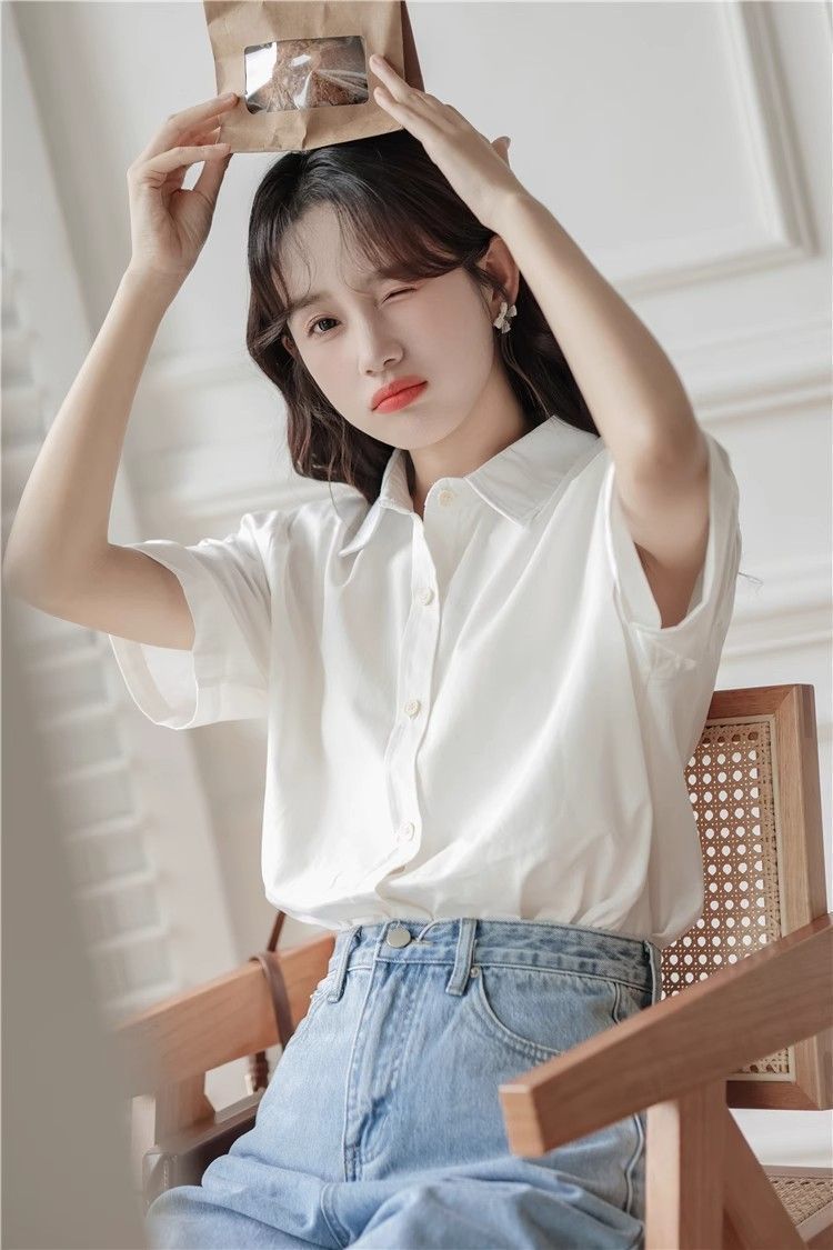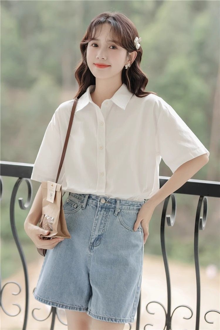 XIXN白色短袖衬衫女夏季2024新款气质显瘦Polo领职业正装百搭上衣