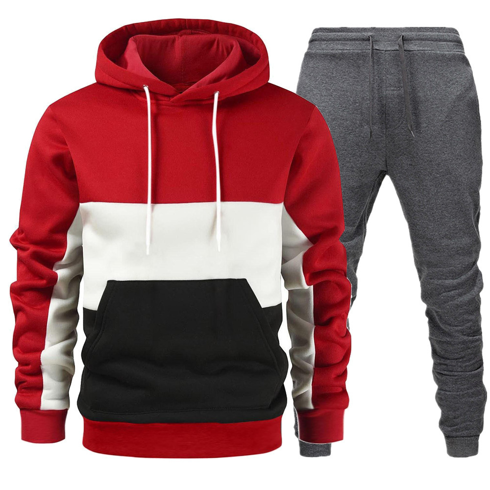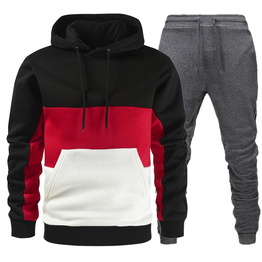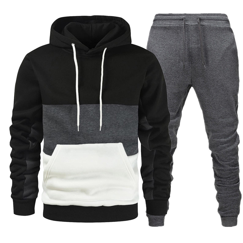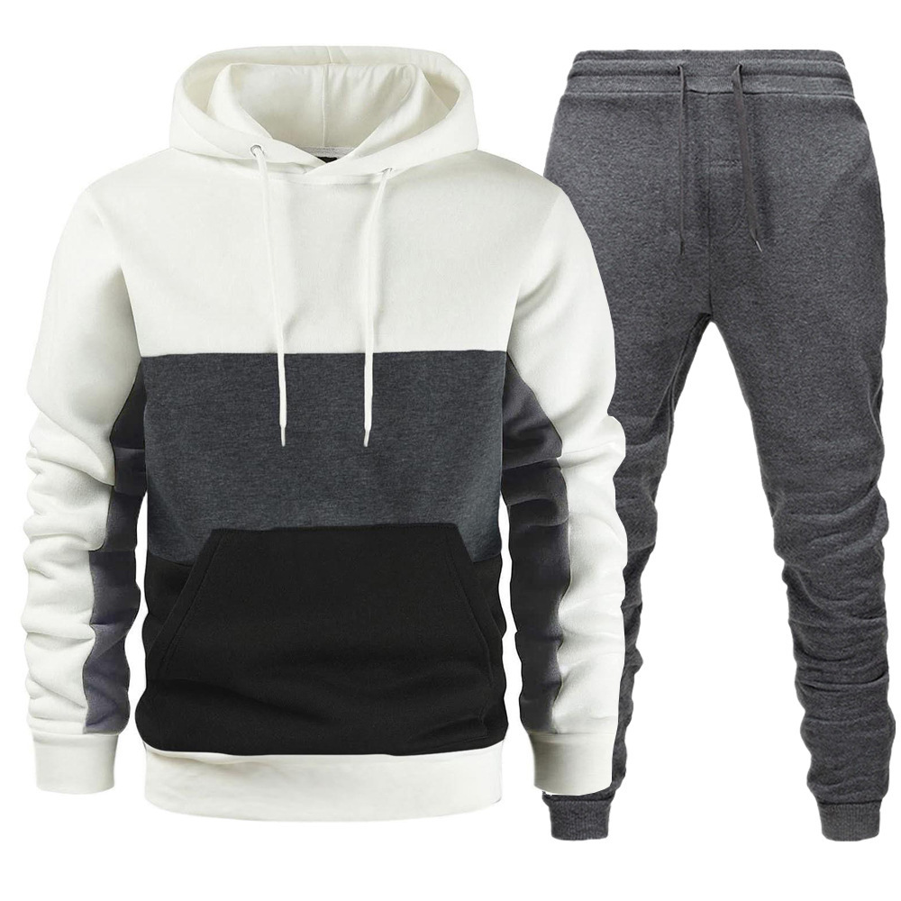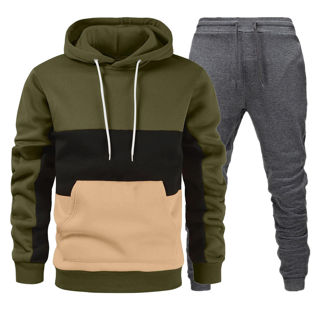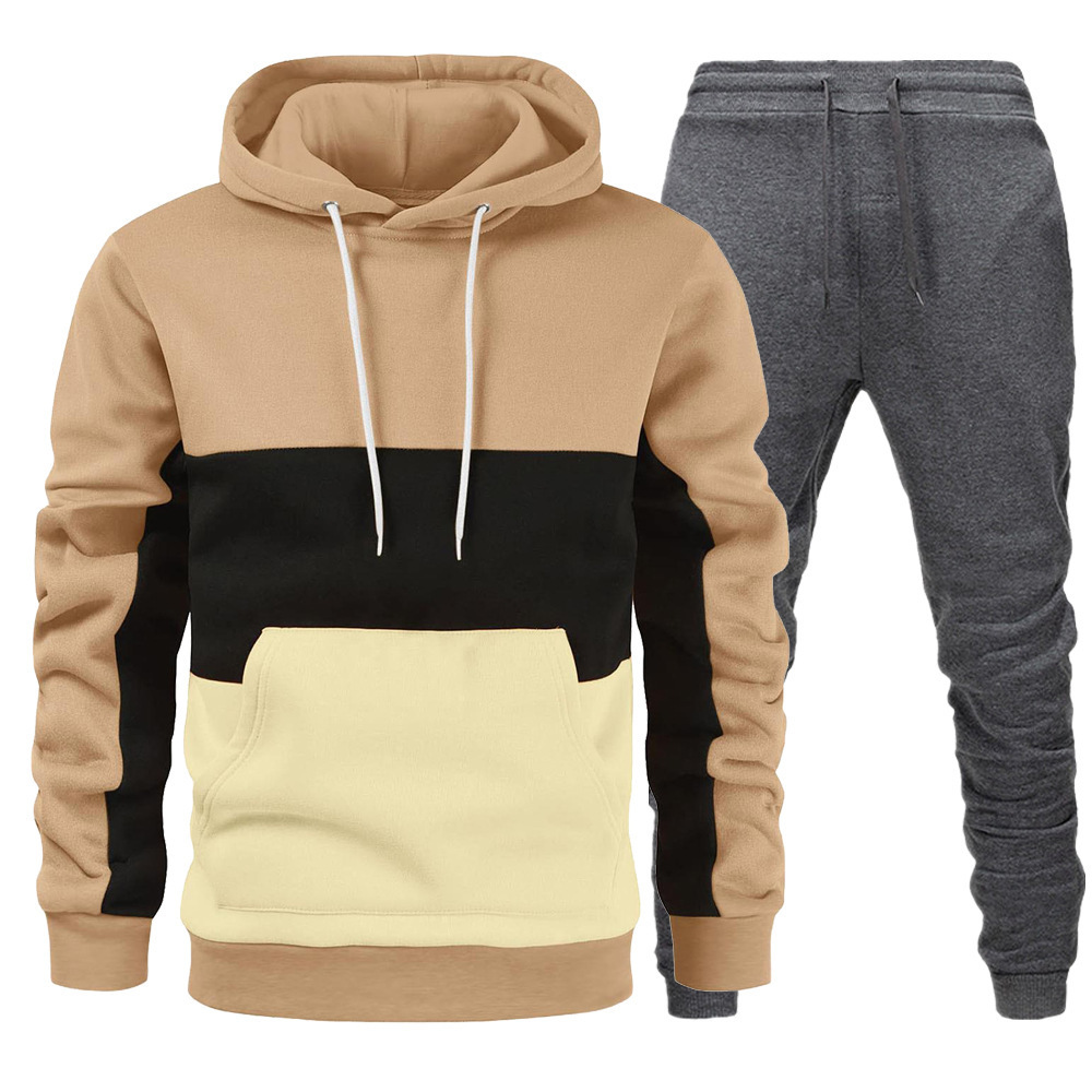 跨境2024秋冬加绒休闲卫衣套装男式拼色连帽衫运动服纯色两件套装