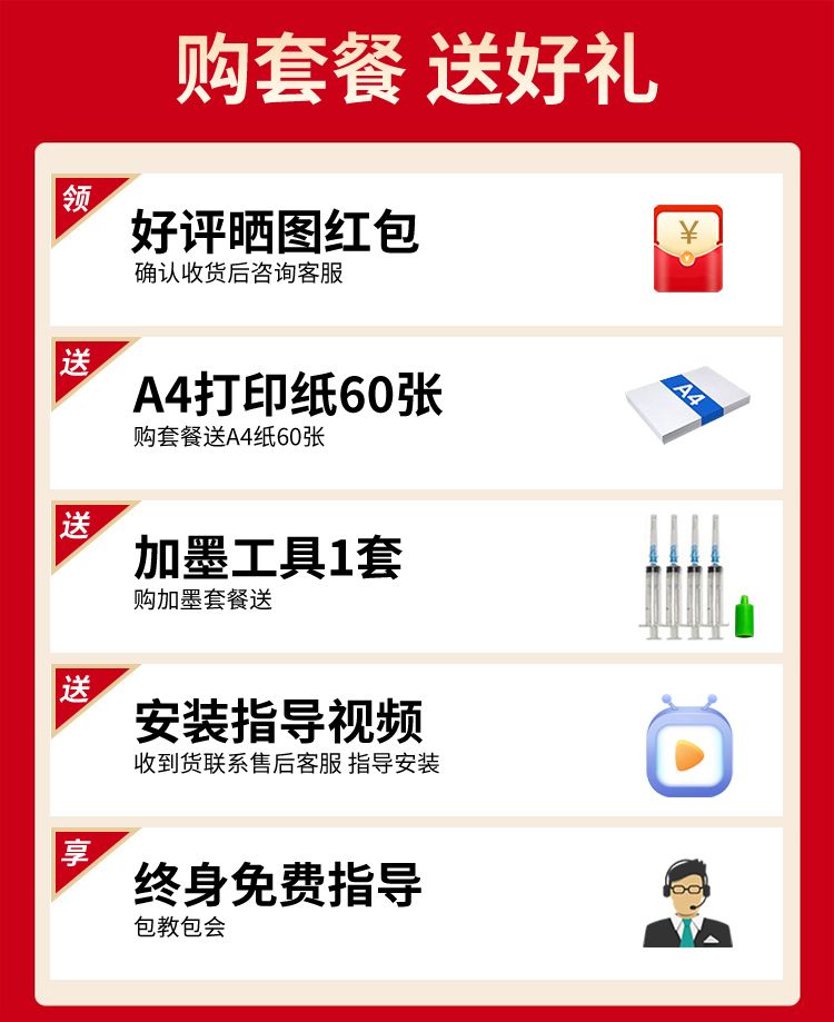 | one set: only black and white printing and 3 bottles of black ink for free(套一:只黑白打印送3瓶黑色墨水) | USD $109.32 | 99999 piece available |