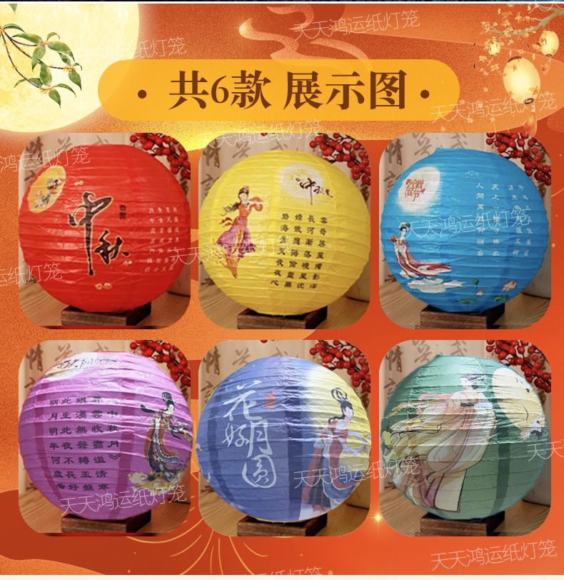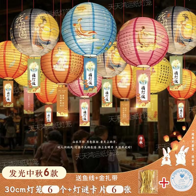 | 6 mixed lanterns +6 lantern puzzles + gold ribbon + fishing line(6款混搭灯笼6个+灯谜6张+金扎带+鱼线) | USD $7.0 | 99999 piece available |