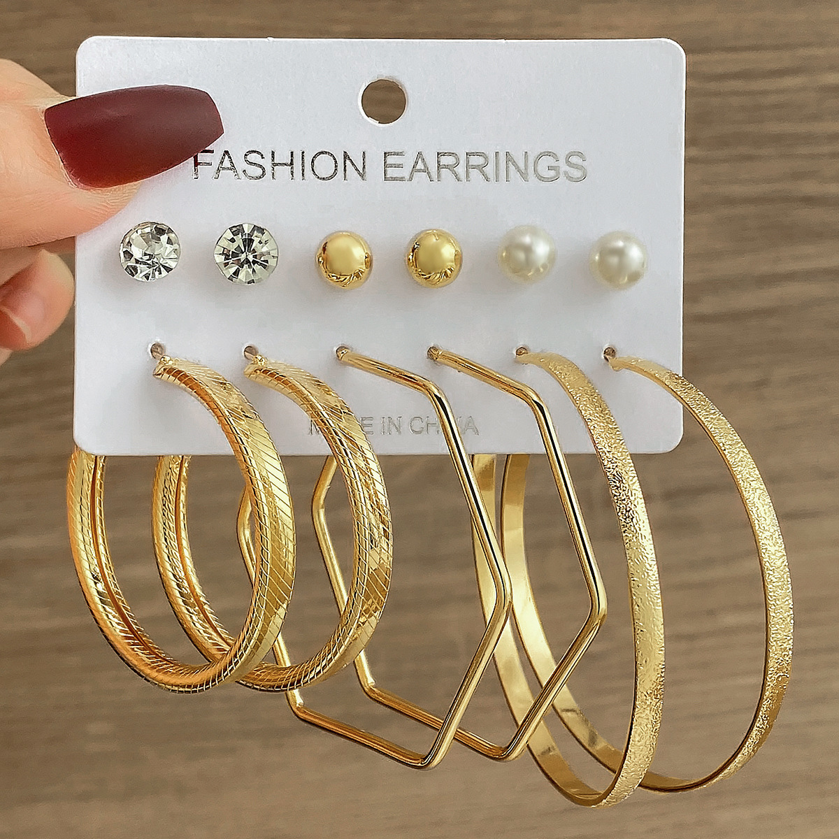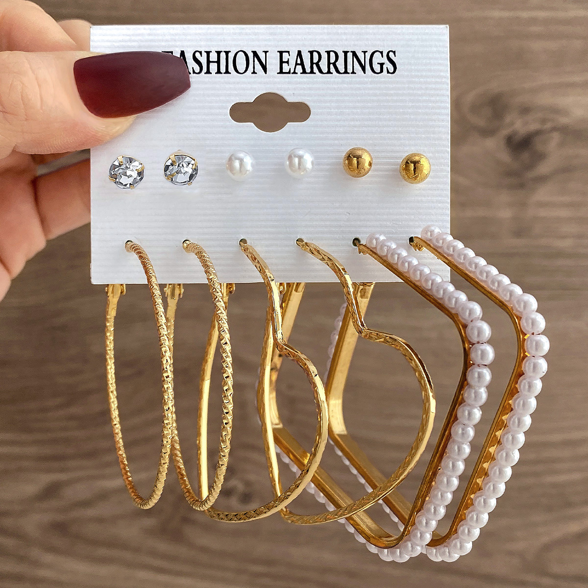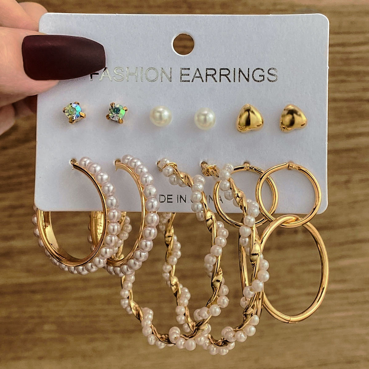 欧美金属七彩米珠耳圈几何形圆形珍珠耳钉复古耳环套装6件套女
