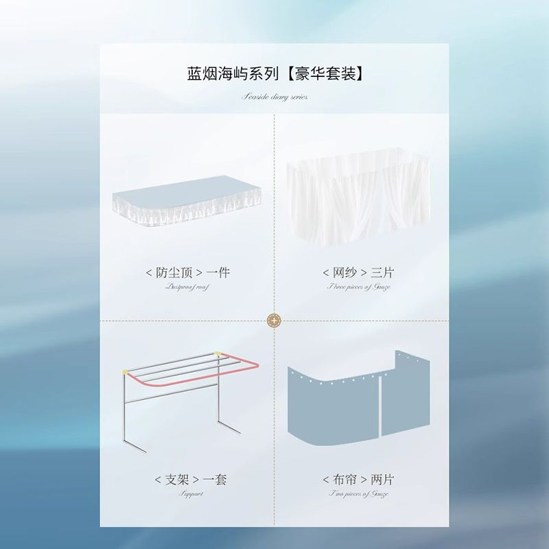 | [blue smoke sea island square type] 2 curtains +3 yarn + top + bracket(【蓝烟海屿方型】2帘+3纱+顶+支架) | USD $51.0 | 99999 piece available |