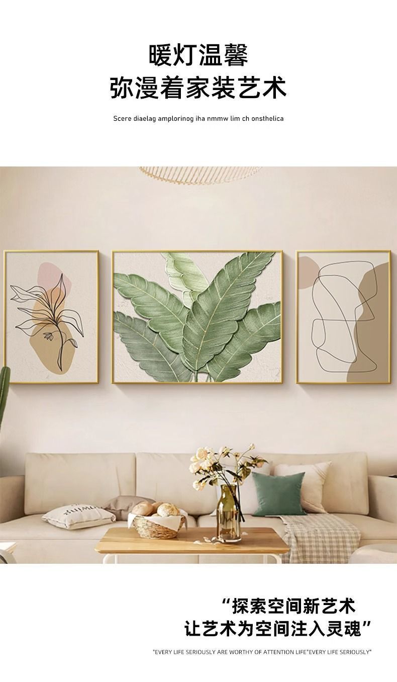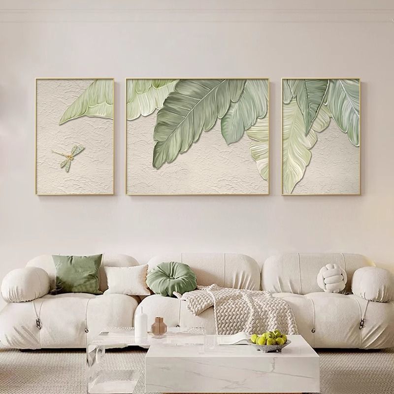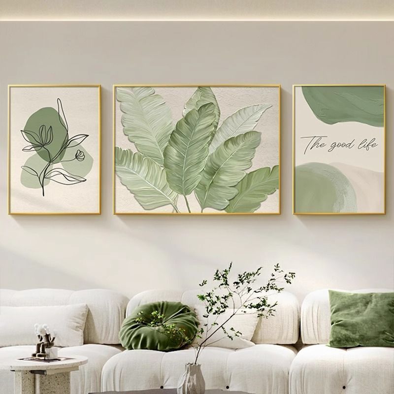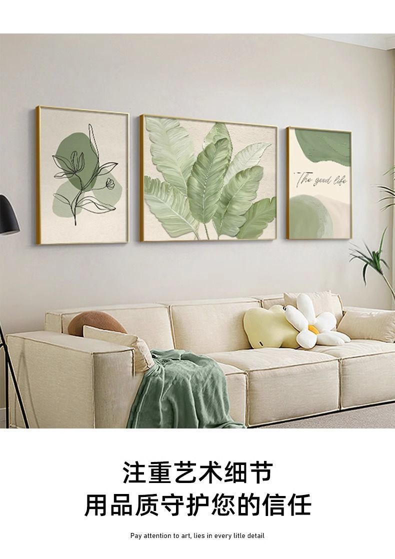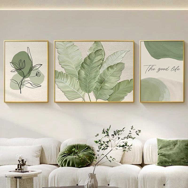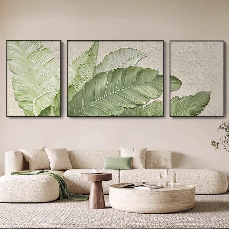 家大业大装饰画绿植沙发客厅壁画奶油风肌理感三联挂画绿叶装饰画