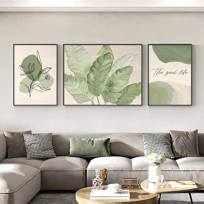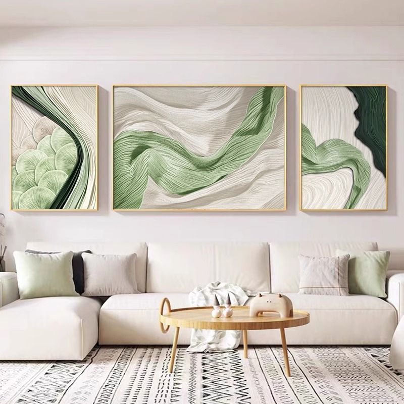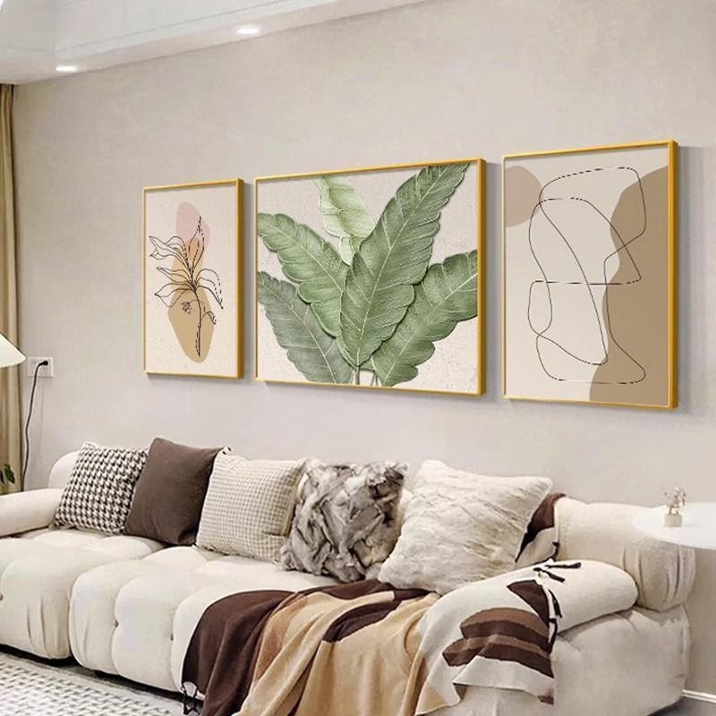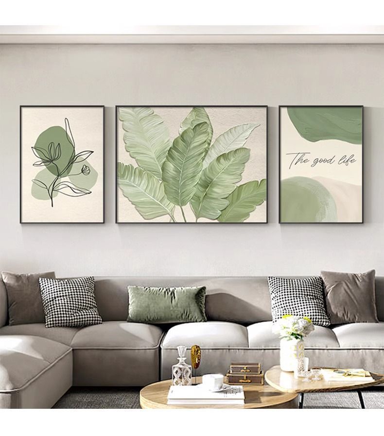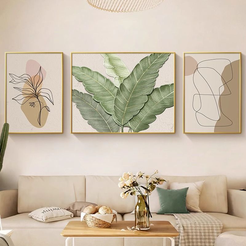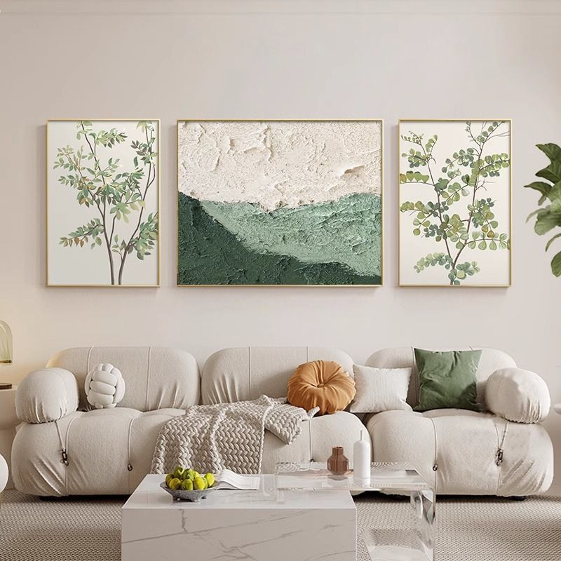 家大业大装饰画绿植沙发客厅壁画奶油风肌理感三联挂画绿叶装饰画