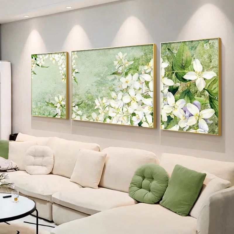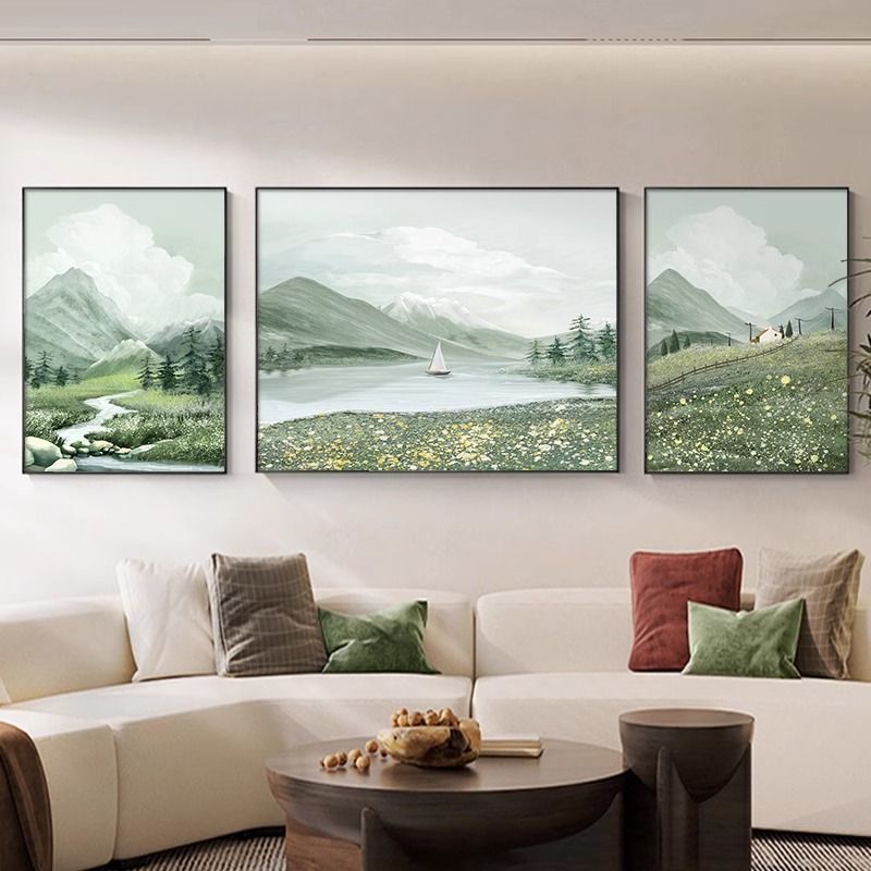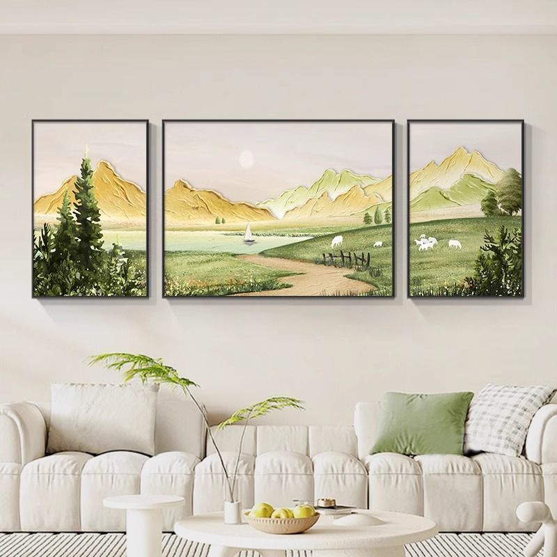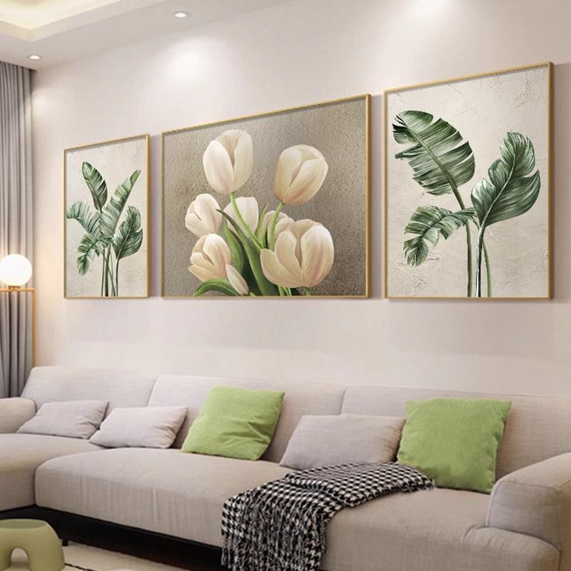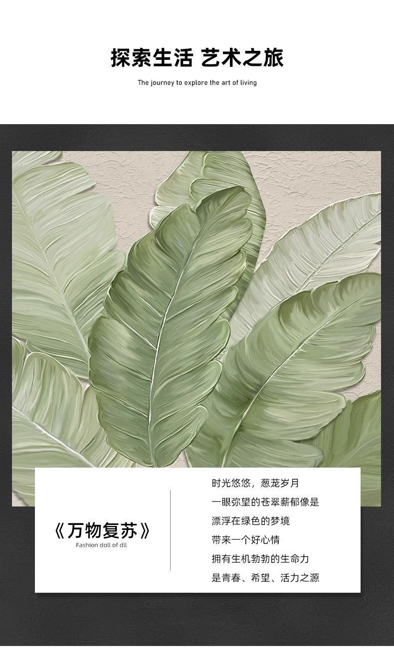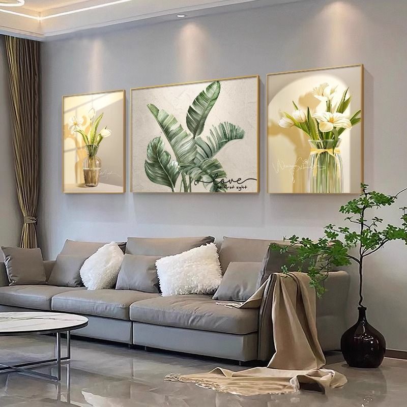 家大业大装饰画绿植沙发客厅壁画奶油风肌理感三联挂画绿叶装饰画